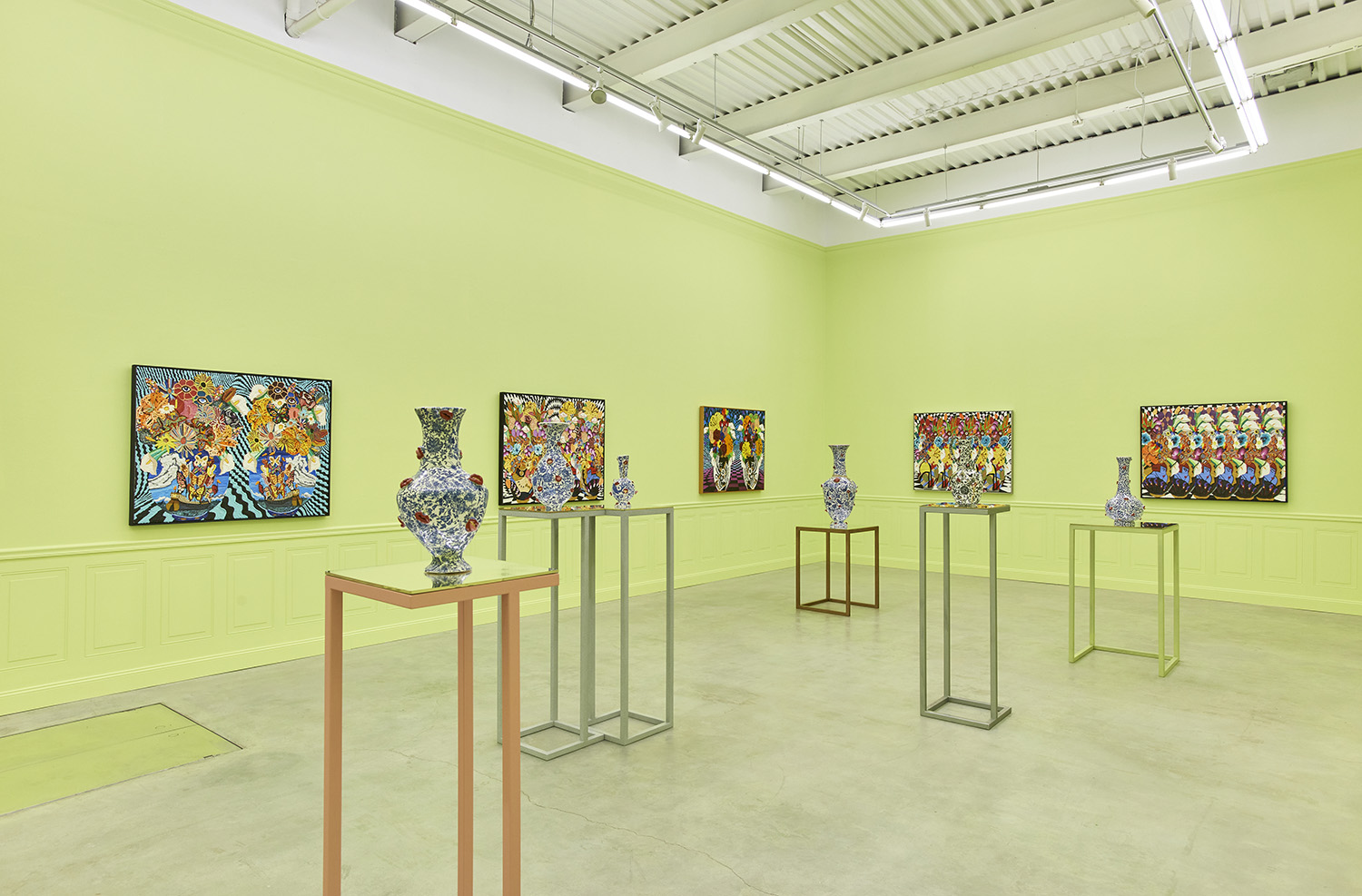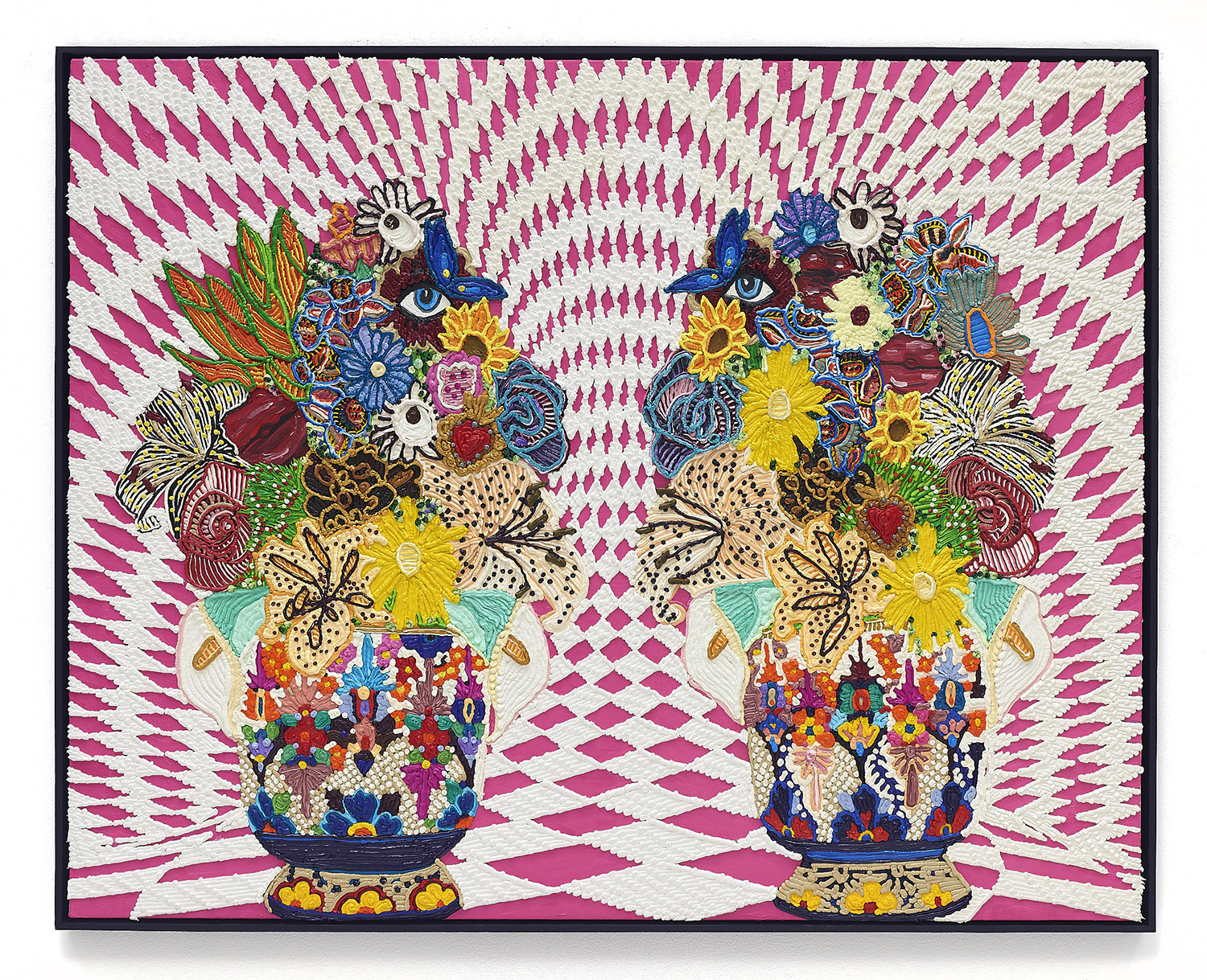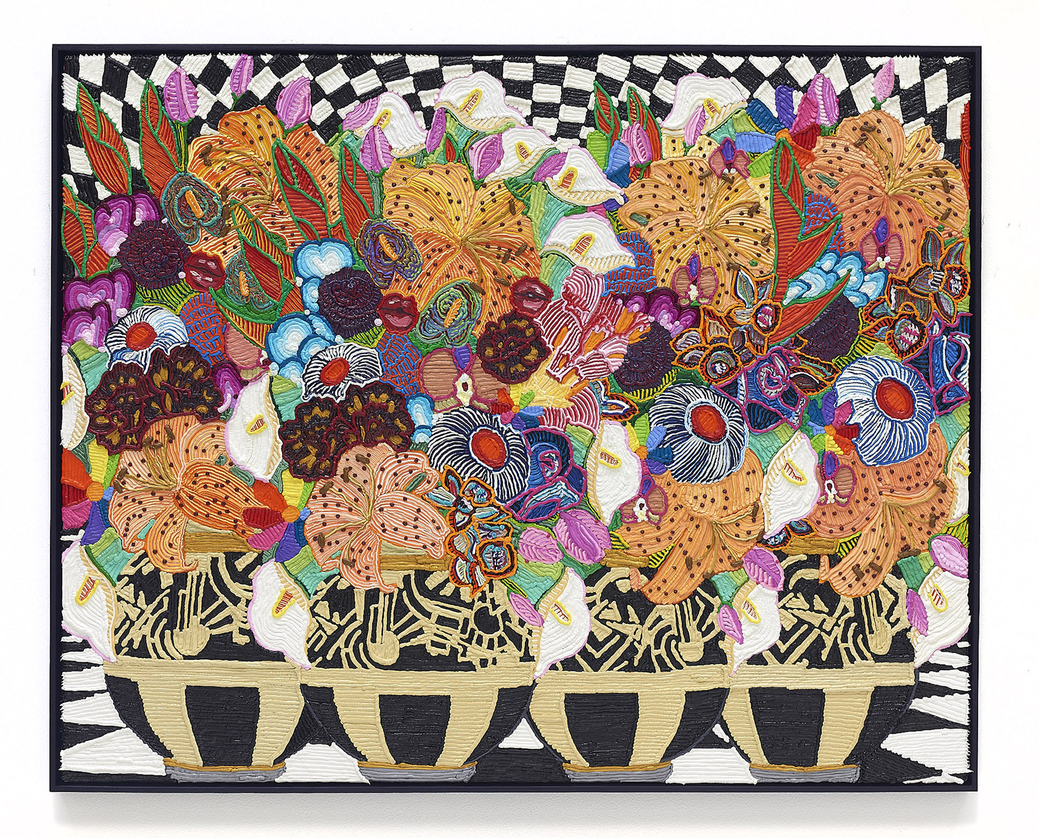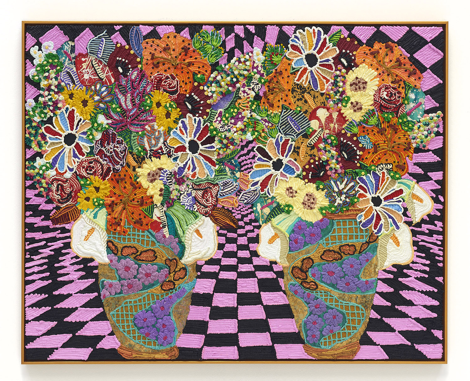 Caroline Larsen expands upon her Longwy Art Deco vase series debuted here two years ago in Kaleidoscopic (2019) with proliferating vases and flowers. Most works feature not-quite-mirror images of two vases of flowers, like the above, where a psychedelic op background further warps your perception of near-symmetry. In other works the vases start repeating even further; four, five, six vases proliferate across the panel making your eyes spin out. Not all vases in this show are from Longwy designs: Talavera pottery from Mexico, Carlton Ware and Imari Ware are included—and in one painting Caroline paints Roxanne Jackson’s vases into the painting.