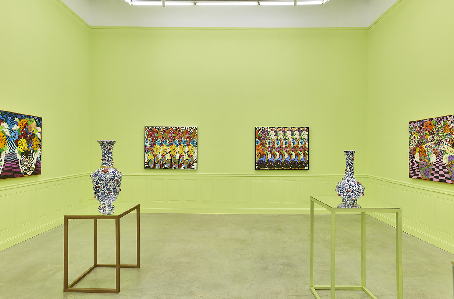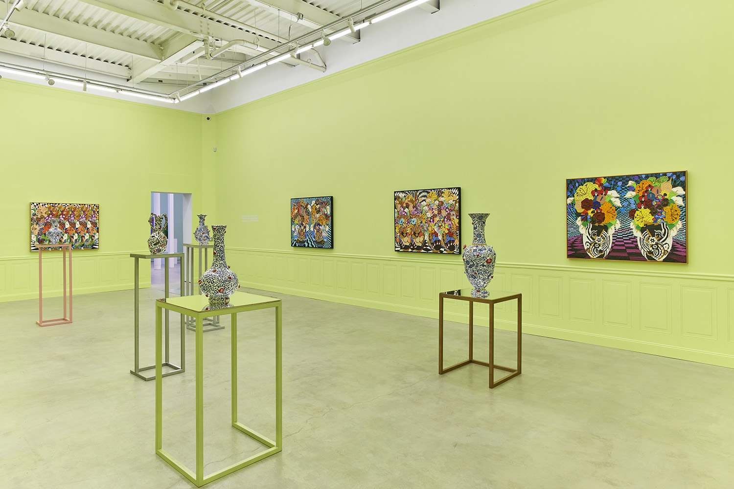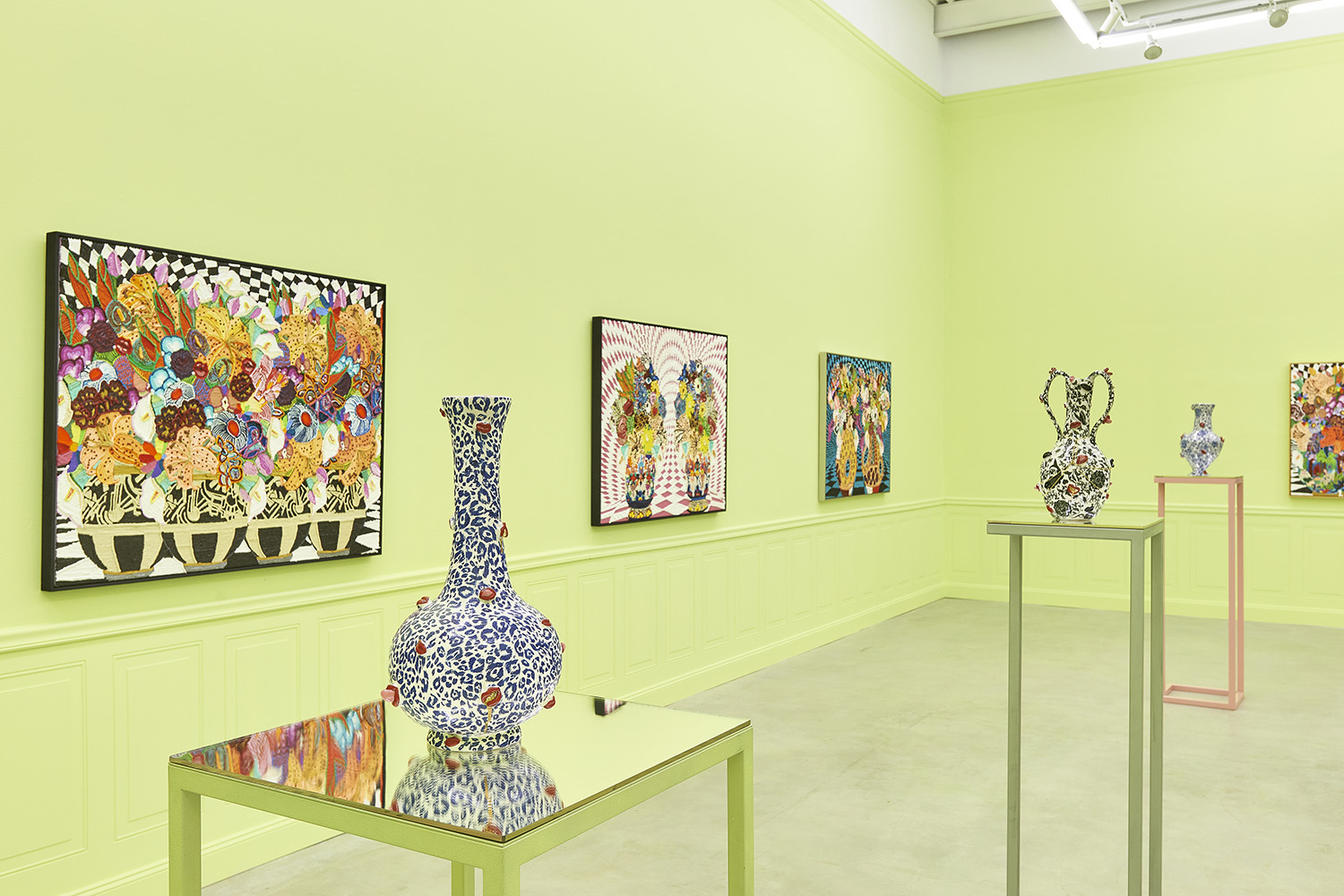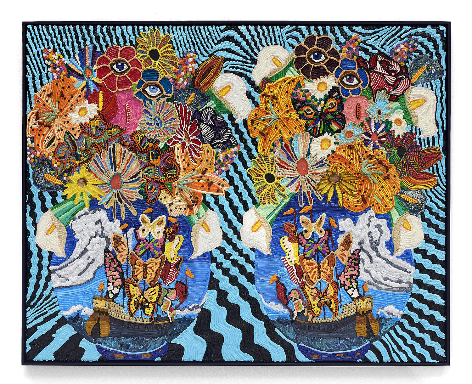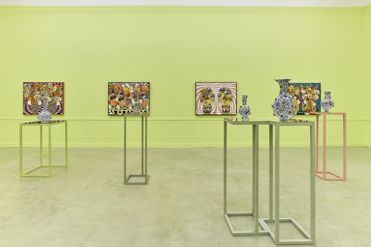 Caroline Larsen expands upon her Longwy Art Deco vase series debuted here two years ago in Kaleidoscopic (2019) with proliferating vases and flowers. Most works feature not-quite-mirror images of two vases of flowers, like the above, where a psychedelic op background further warps your perception of near-symmetry. In other works the vases start repeating even further; four, five, six vases proliferate across the panel making your eyes spin out. Not all vases in this show are from Longwy designs: Talavera pottery from Mexico, Carlton Ware and Imari Ware are included—and in one painting Caroline paints Roxanne Jackson’s vases into the painting.
