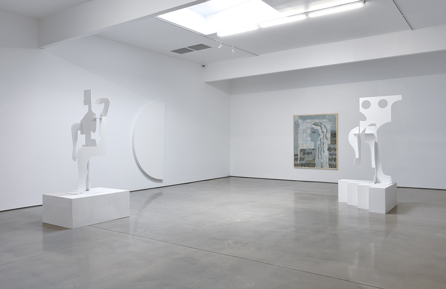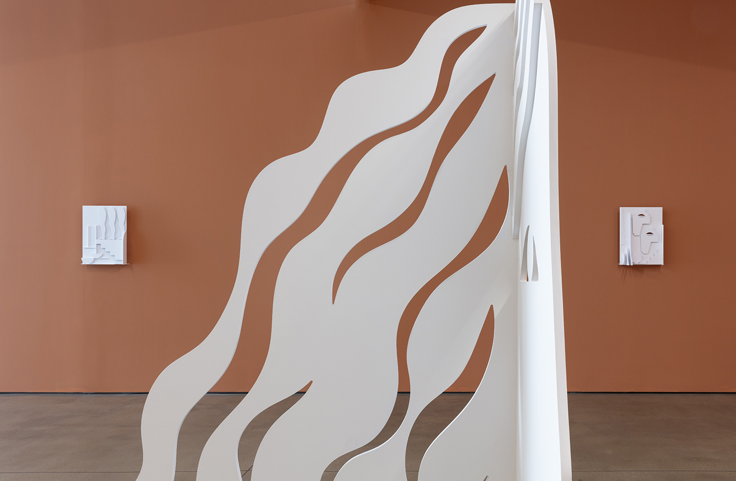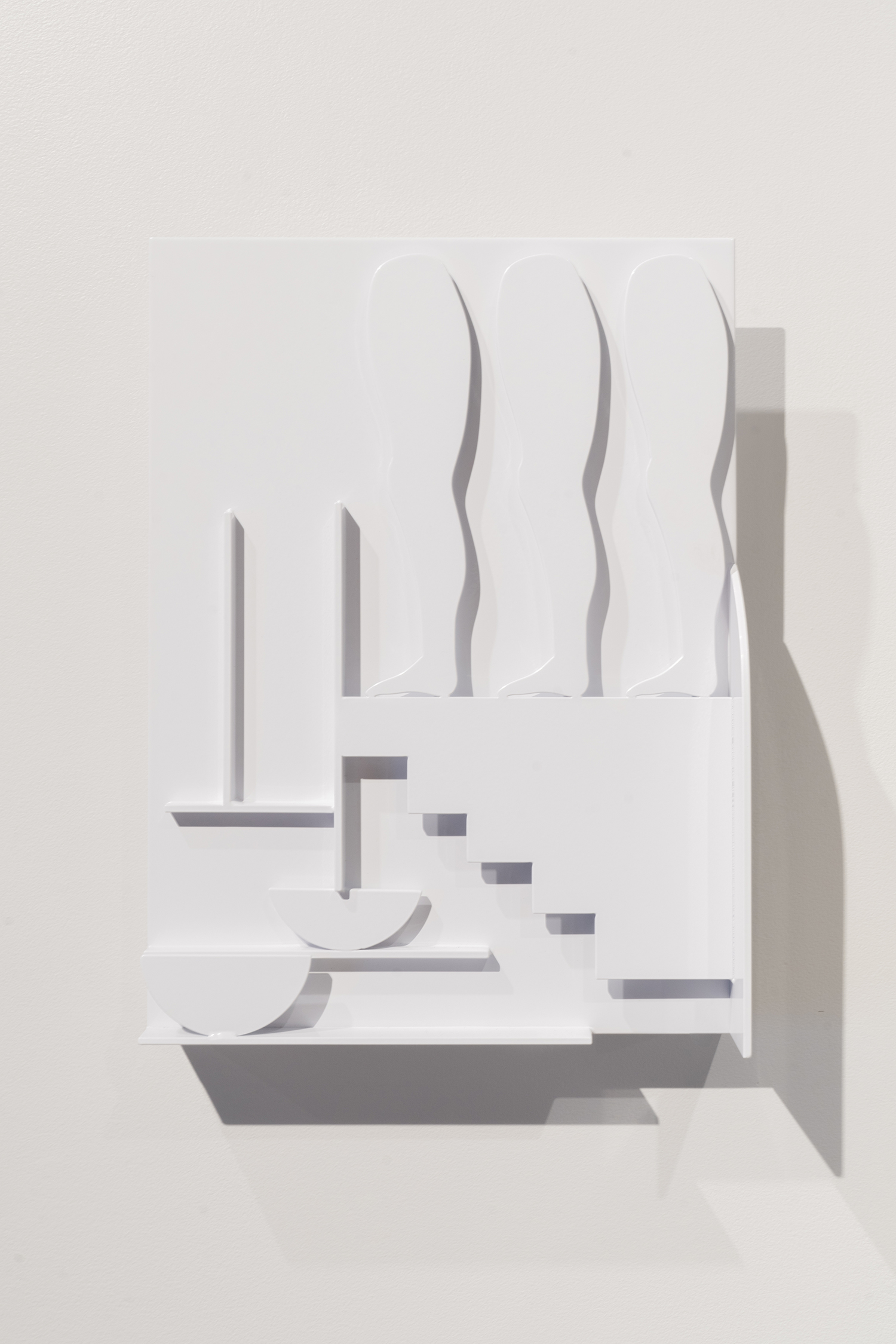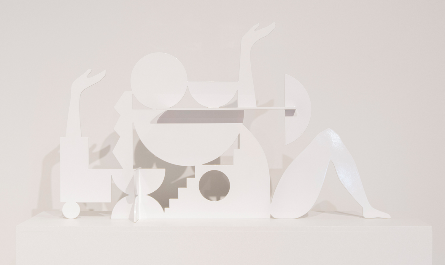Many of the works begin as hand-drawn sketches or foam-core maquettes, then move through digital 3D renderings before being realized in aluminum and wood. Even with the use of industrial processes, the final objects retain a hand-wrought feel—unpolished edges, highlighted wood grain, and an intuitive sense of balance. Though she often uses color on surrounding walls and pedestals, Salas uses bright white frequently for her sculptures—not as purity, but as obliteration. That palette decision adds to the show’s tonal complexity: Night Vision is less about literal darkness and more about the night as psychic space, dream logic, subconscious navigation.
