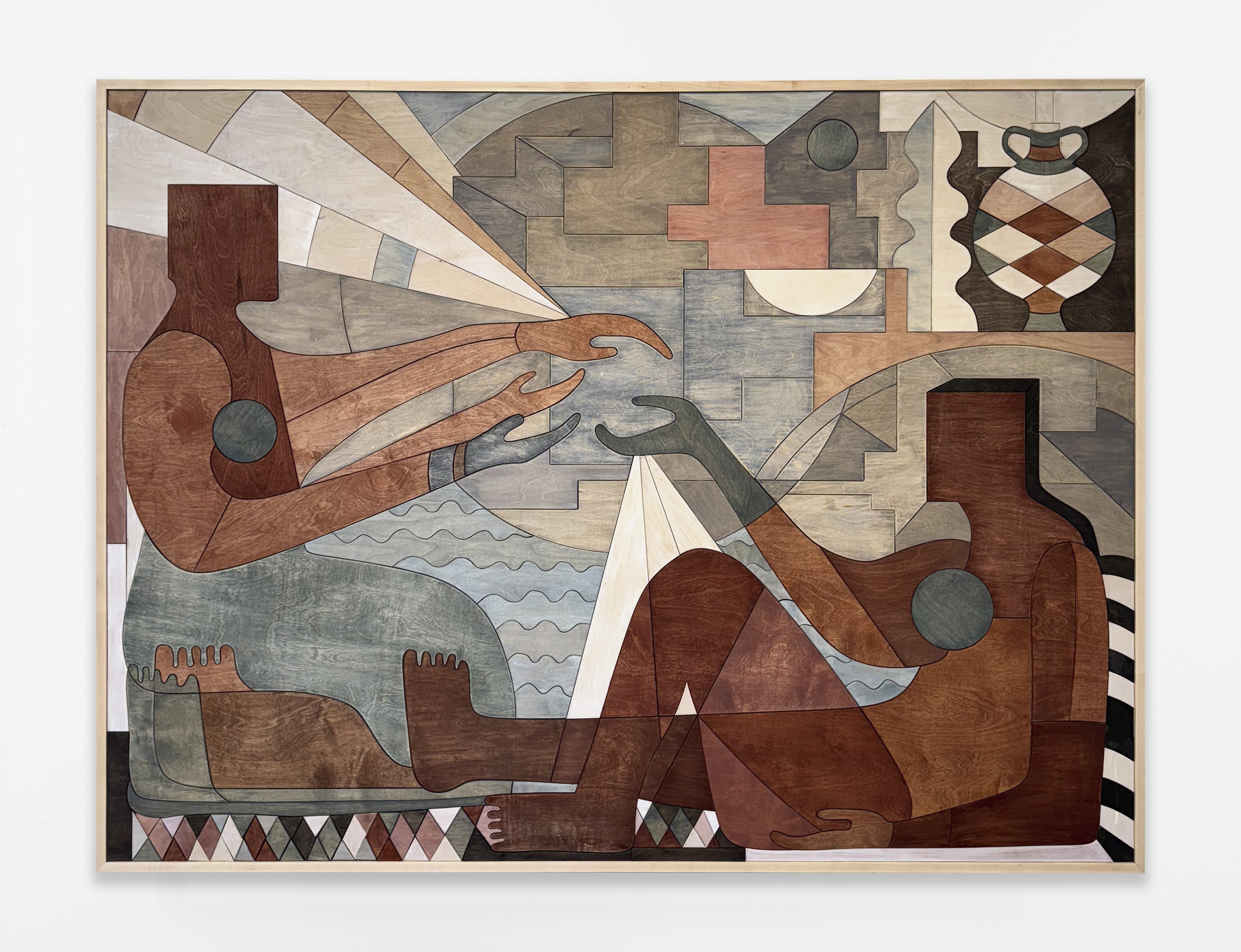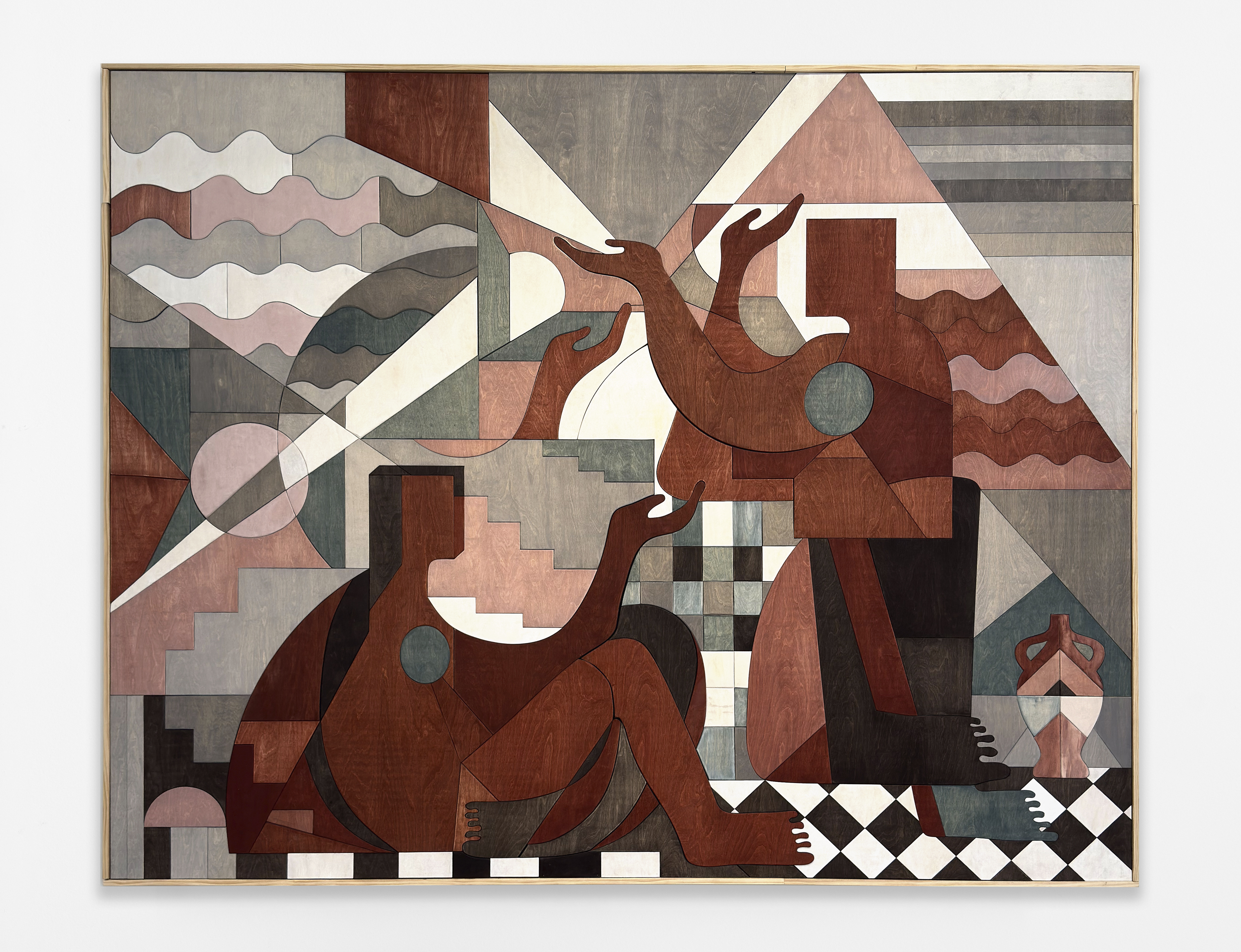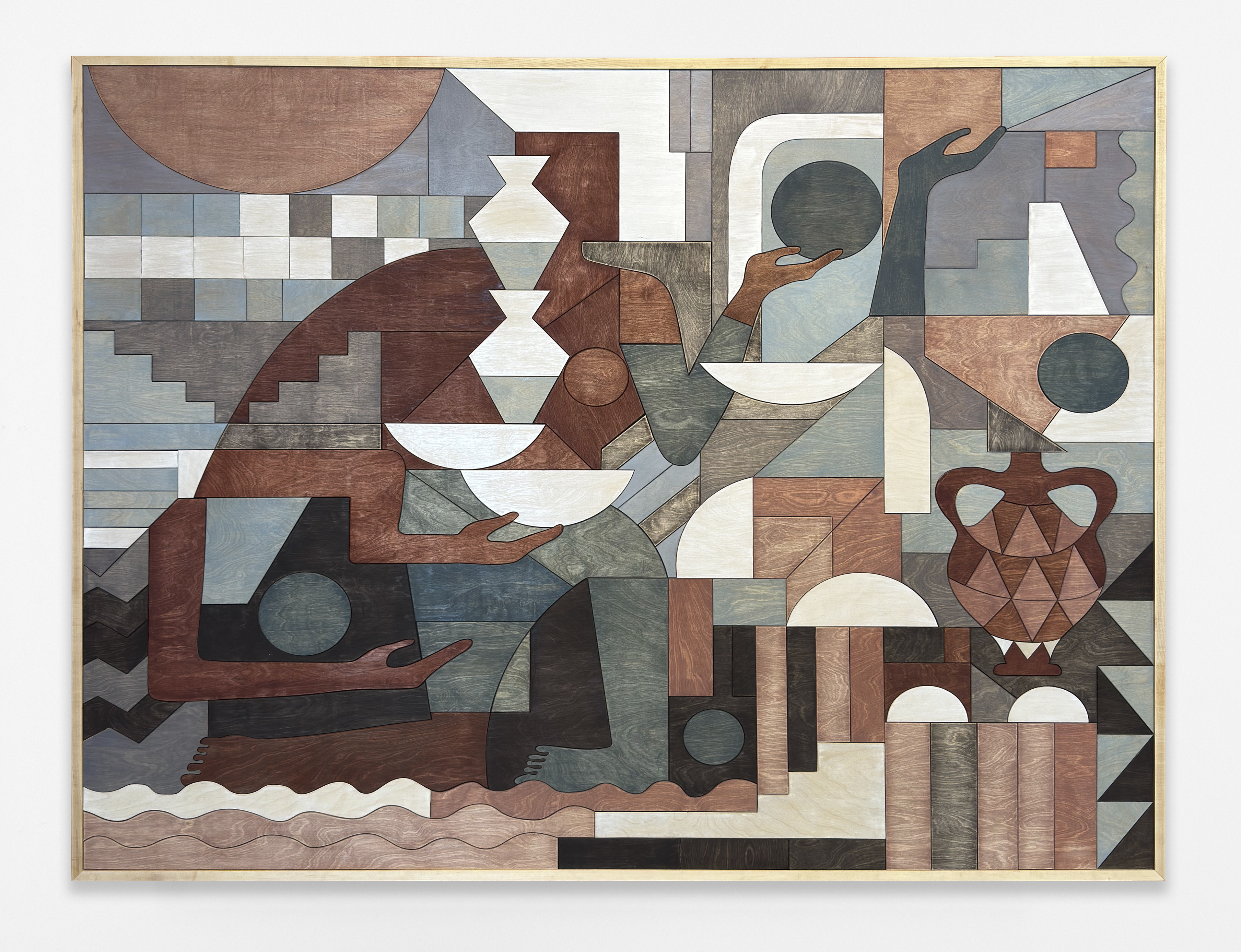 Carolyn Salas, The Seekers No. 3, 2025, stained wood, maple frame, 74 x 98 x 3.5 inches, 188 x 249 x 9 cm.