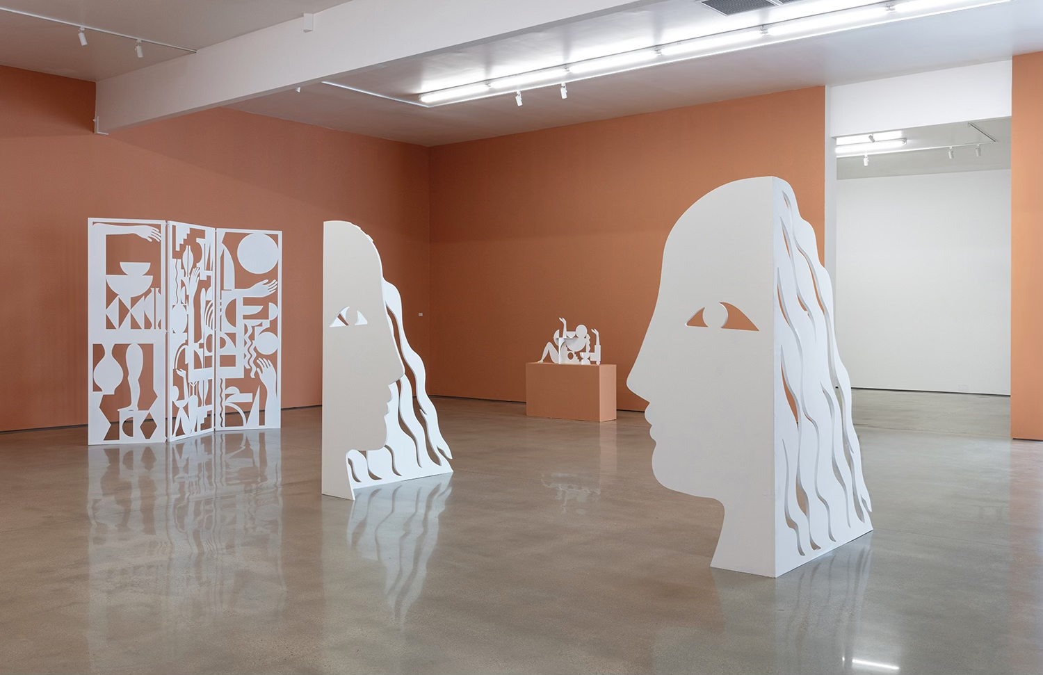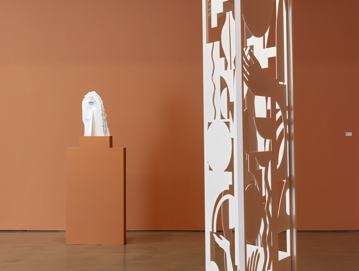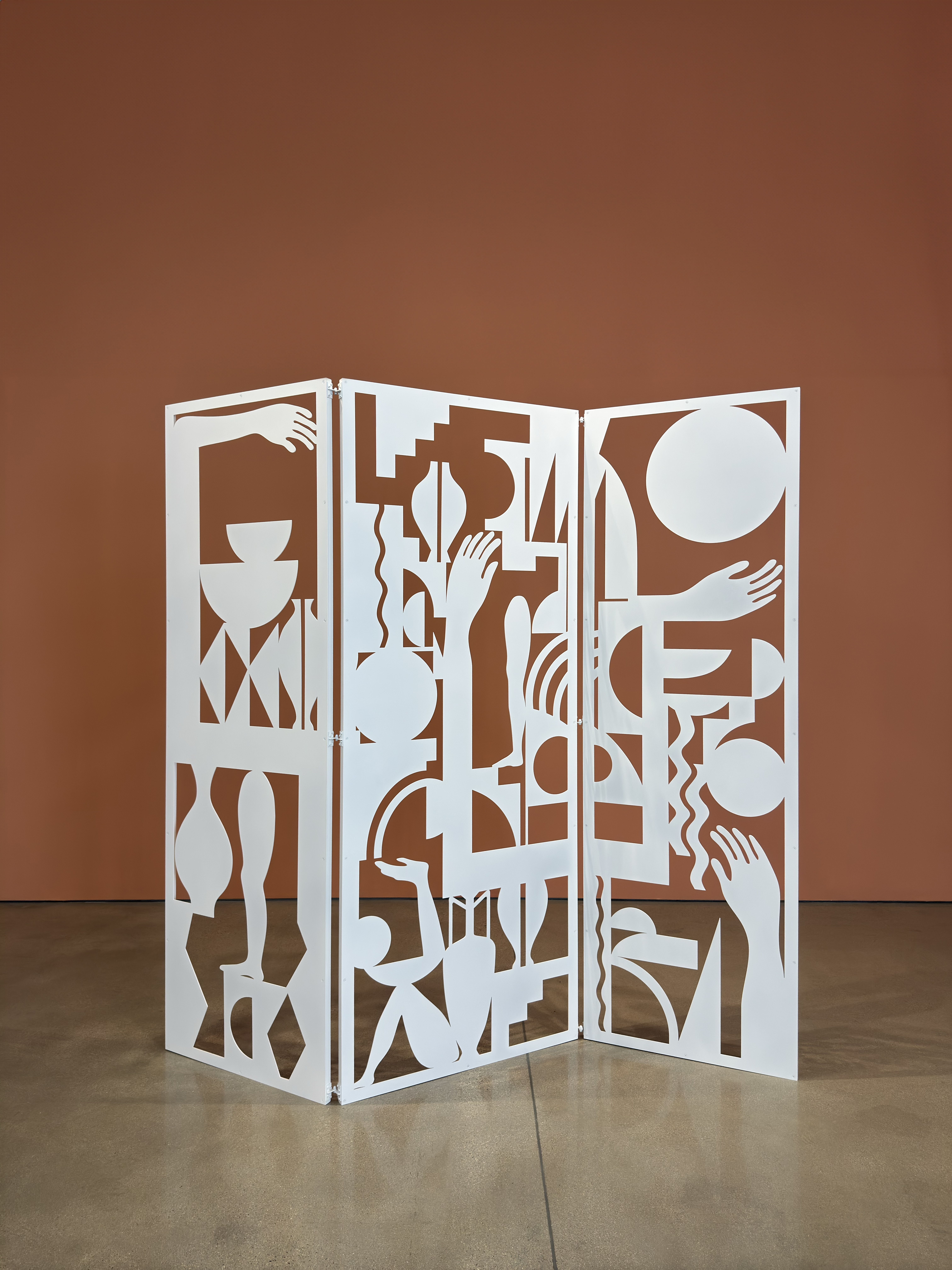 New to this iteration are Salas’ stained maple wood inlay works: luminous compositions made from interlocking, cut wood shapes that evoke bodies, vessels, celestial symbols. There’s something sacred in their geometry, like spiritual diagrams or coded icons from an ancient system. The color pulls out the wood’s natural grain, while the smooth contours feel both handcrafted and futuristic. Unlike the screens and cutouts she has been known for, these new works can’t help but offer a sense of completeness, like the satisfaction of completing a puzzle. With the hundreds of small wood components coming together, filling her usual negative space, these works pursue fulfillment.