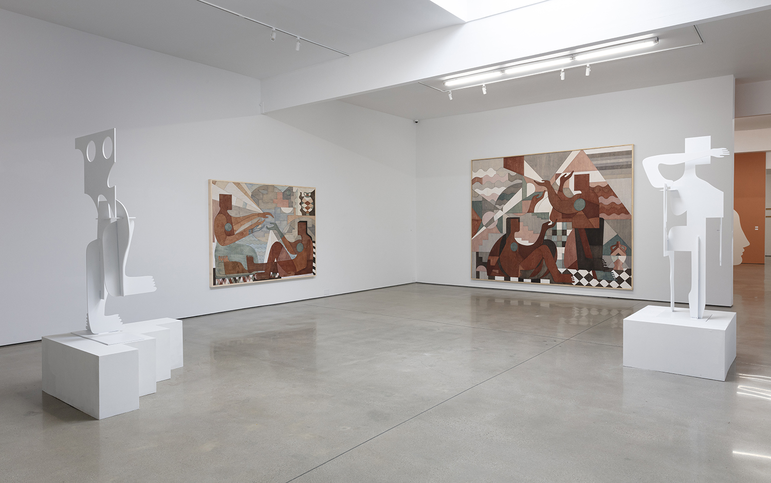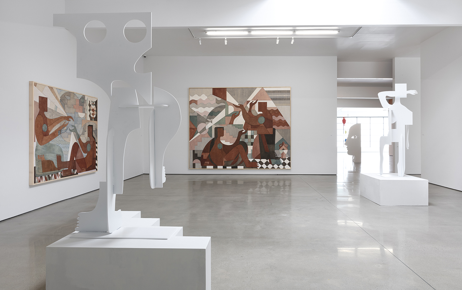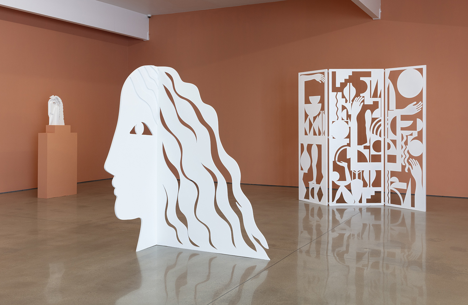 New to this iteration are Salas’ stained maple wood inlay works: luminous compositions made from interlocking, cut wood shapes that evoke bodies, vessels, celestial symbols. There’s something sacred in their geometry, like spiritual diagrams or coded icons from an ancient system. The color pulls out the wood’s natural grain, while the smooth contours feel both handcrafted and futuristic. Unlike the screens and cutouts she has been known for, these new works can’t help but offer a sense of completeness, like the satisfaction of completing a puzzle. With the hundreds of small wood components coming together, filling her usual negative space, these works pursue fulfillment.