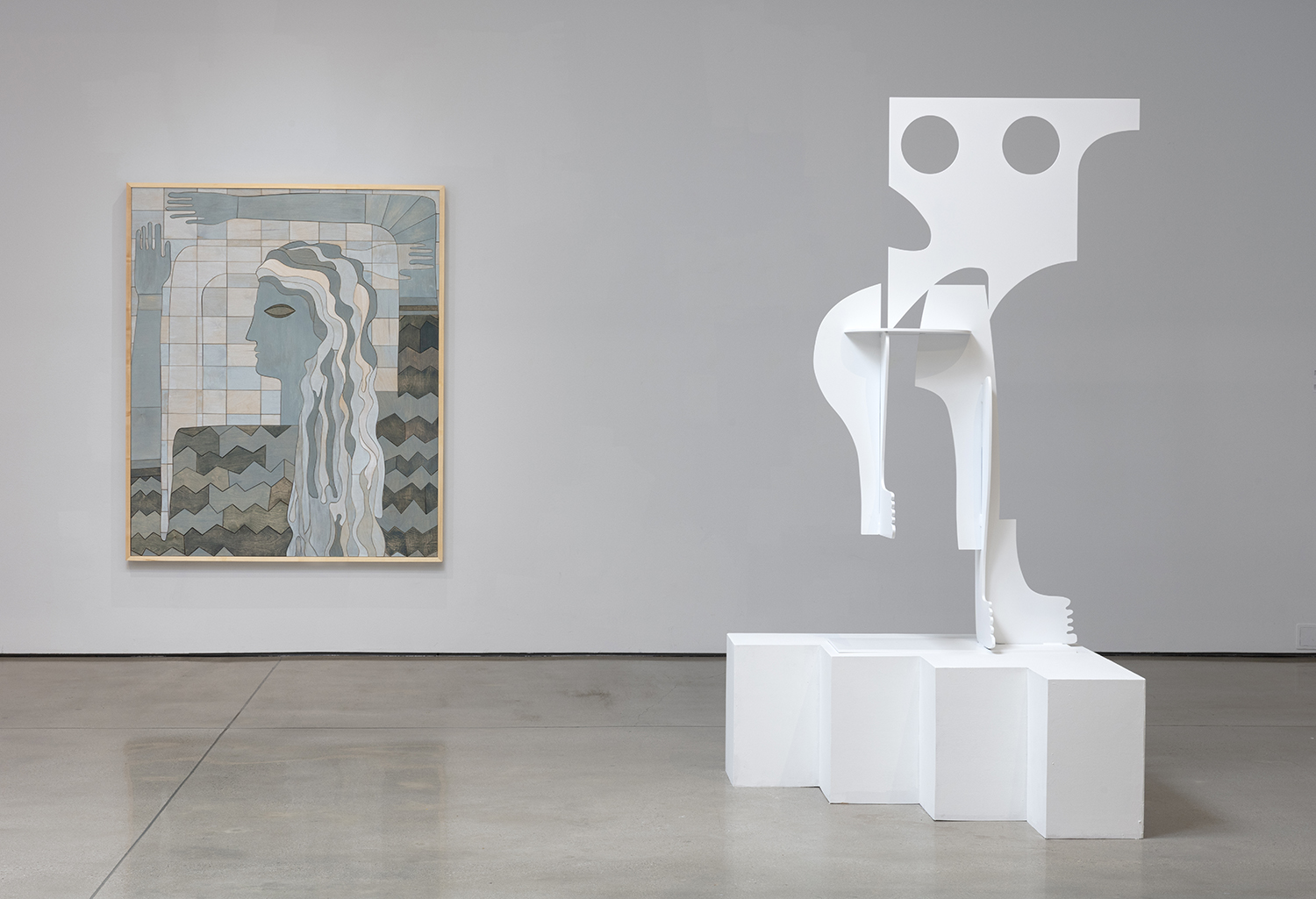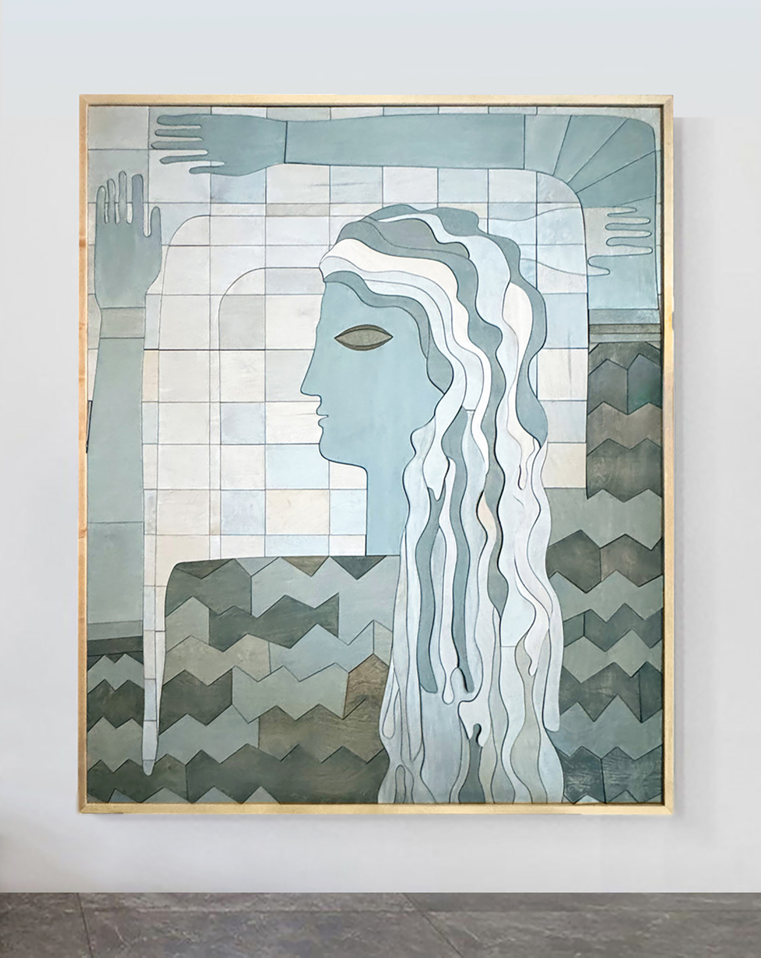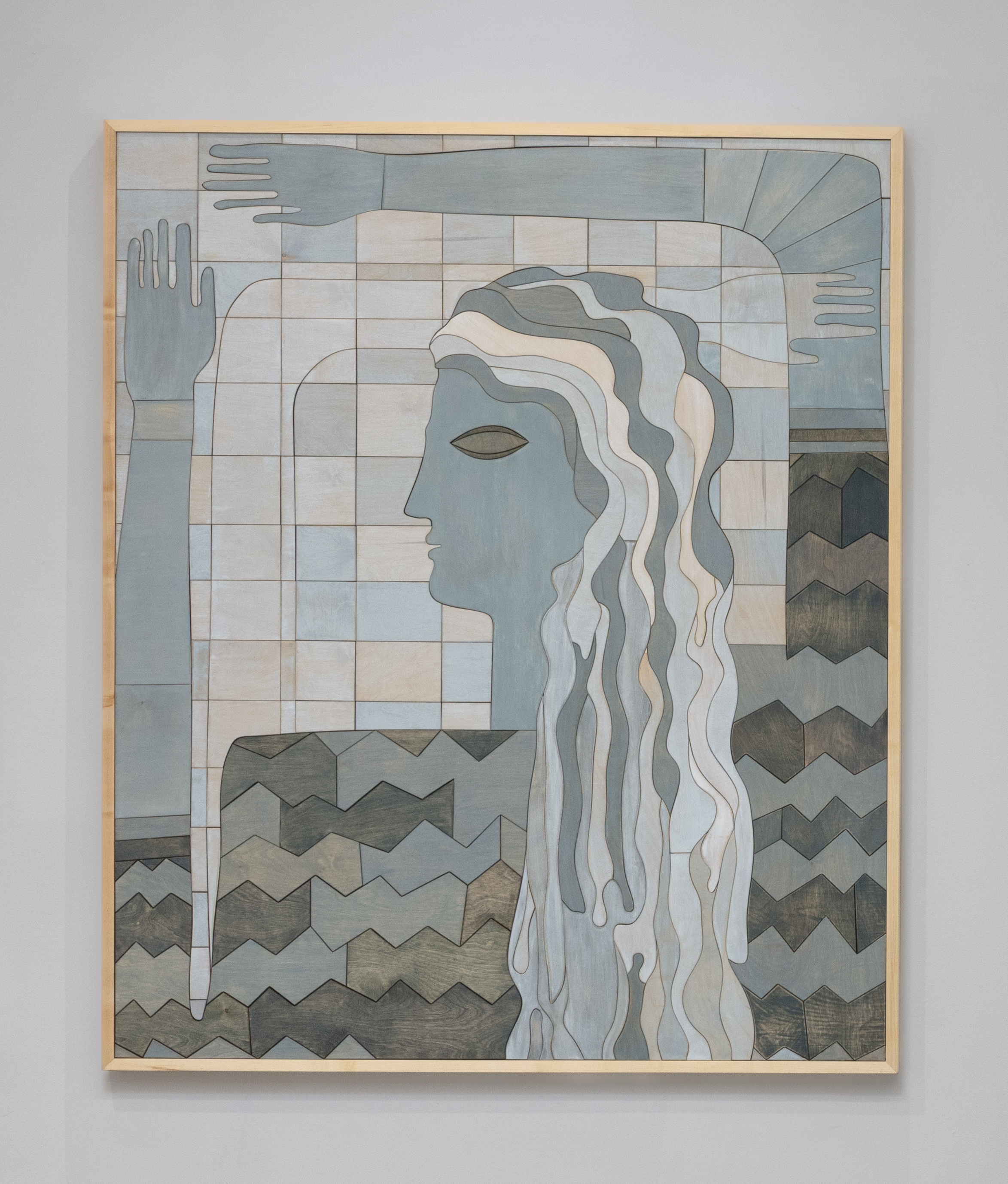 Carolyn Salas, The Blue Lady, 2025, stained wood, maple frame, 74 x 62 inches, 188 x 157 cm.
