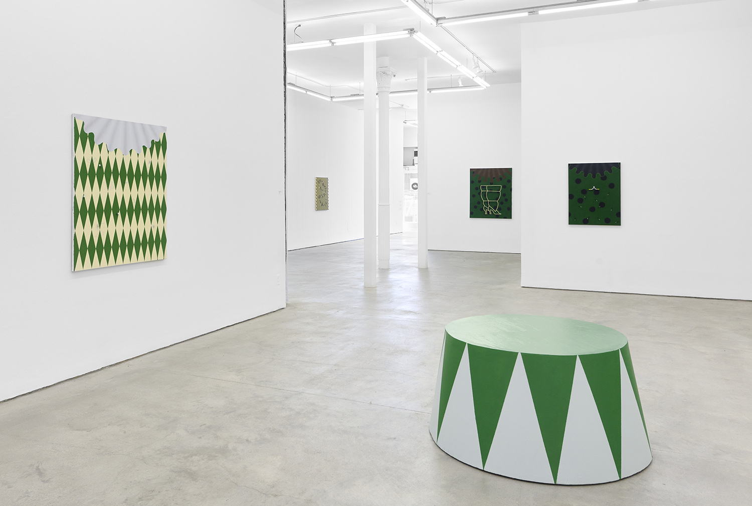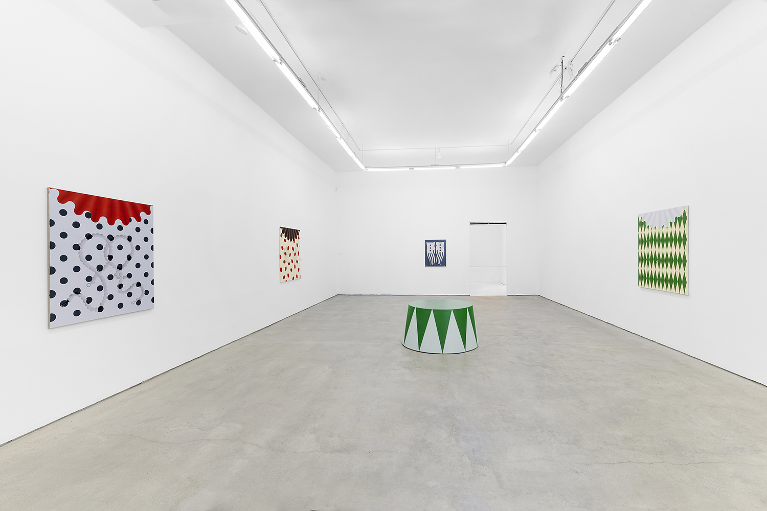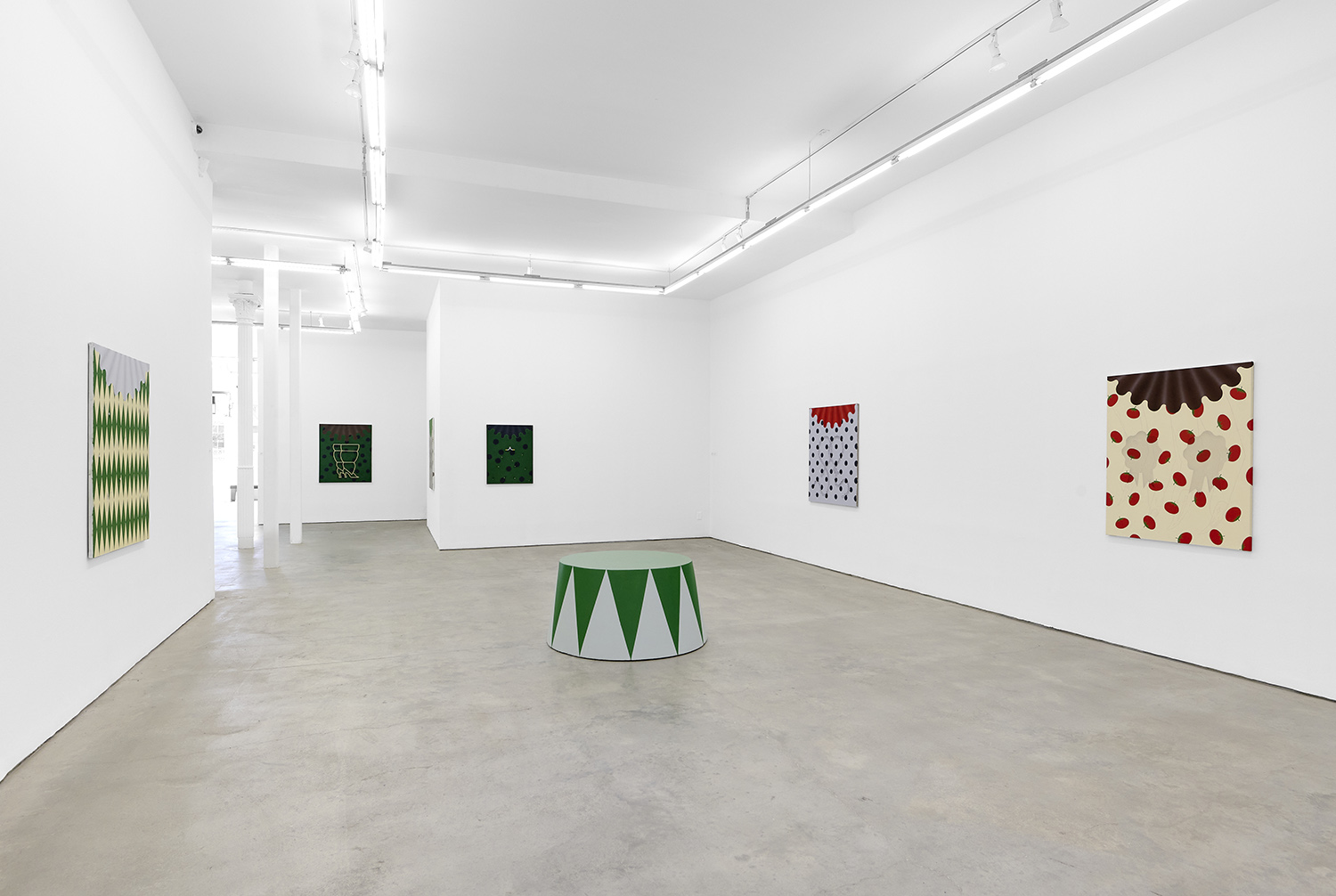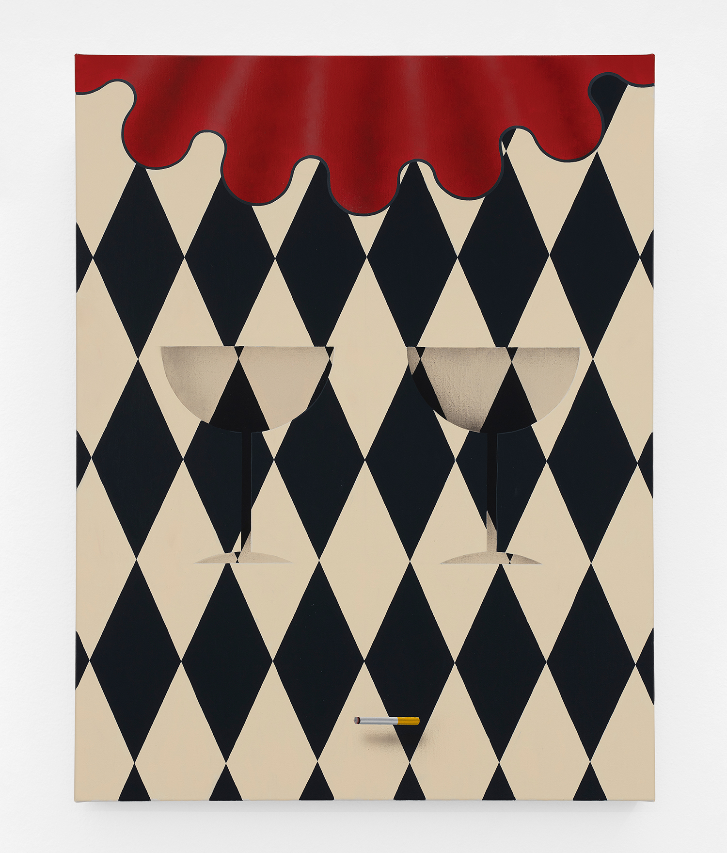 There have been salutes to the circus in Charline’s work since the beginning, a theme brewing but yet to be fully recognized by their creator. Signature stripes, checkers and harlequin patterns grab your gaze, but the details and delights revealing themselves only upon closer looking; she makes us work for it. The paintings begin with the patterning: the artist does not use tape and instead her technical execution is possible only with layering and precise planning, deconstructing images in her head and figuring out exactly how it will work before puzzle-piecing it back together.