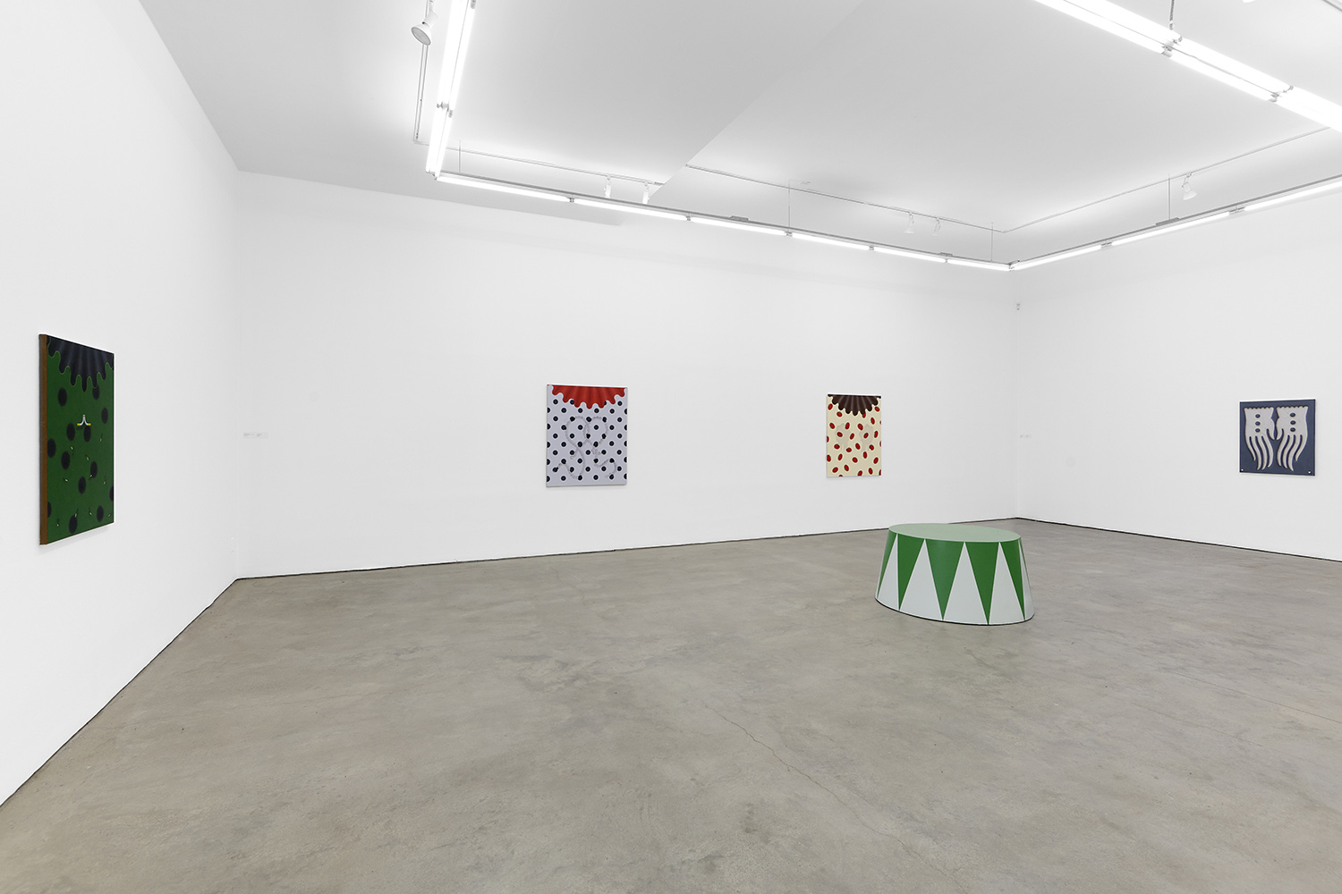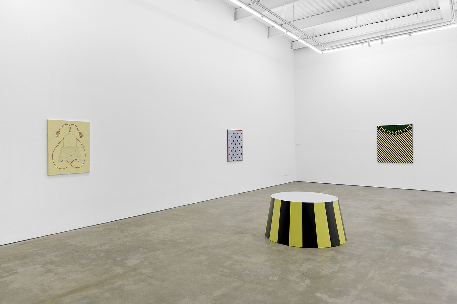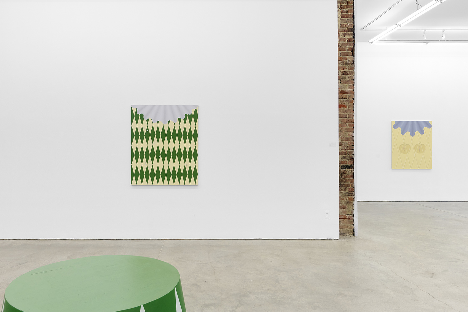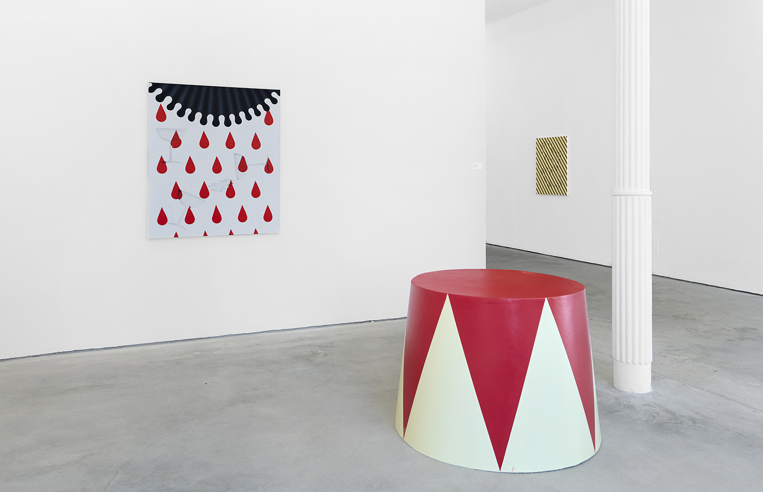 There have been salutes to the circus in Charline’s work since the beginning, a theme brewing but yet to be fully recognized by their creator. Signature stripes, checkers and harlequin patterns grab your gaze, but the details and delights revealing themselves only upon closer looking; she makes us work for it. The paintings begin with the patterning: the artist does not use tape and instead her technical execution is possible only with layering and precise planning, deconstructing images in her head and figuring out exactly how it will work before puzzle-piecing it back together.
