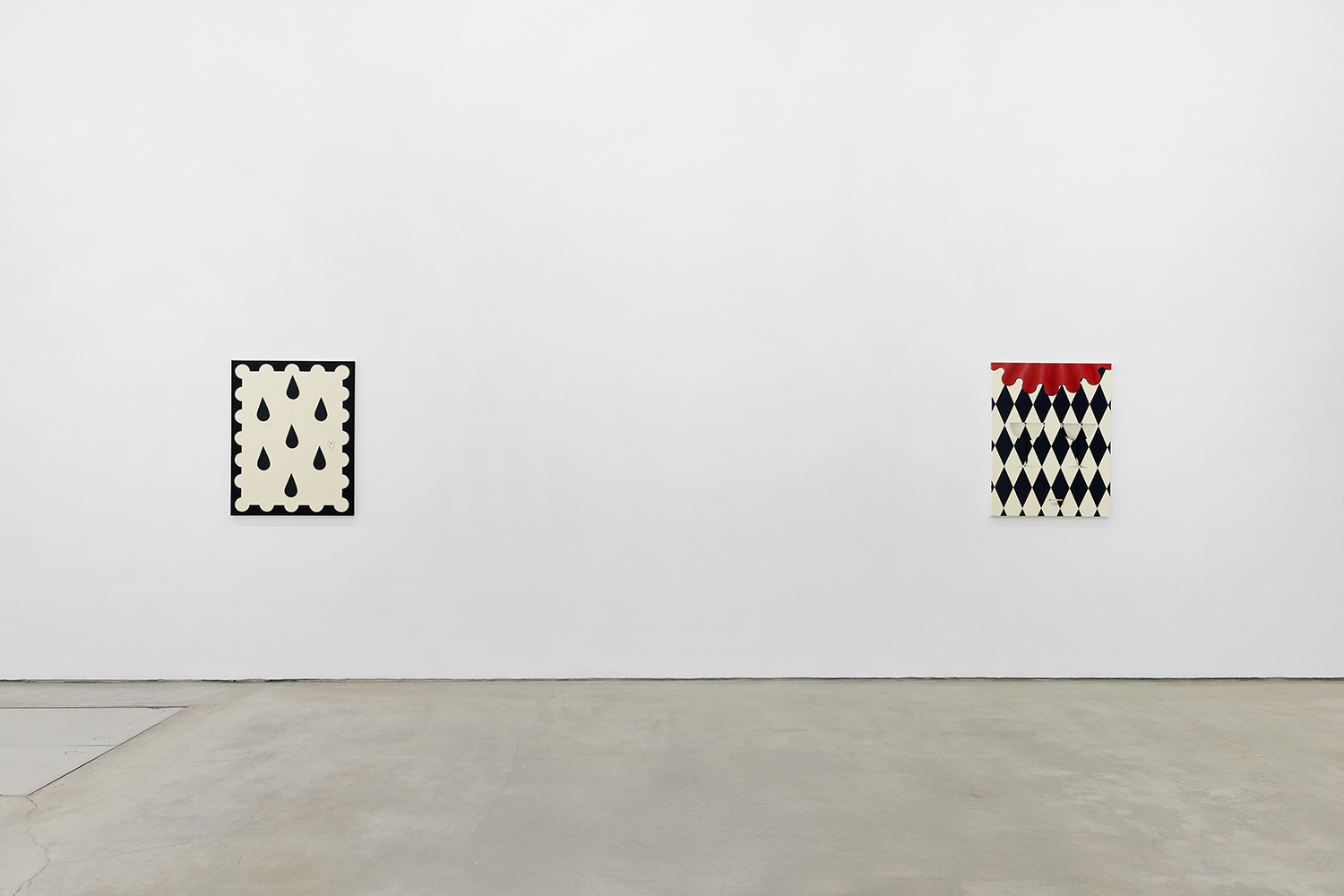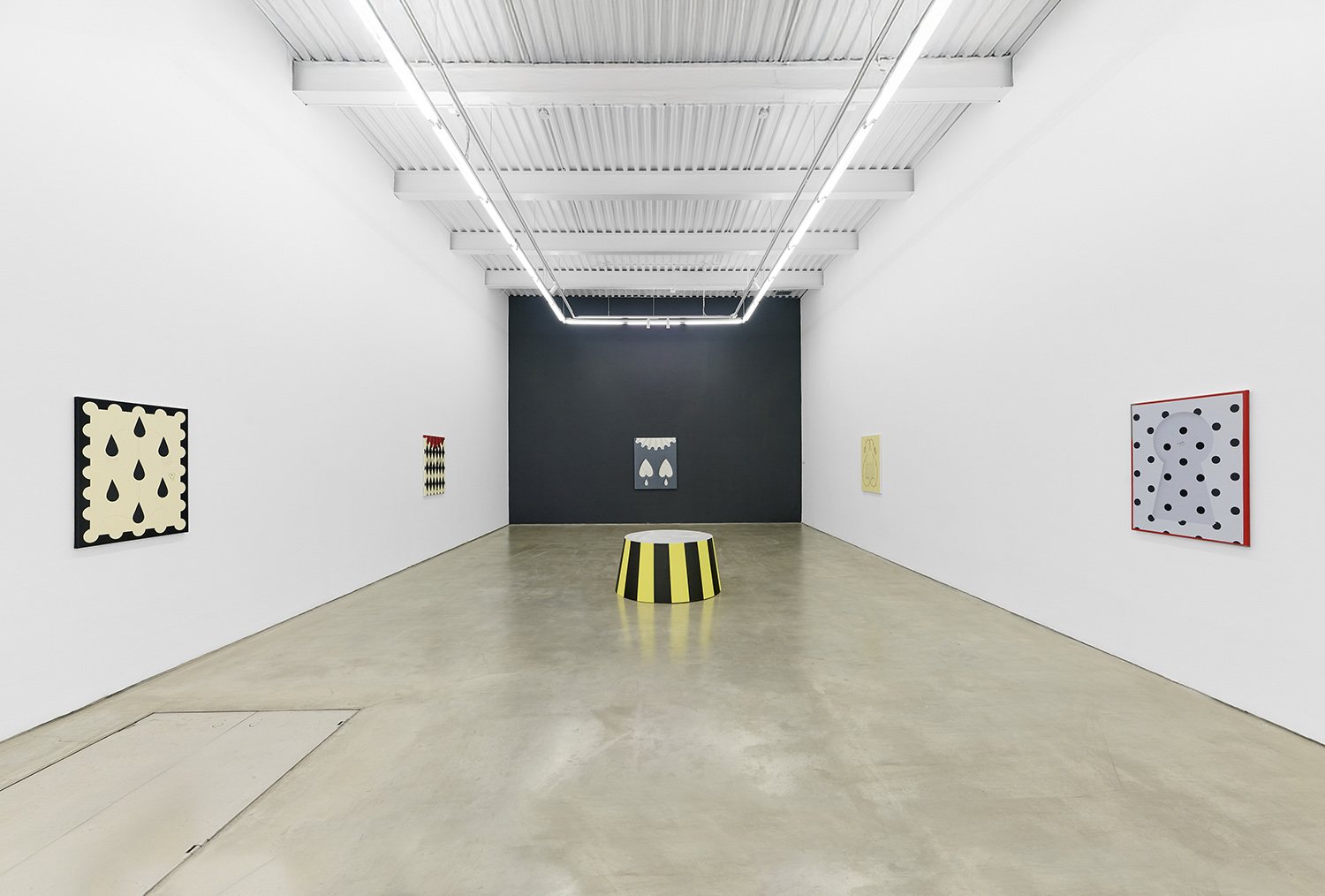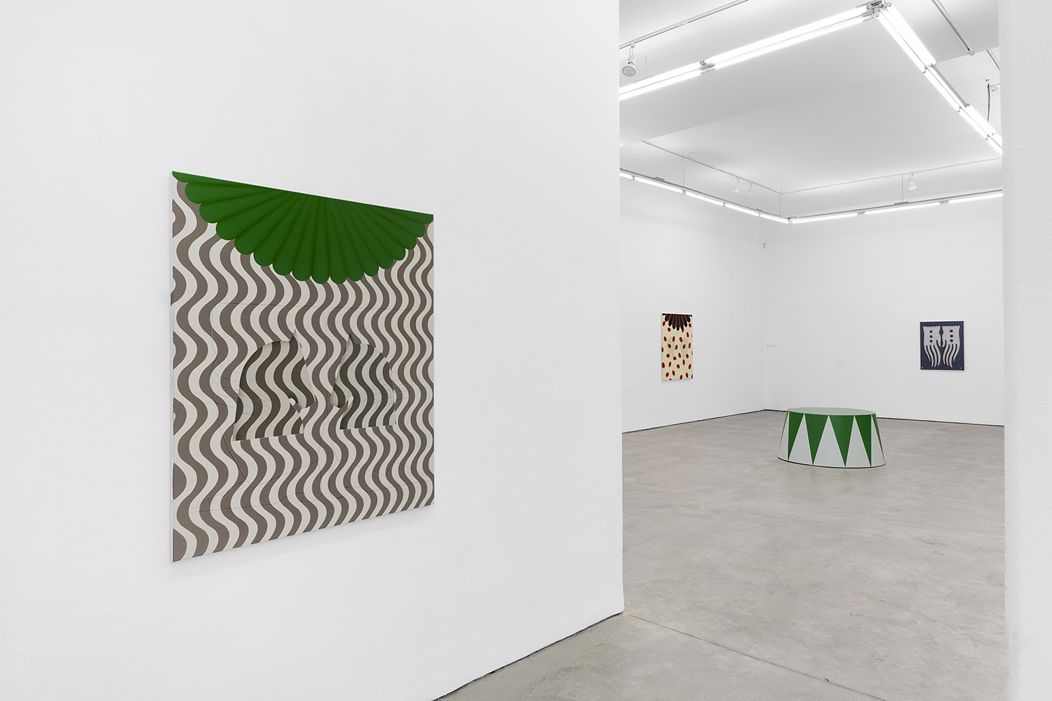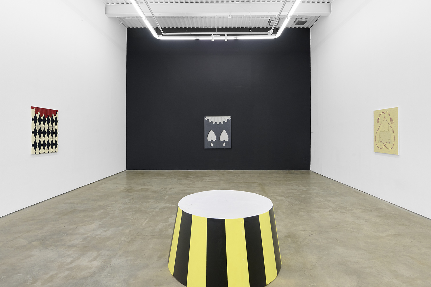 There have been salutes to the circus in Charline’s work since the beginning, a theme brewing but yet to be fully recognized by their creator. Signature stripes, checkers and harlequin patterns grab your gaze, but the details and delights revealing themselves only upon closer looking; she makes us work for it. The paintings begin with the patterning: the artist does not use tape and instead her technical execution is possible only with layering and precise planning, deconstructing images in her head and figuring out exactly how it will work before puzzle-piecing it back together.