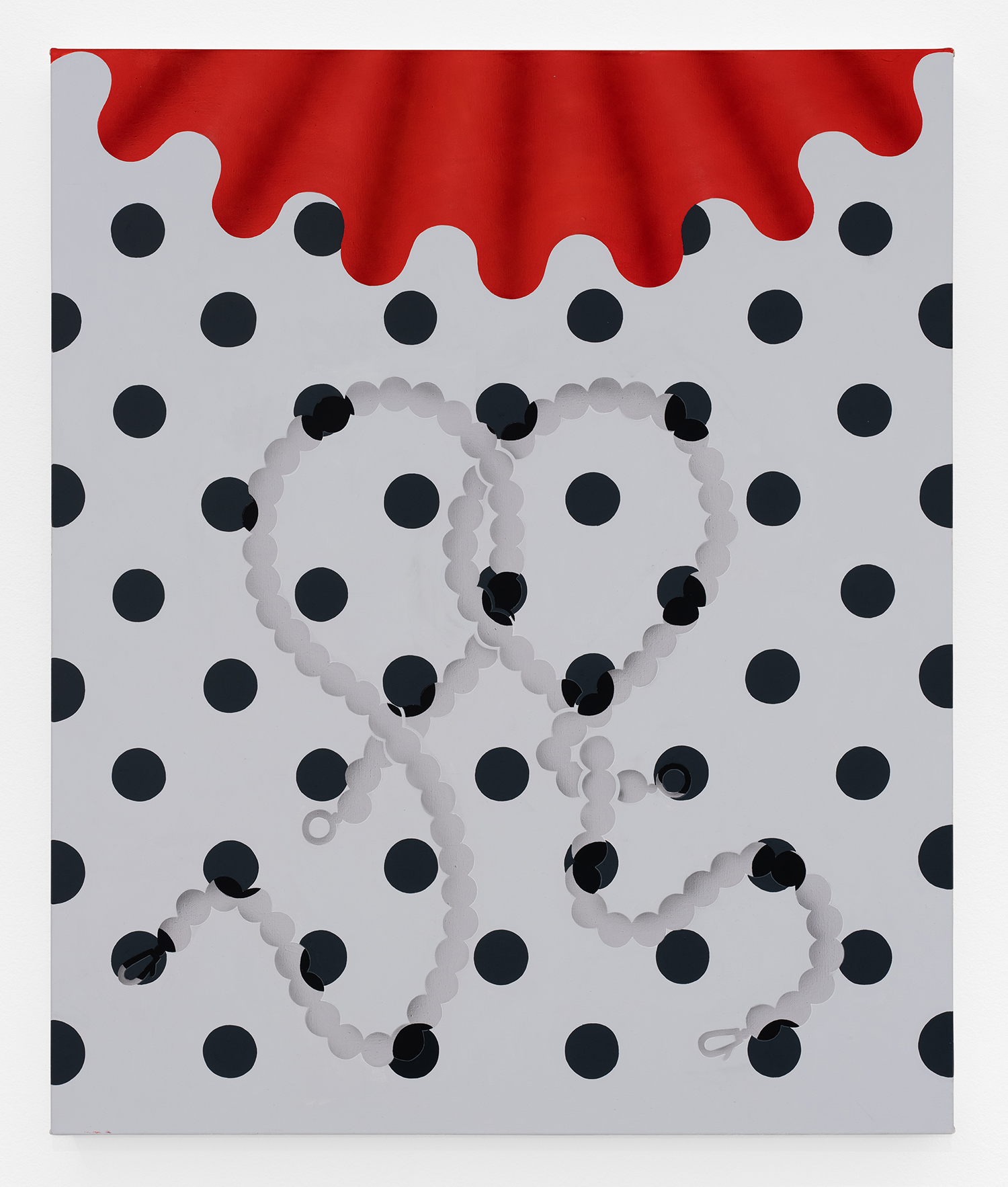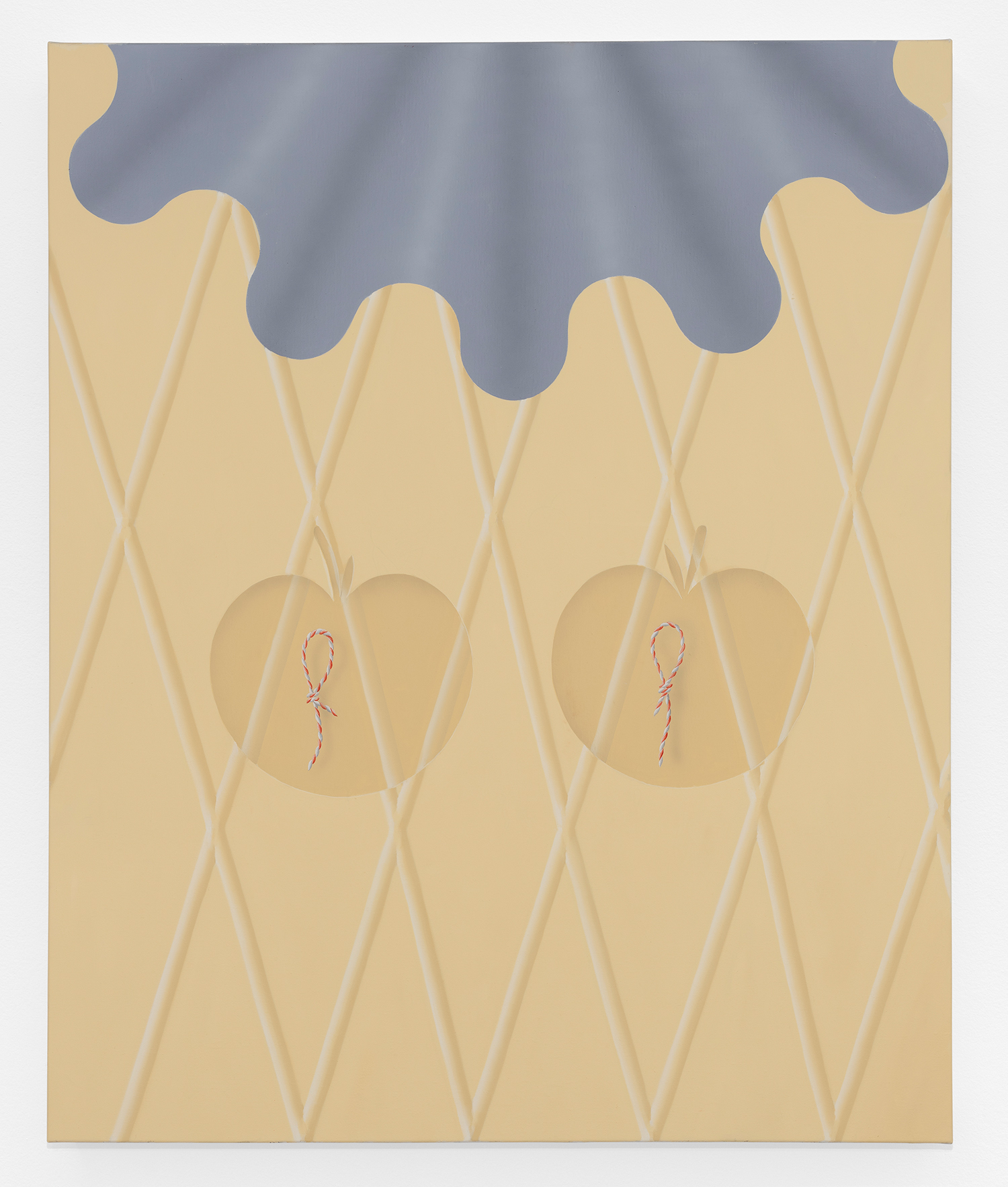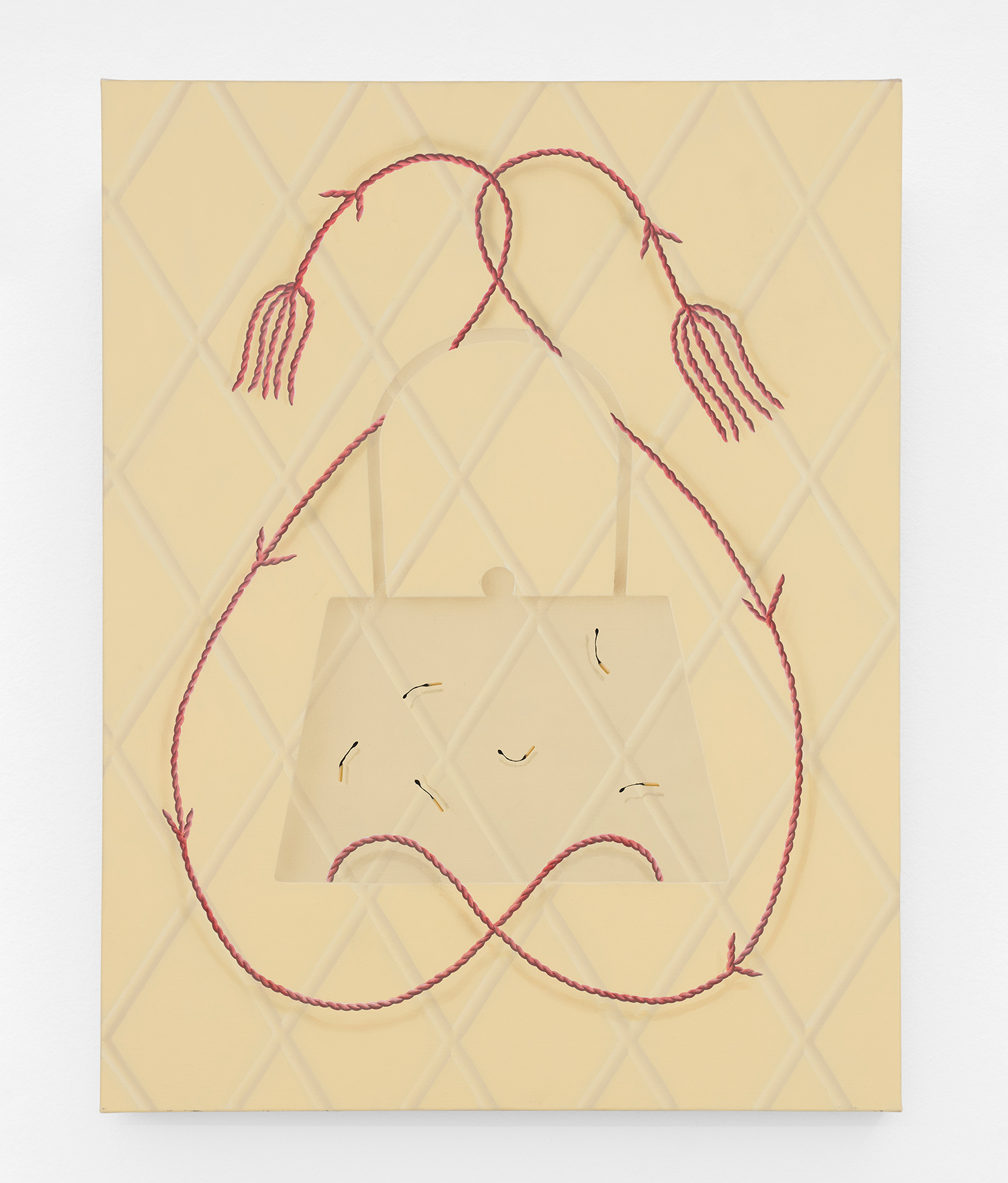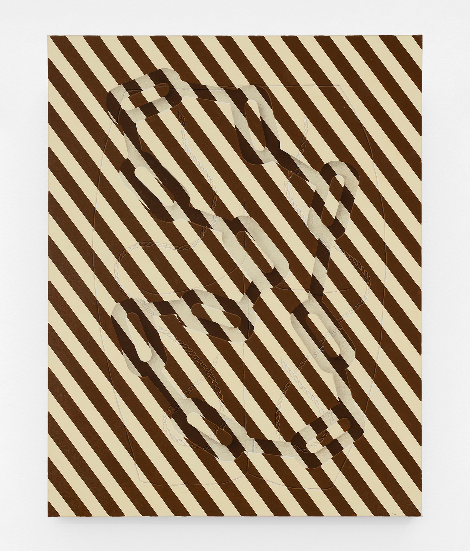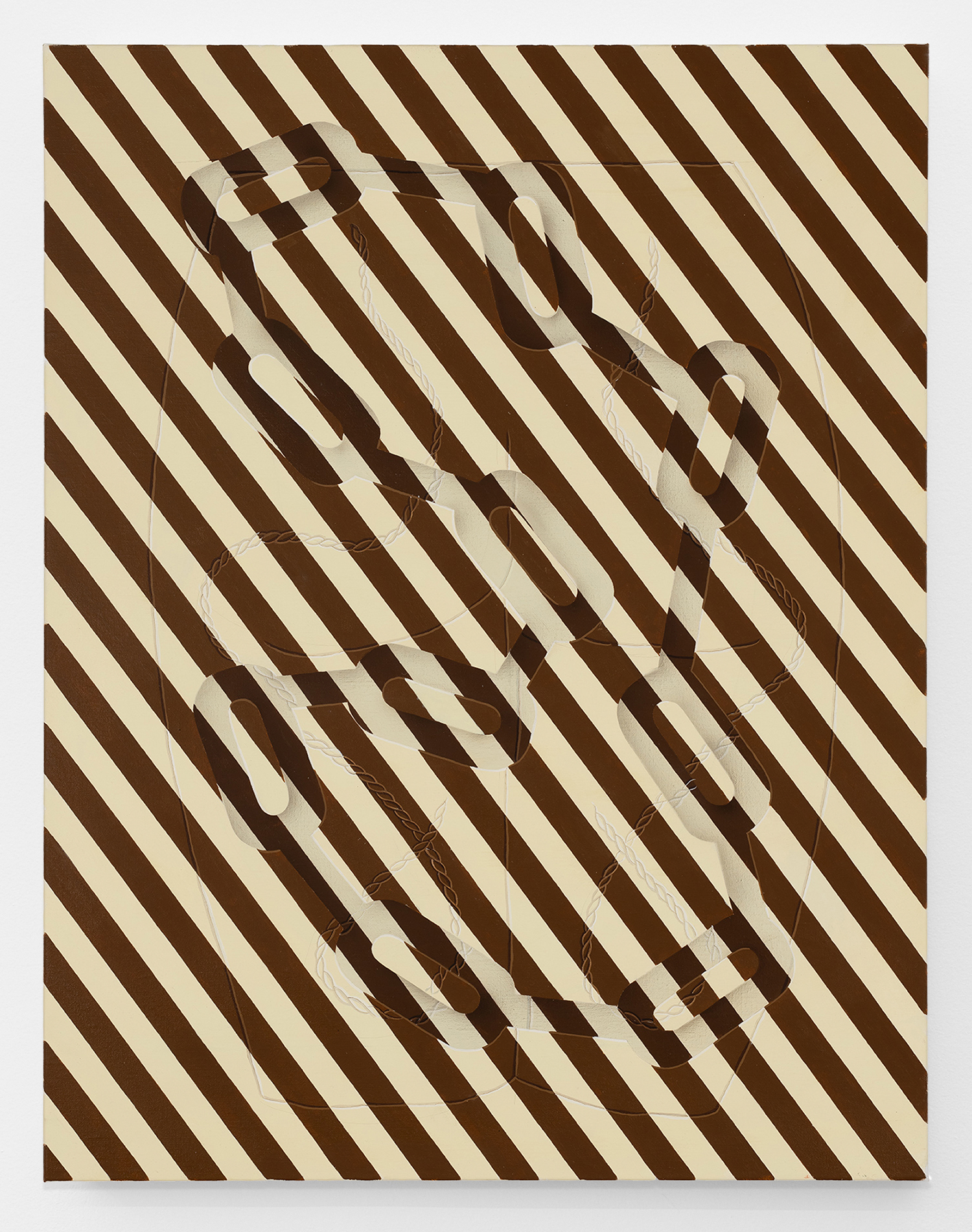 In this new body of work Charline brings in more human components into the painting. “Painting quotidian objects had begun to feel distant,” noted the artist. “Anthropomorphizing the work with gloves and ruffs instead softens the works to feels less sterile.” In Lost AND Found?!?! we see elegant evening gloves rendered as marble hands, impractically holding scissors. In Sloppy Sad Sleepy ruffled knickers await discovery under the yellow and black stripe pattern and in Sighlence we find heeled boots made of rope. In about half the paintings, actually, a jesterly ruff at the top of the composition alludes to a figure, presumably Clownette’s head, just cropped out of view.