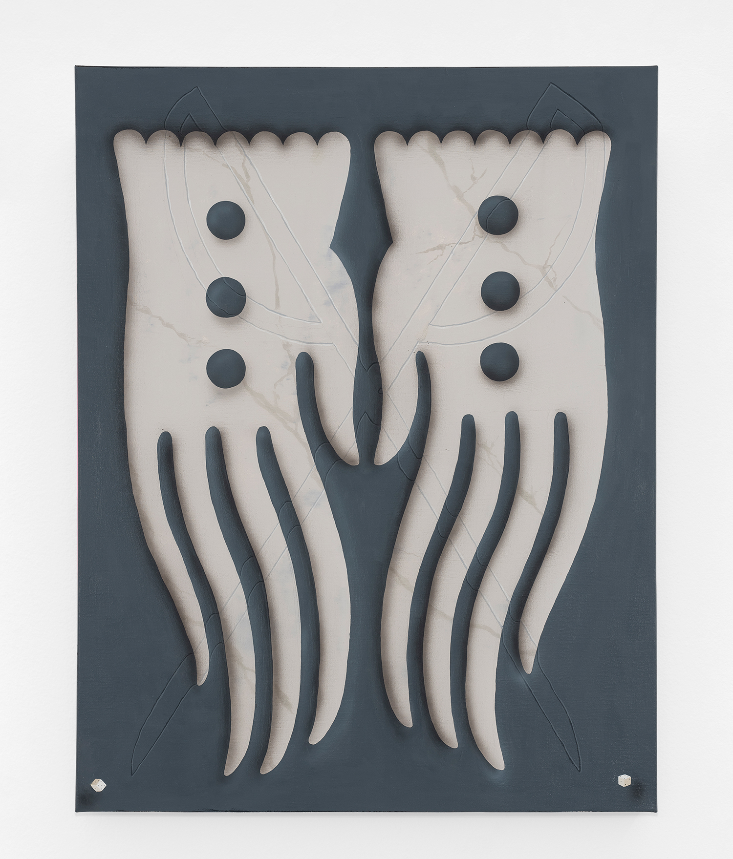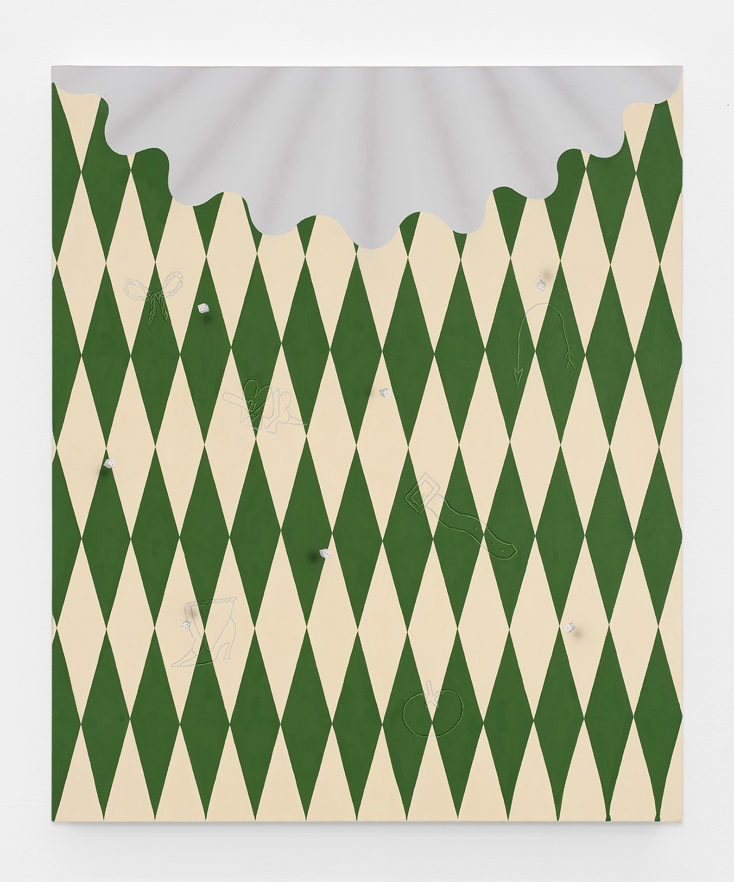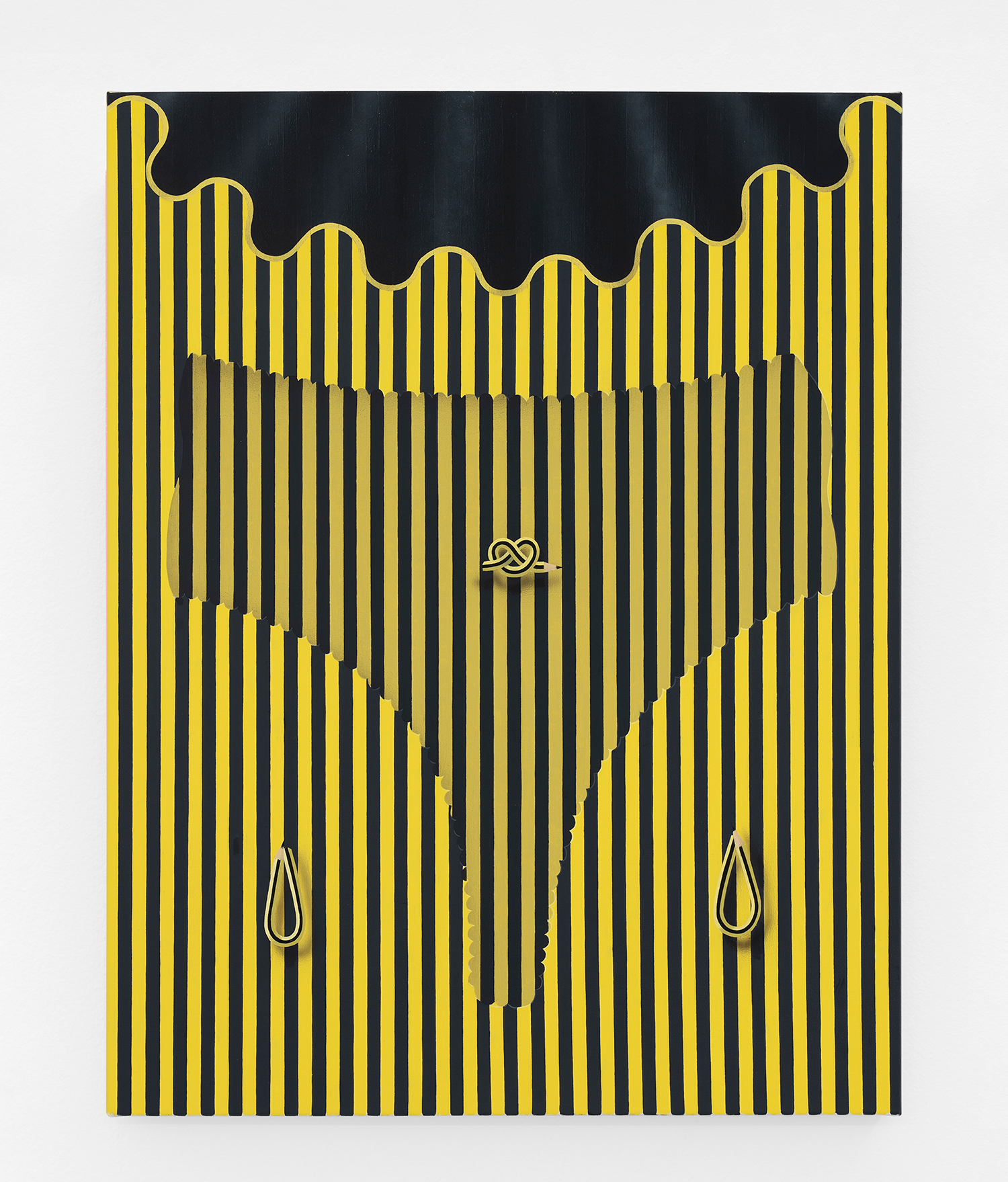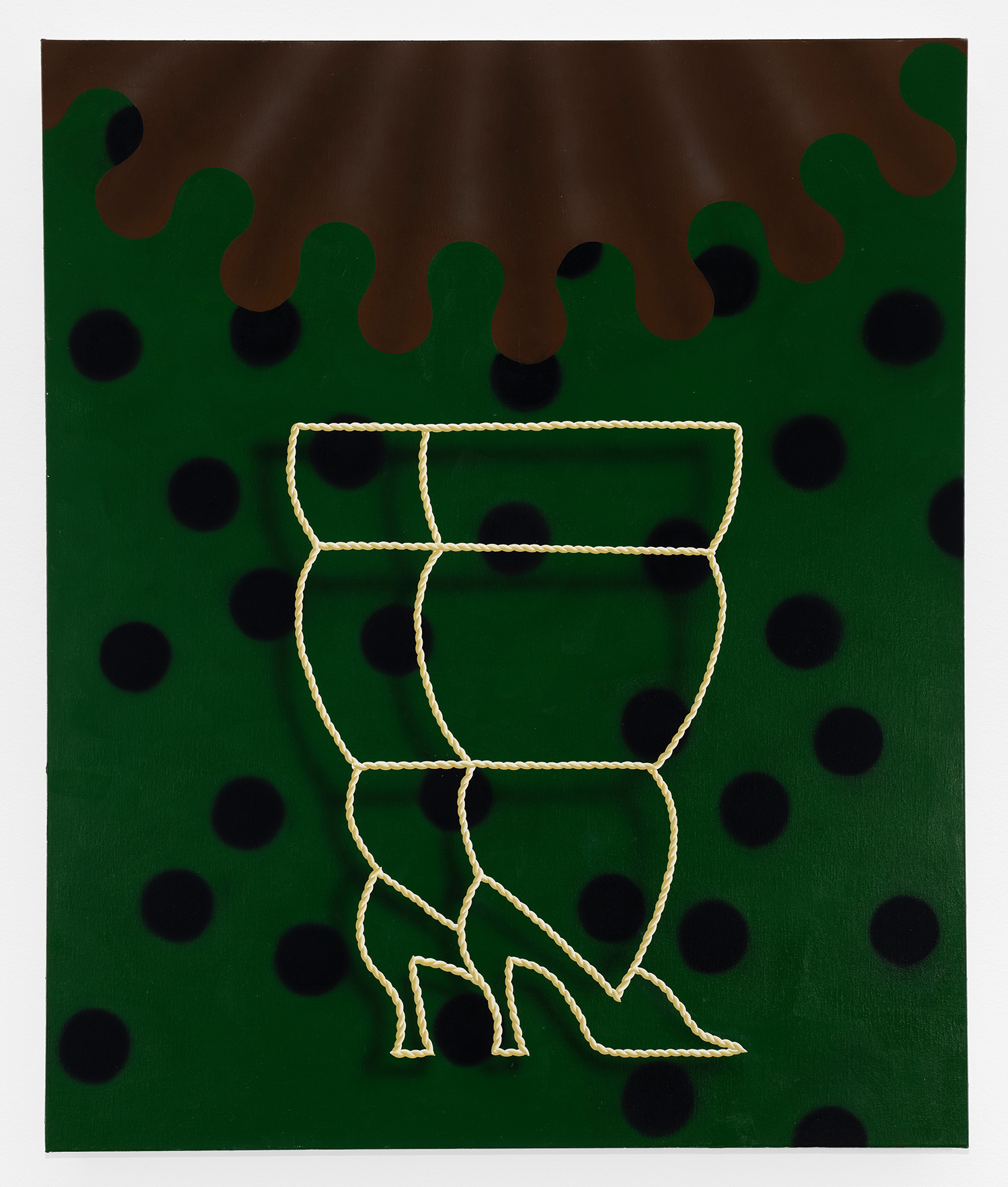 In this new body of work Charline brings in more human components into the painting. “Painting quotidian objects had begun to feel distant,” noted the artist. “Anthropomorphizing the work with gloves and ruffs instead softens the works to feels less sterile.” In Lost AND Found?!?! we see elegant evening gloves rendered as marble hands, impractically holding scissors. In Sloppy Sad Sleepy ruffled knickers await discovery under the yellow and black stripe pattern and in Sighlence we find heeled boots made of rope. In about half the paintings, actually, a jesterly ruff at the top of the composition alludes to a figure, presumably Clownette’s head, just cropped out of view.