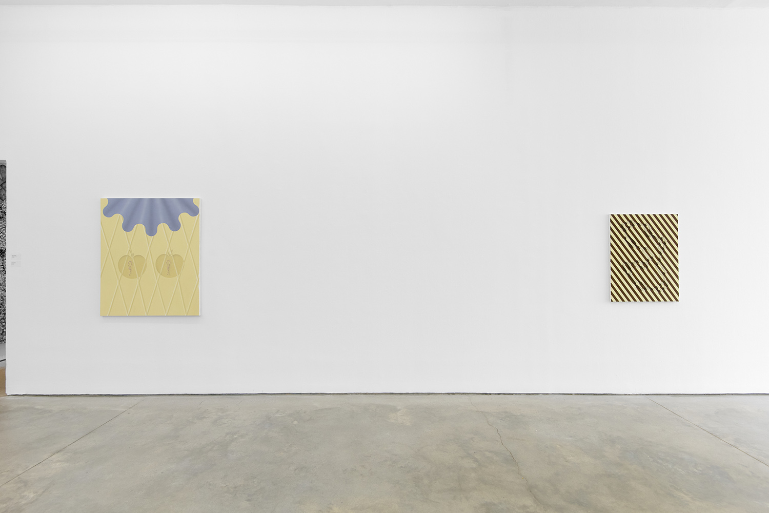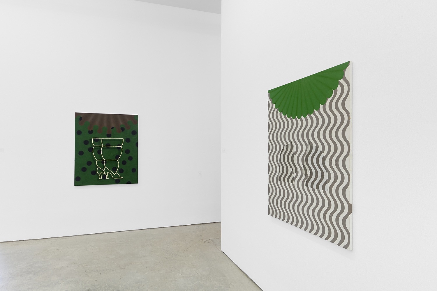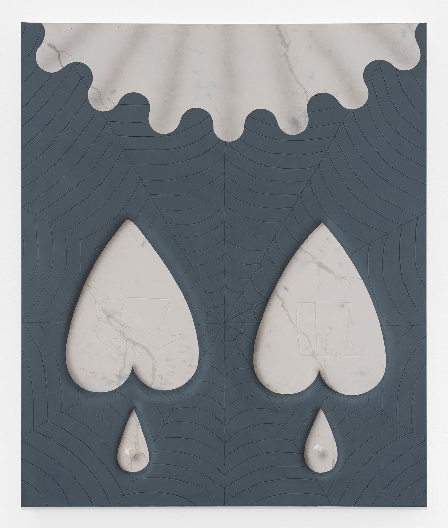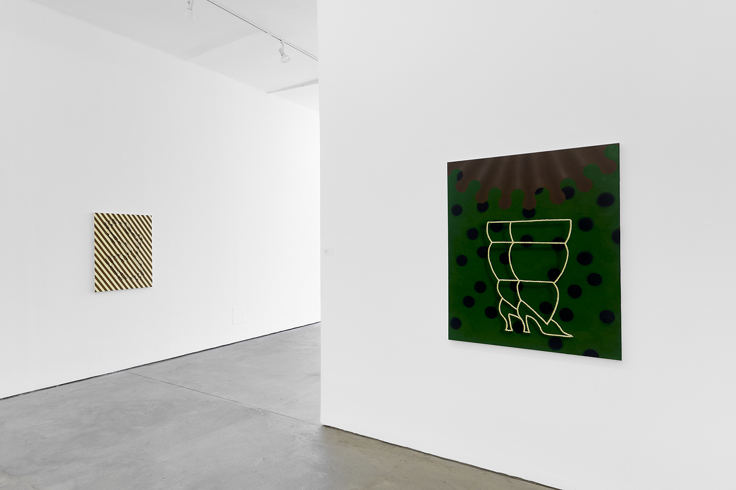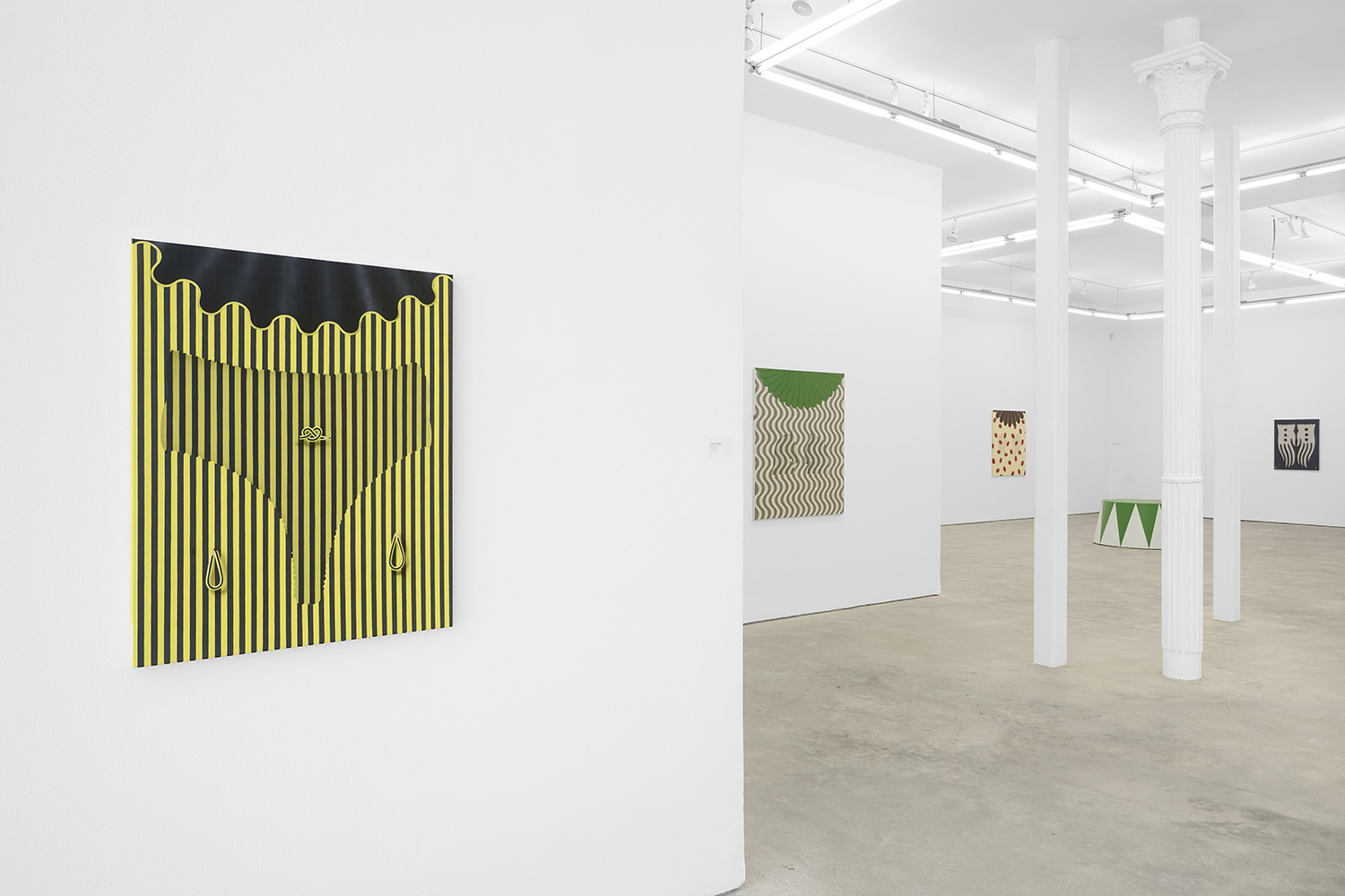 In this new body of work Charline brings in more human components into the painting. “Painting quotidian objects had begun to feel distant,” noted the artist. “Anthropomorphizing the work with gloves and ruffs instead softens the works to feels less sterile.” In Lost AND Found?!?! we see elegant evening gloves rendered as marble hands, impractically holding scissors. In Sloppy Sad Sleepy ruffled knickers await discovery under the yellow and black stripe pattern and in Sighlence we find heeled boots made of rope. In about half the paintings, actually, a jesterly ruff at the top of the composition alludes to a figure, presumably Clownette’s head, just cropped out of view.
