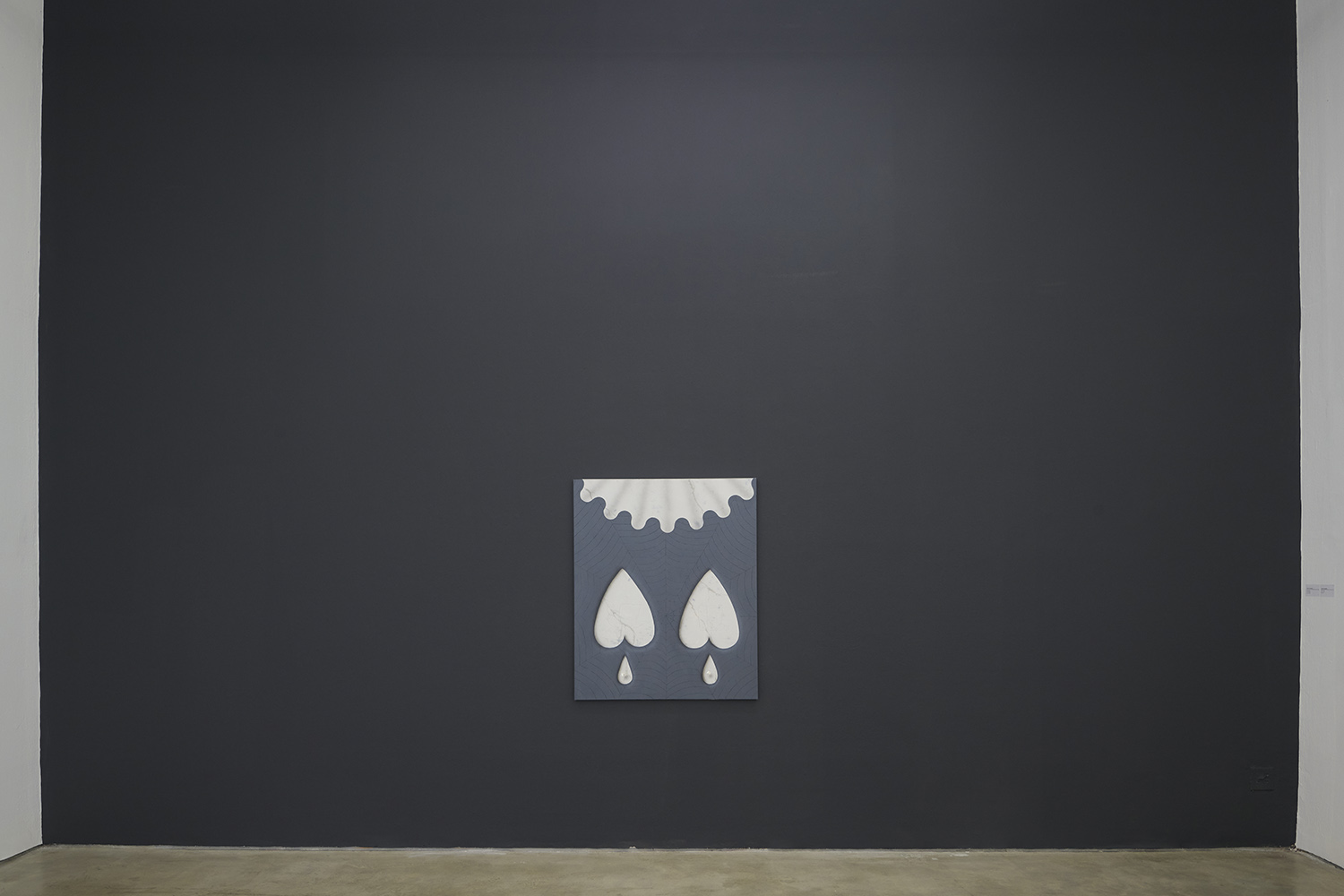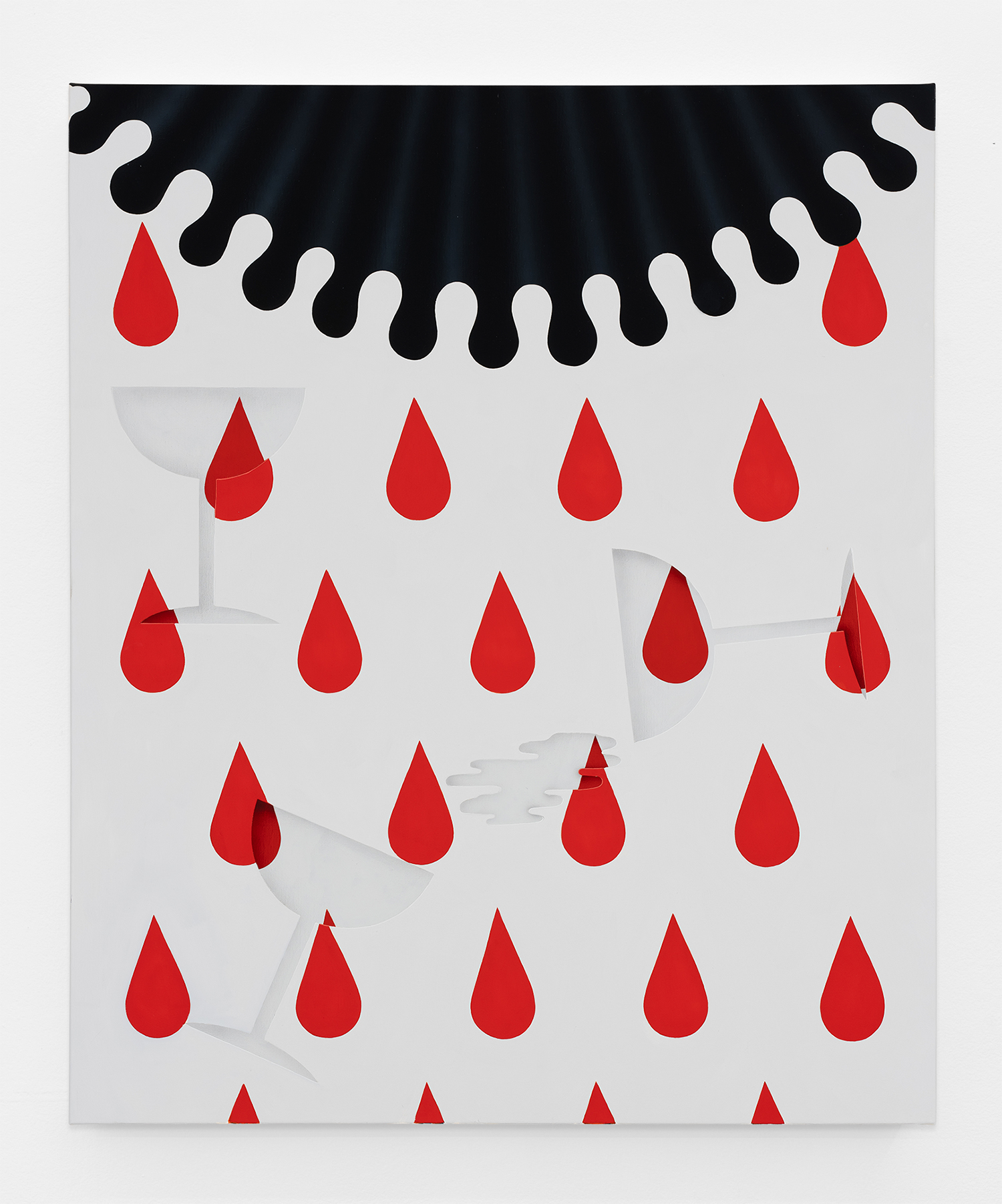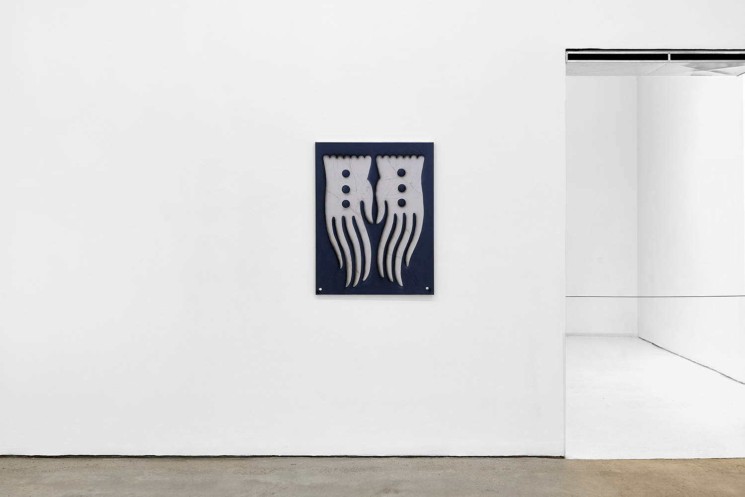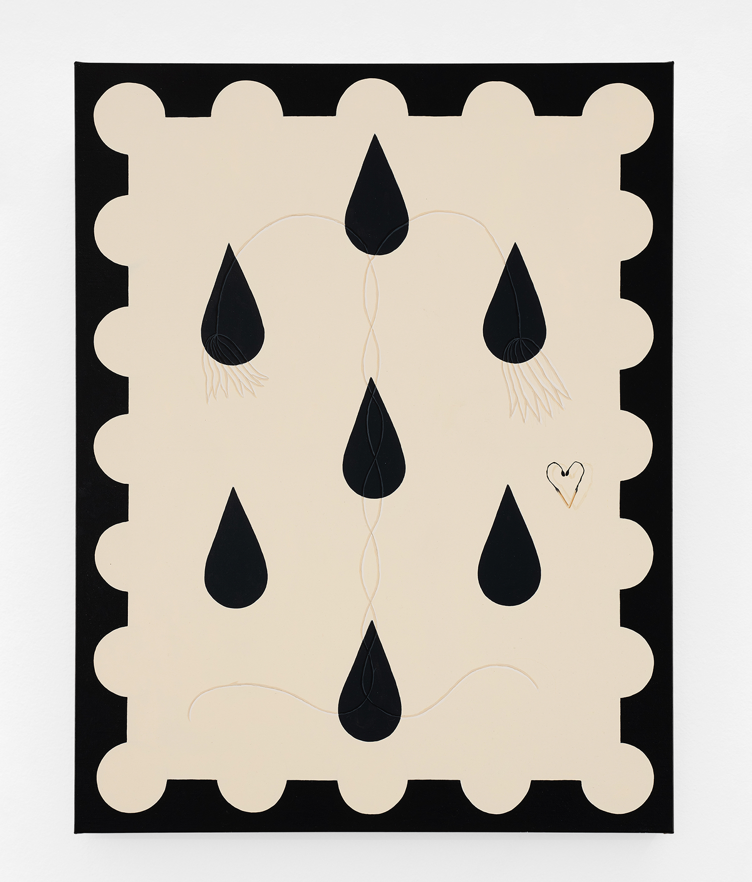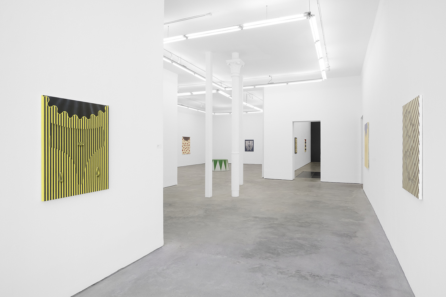 In this new body of work Charline brings in more human components into the painting. “Painting quotidian objects had begun to feel distant,” noted the artist. “Anthropomorphizing the work with gloves and ruffs instead softens the works to feels less sterile.” In Lost AND Found?!?! we see elegant evening gloves rendered as marble hands, impractically holding scissors. In Sloppy Sad Sleepy ruffled knickers await discovery under the yellow and black stripe pattern and in Sighlence we find heeled boots made of rope. In about half the paintings, actually, a jesterly ruff at the top of the composition alludes to a figure, presumably Clownette’s head, just cropped out of view.