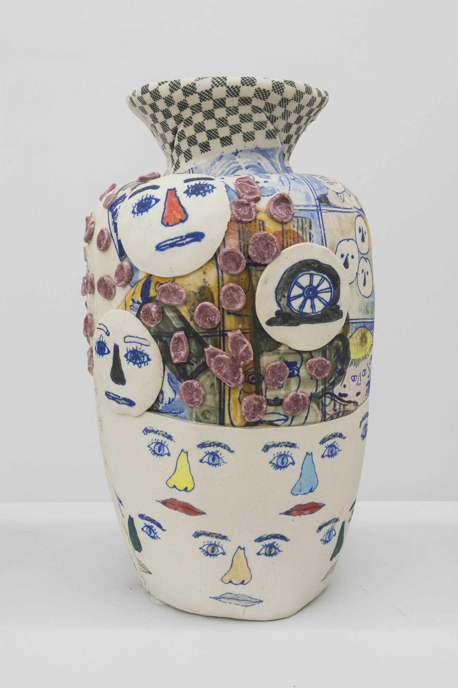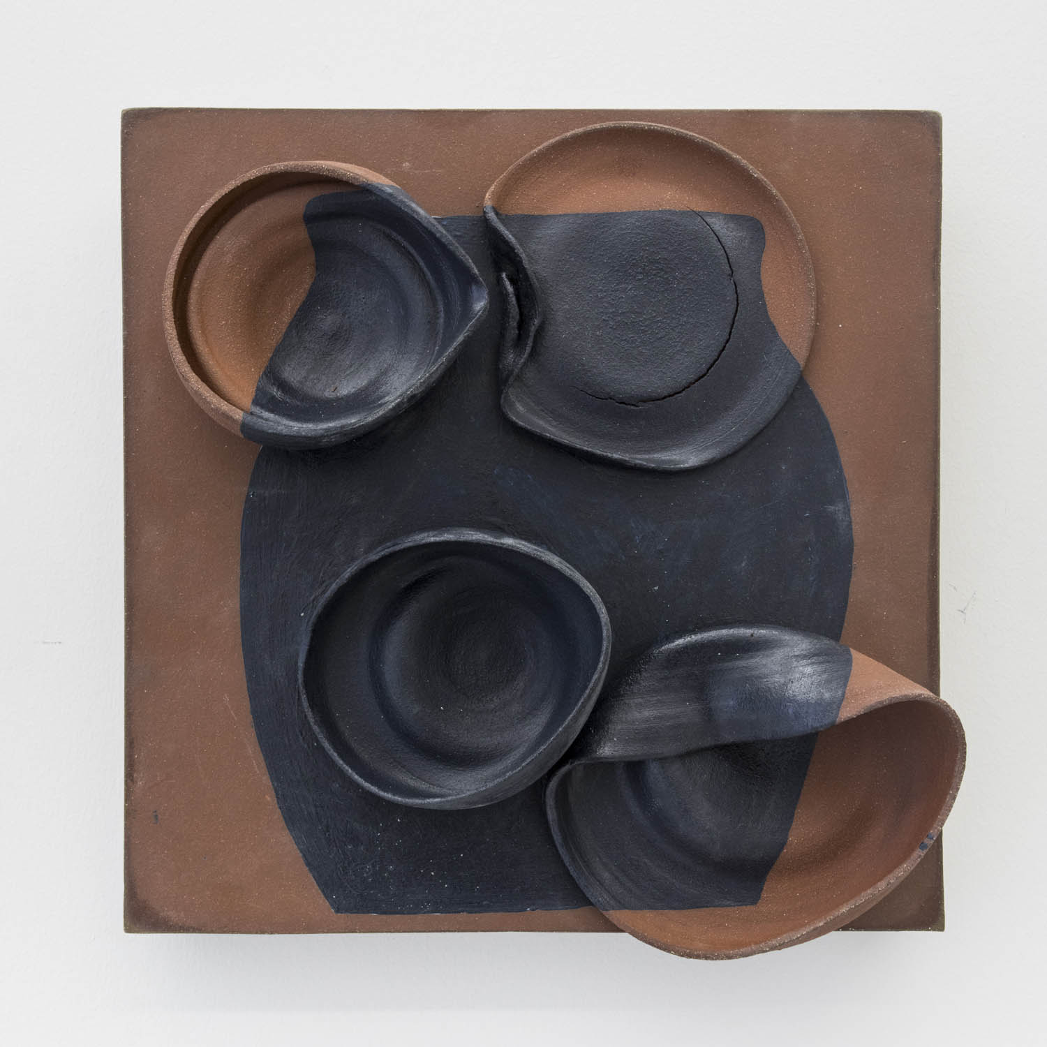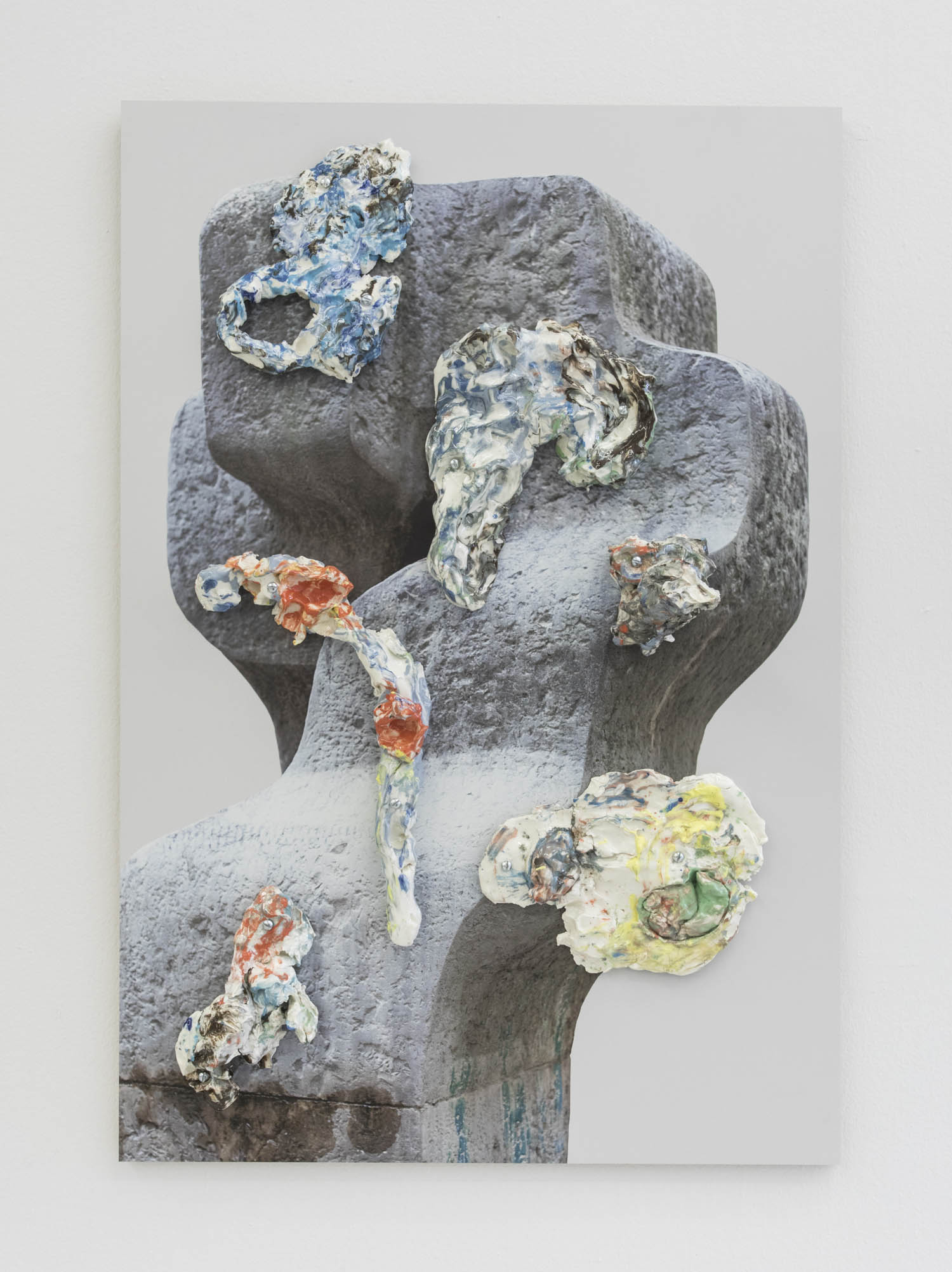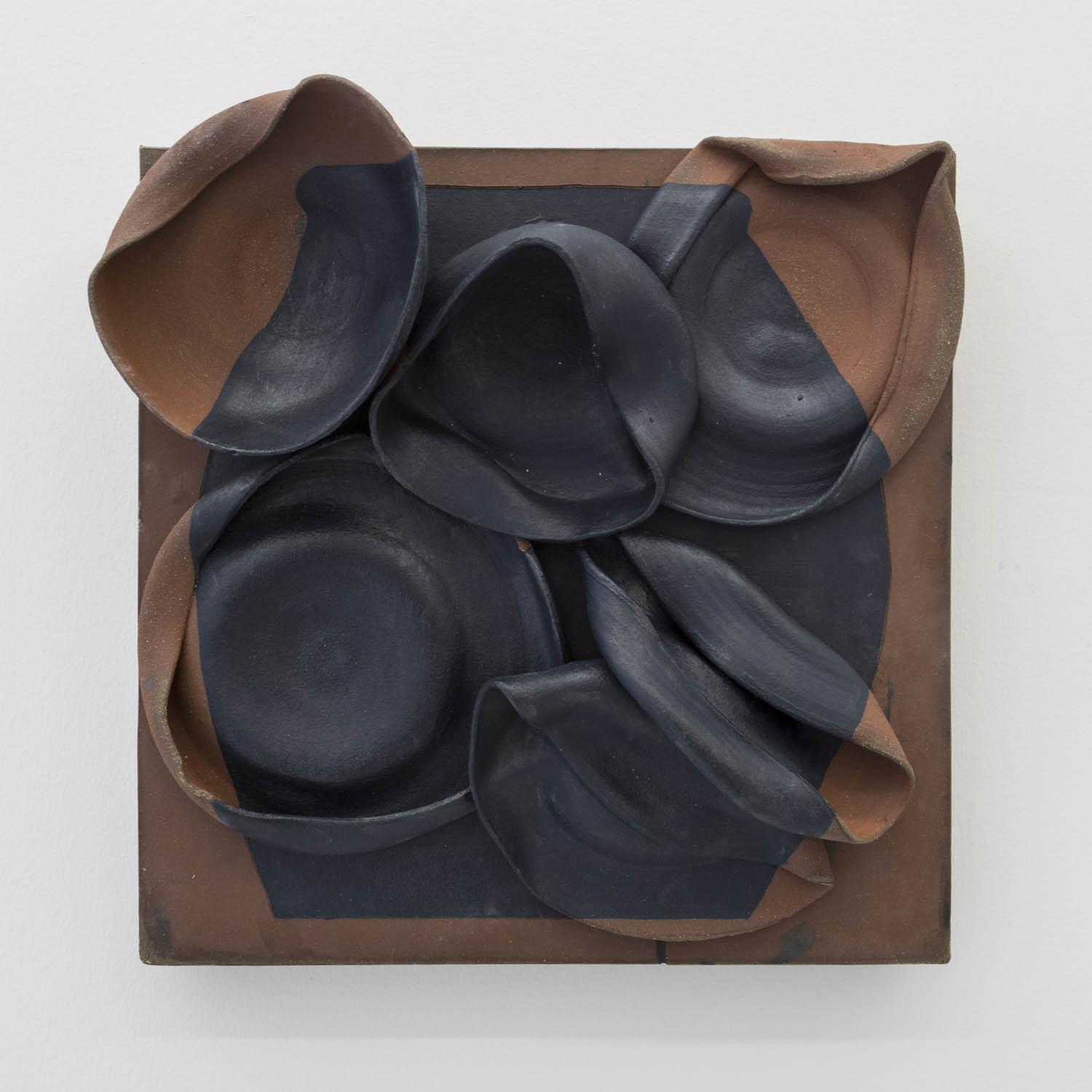 Transforming clay into inventive new types of surface or incorporating irreverent materials into the work, we find the impossibly fuzzy Francesca DiMattio, whose tall vessel in Ming-vase colors confounds the medium: a mutating muppet engulfing and incorporating traditional porcelain objects. Linda Lopez makes clay look like a soft tendriled undersea creature, and Swiss artist duo Aubry/ Broquard affix ceramic to laminated panels, using clay as postmodernist collage.