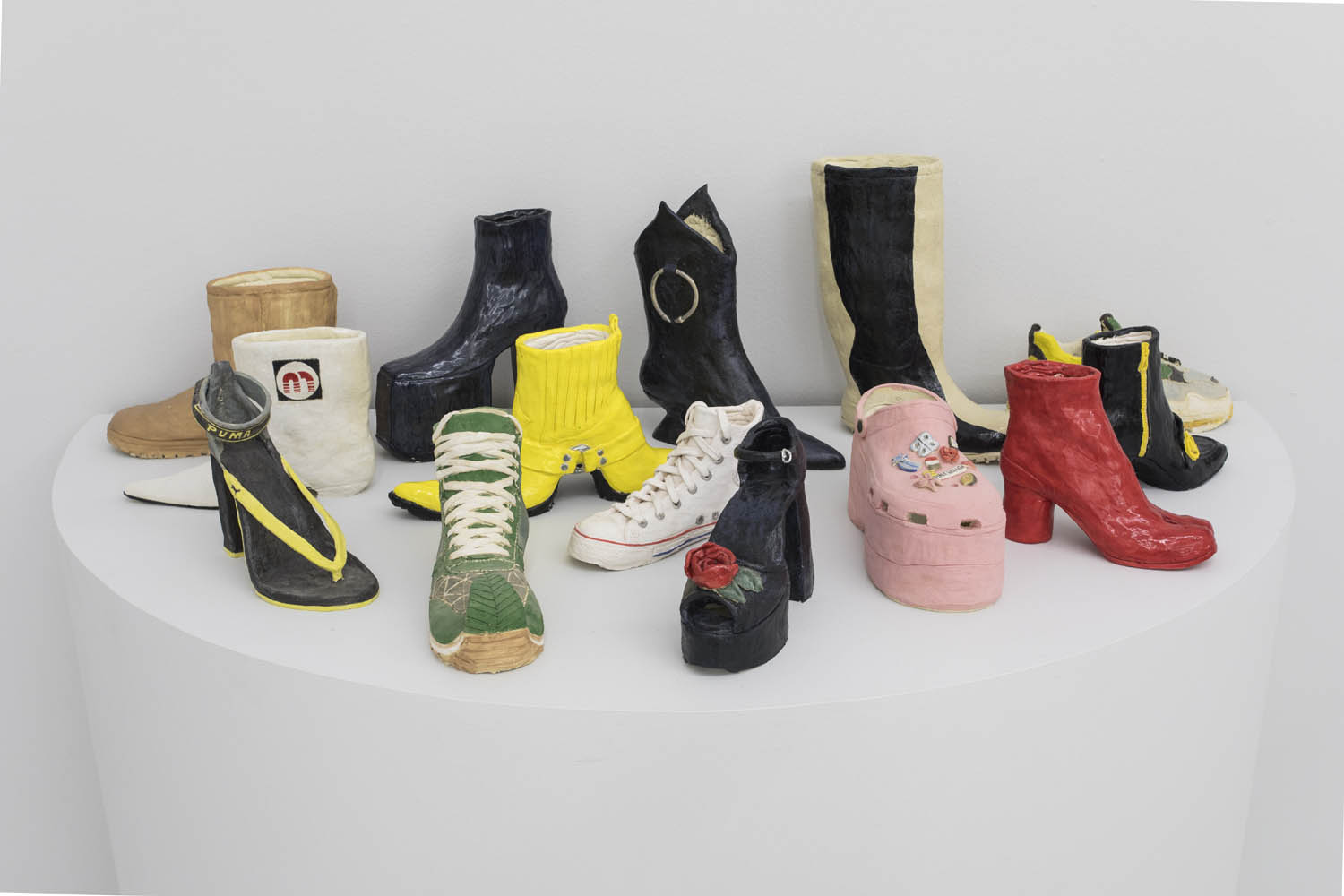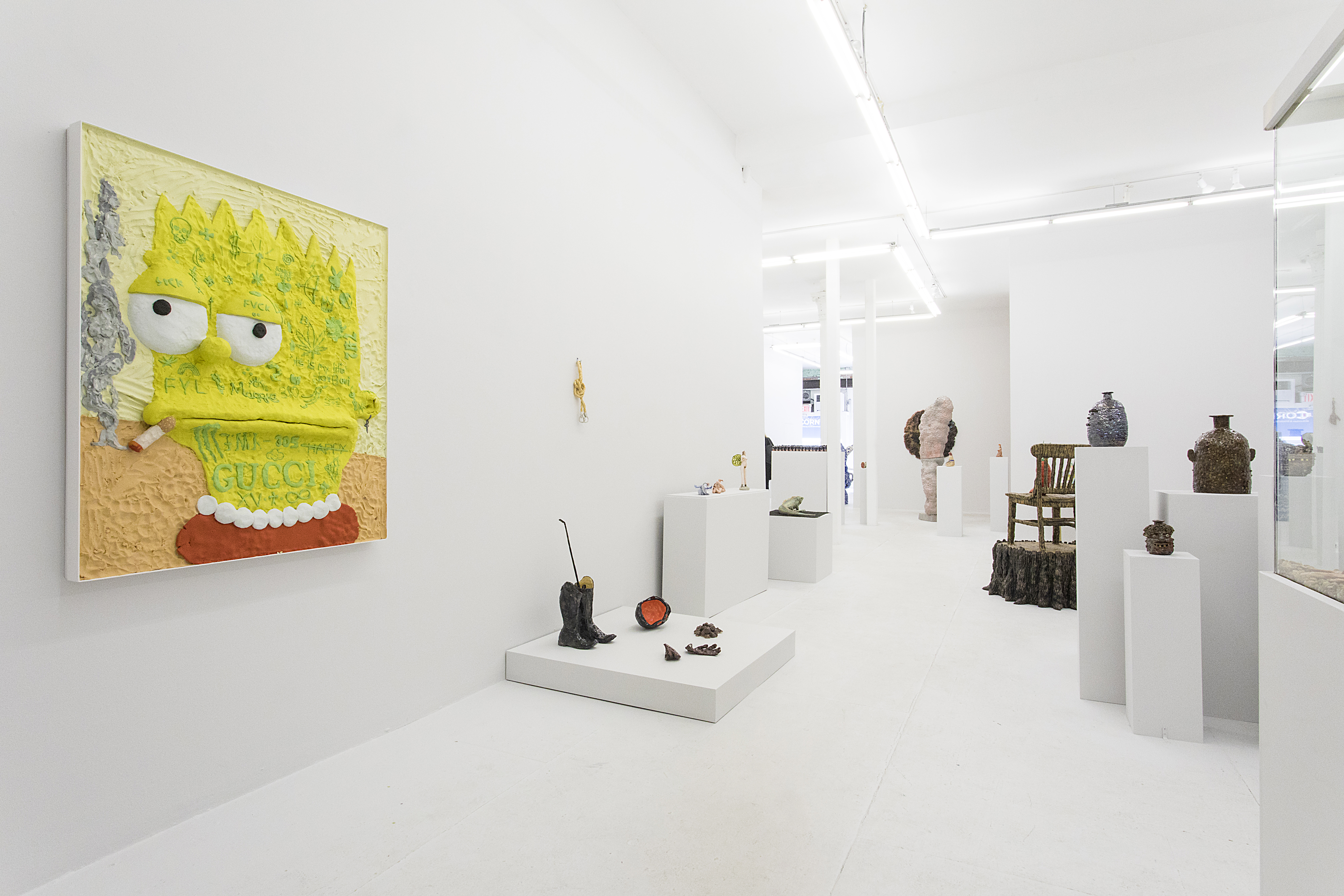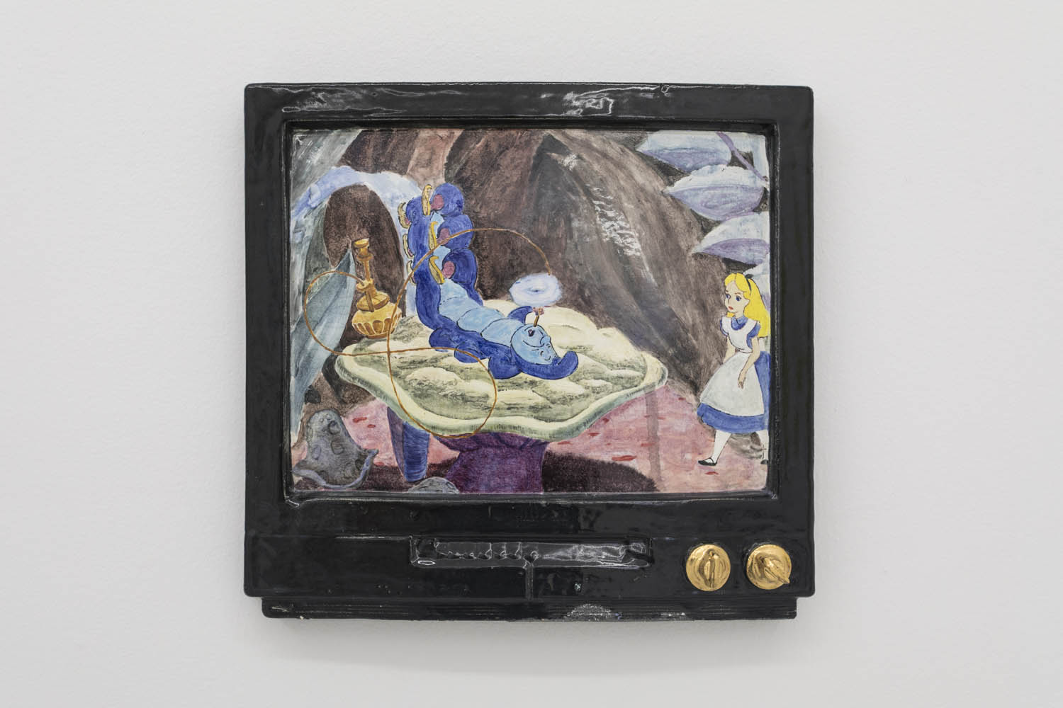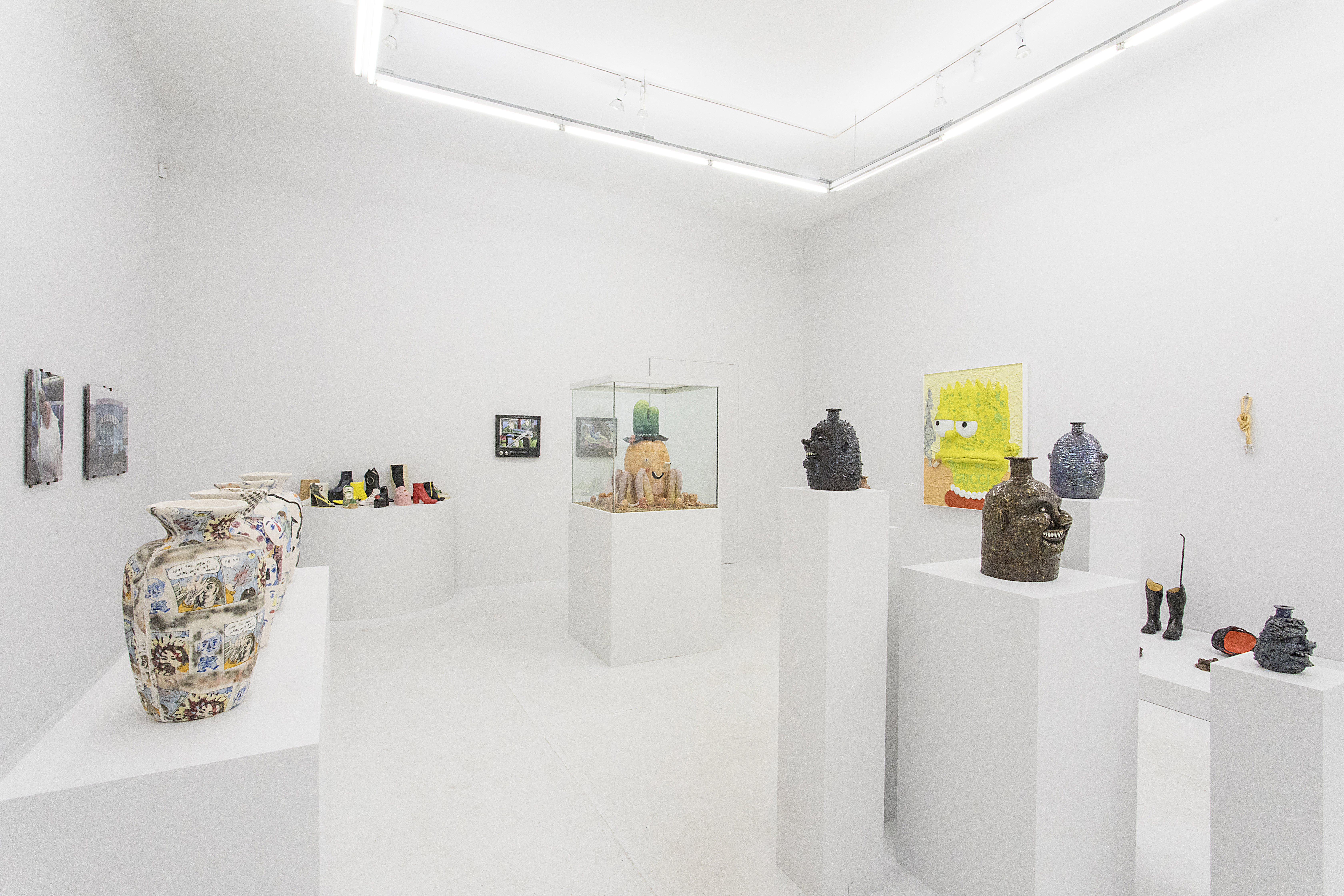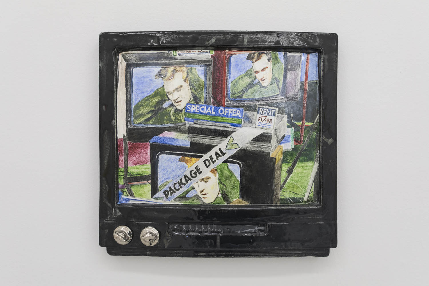 Then there are works that “immortalize” the everyday in clay: Rose Eken is not overly fussy in her recreation of objects in ceramic, here taking an evocatively impressionistic approach to horse stuff, from boots and whips to a bridle to a pile of poop. Diana Rojas sculpts her own exotic shoe collection as those sick Balenciaga Tripe S sneakers are just too expensive, while Jesse Edwards glazes realistic ceramic televisions with scenes of Morrissey and Alice in Wonderland, images burned into a screen permanently.