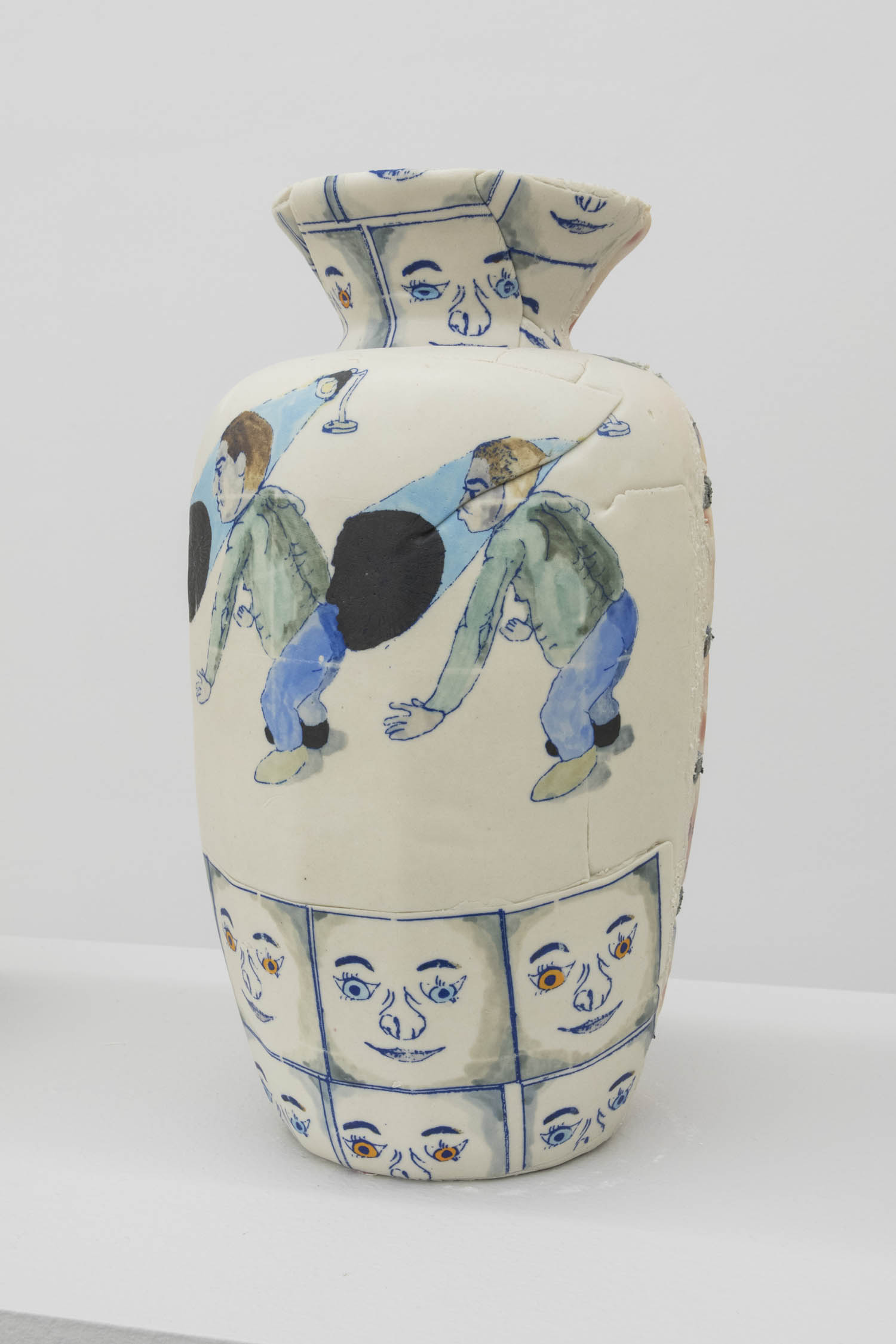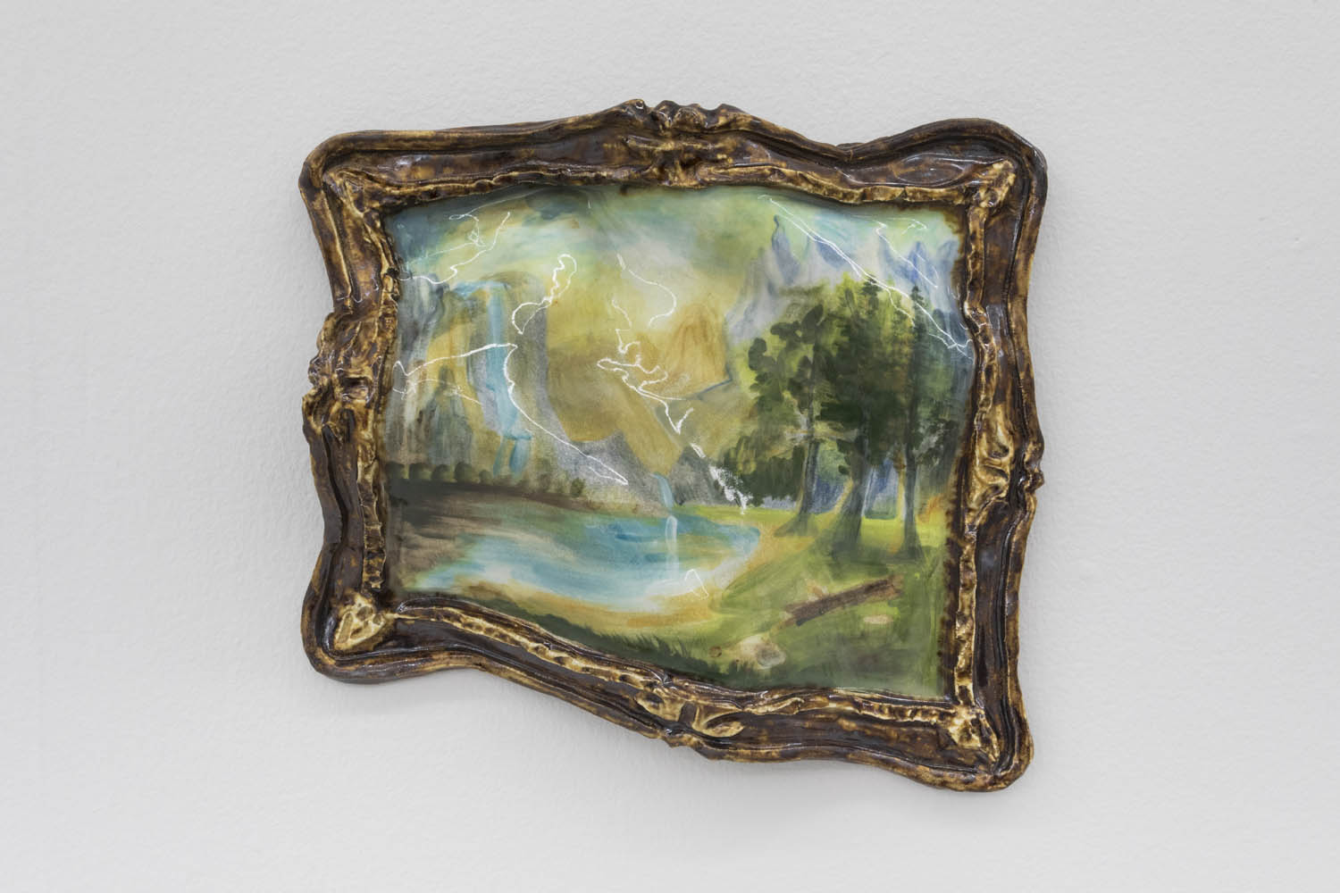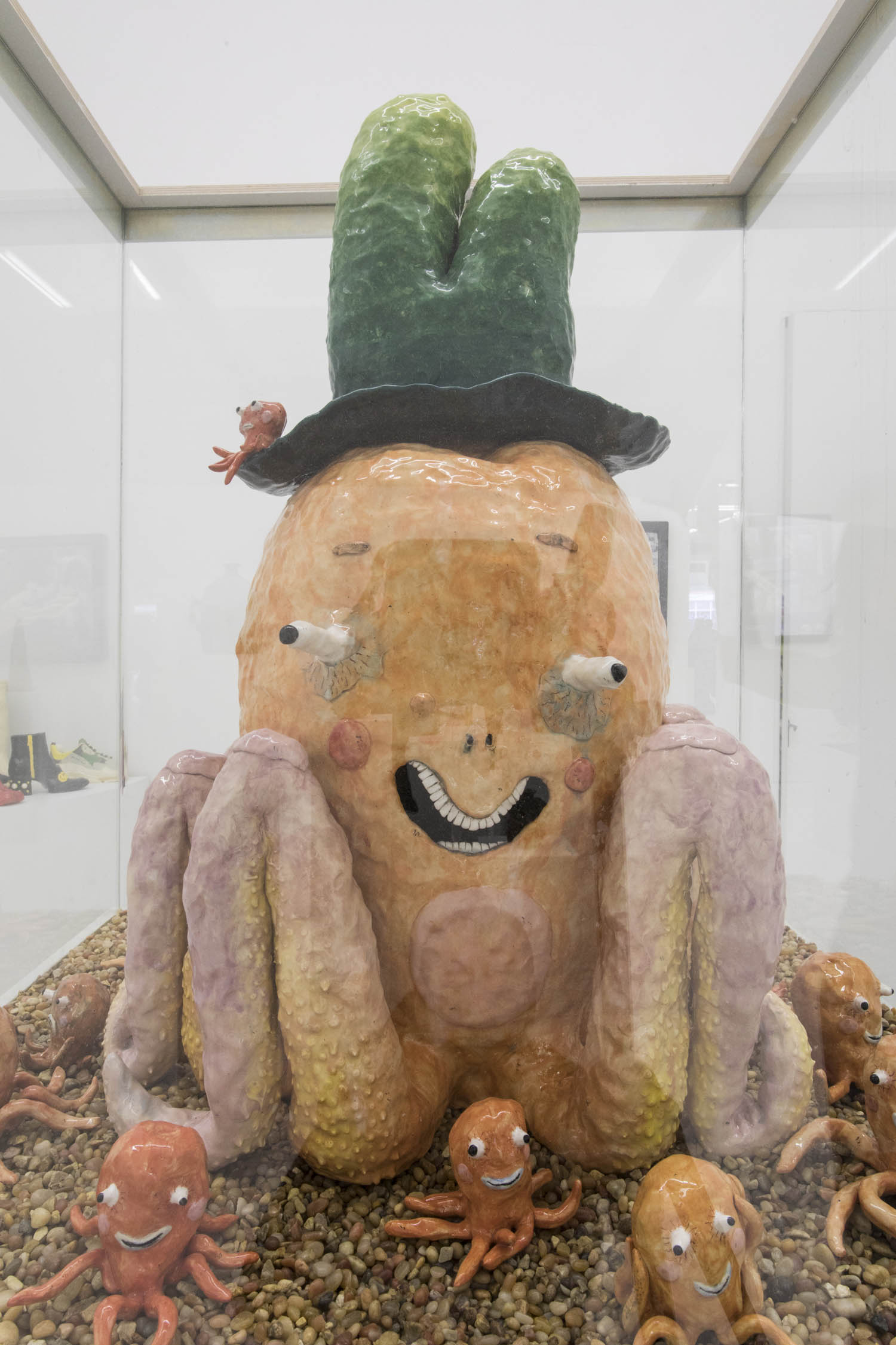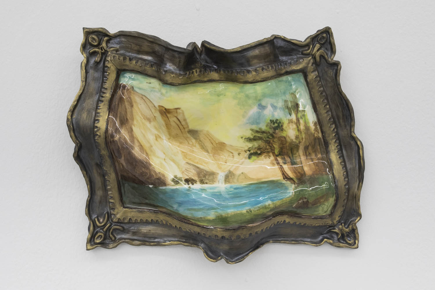 Then there are works that “immortalize” the everyday in clay: Rose Eken is not overly fussy in her recreation of objects in ceramic, here taking an evocatively impressionistic approach to horse stuff, from boots and whips to a bridle to a pile of poop. Diana Rojas sculpts her own exotic shoe collection as those sick Balenciaga Tripe S sneakers are just too expensive, while Jesse Edwards glazes realistic ceramic televisions with scenes of Morrissey and Alice in Wonderland, images burned into a screen permanently.