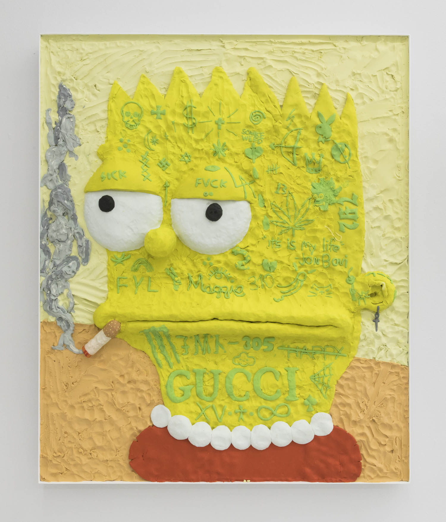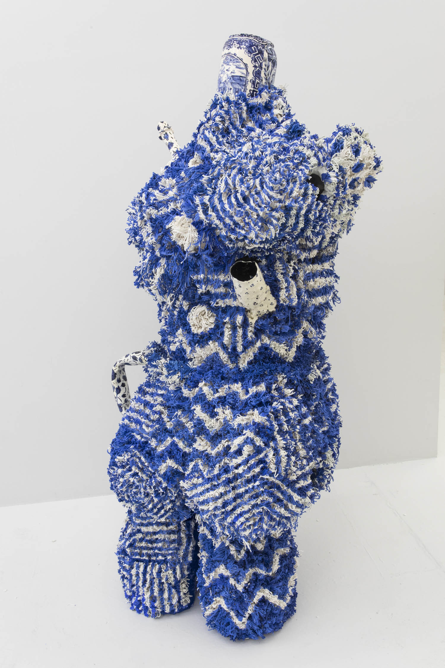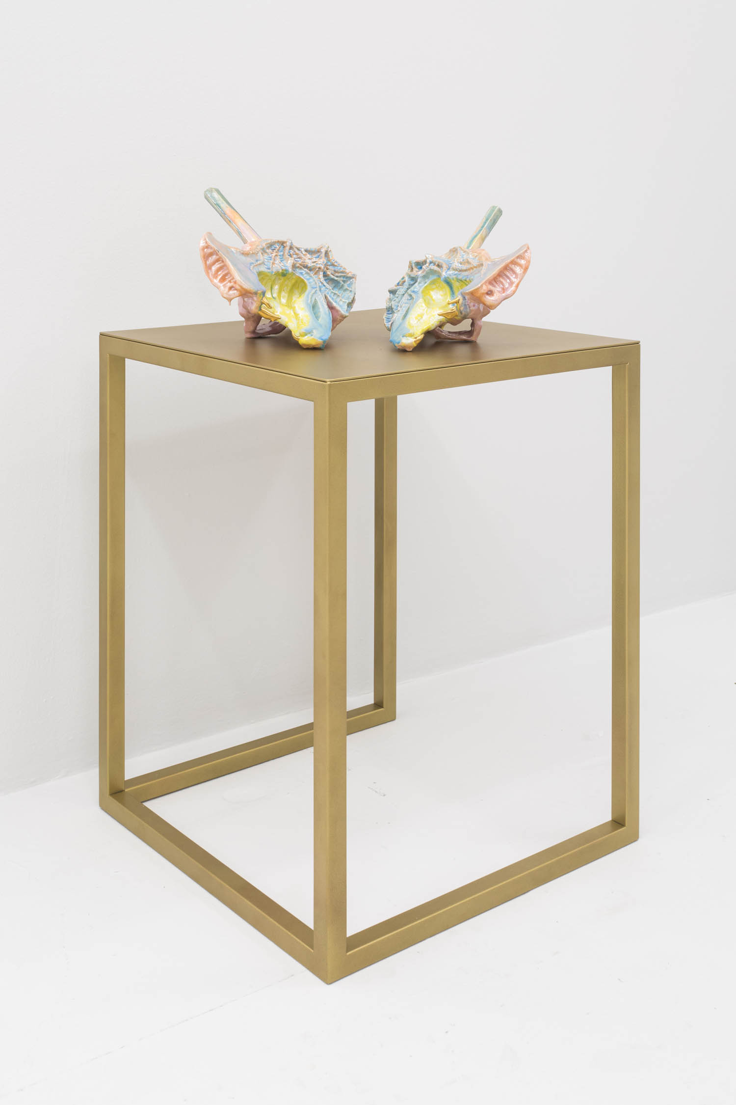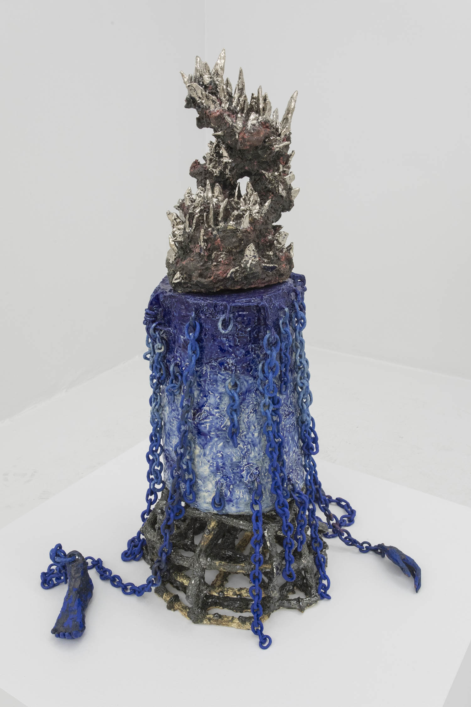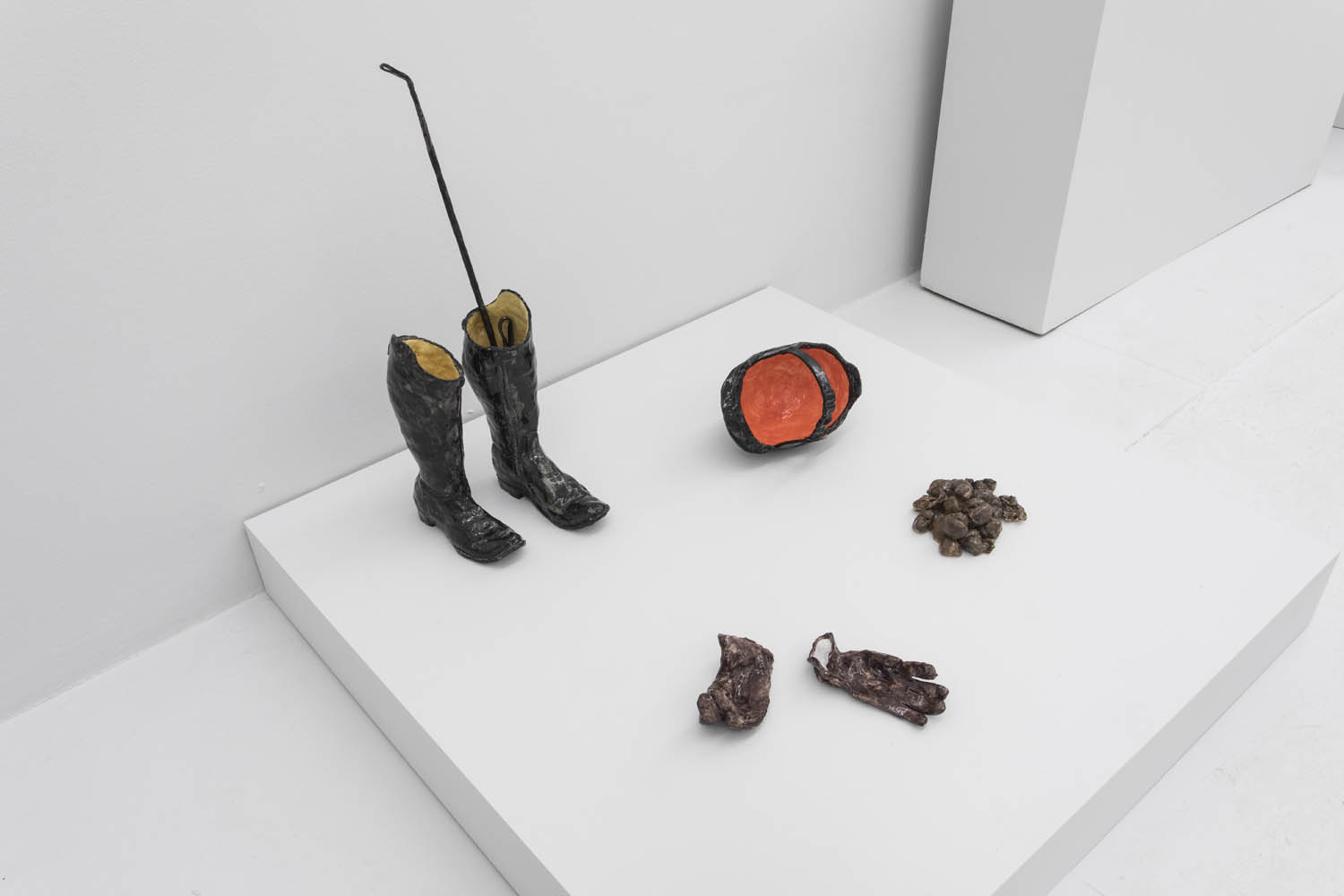 Then there are works that “immortalize” the everyday in clay: Rose Eken is not overly fussy in her recreation of objects in ceramic, here taking an evocatively impressionistic approach to horse stuff, from boots and whips to a bridle to a pile of poop. Diana Rojas sculpts her own exotic shoe collection as those sick Balenciaga Tripe S sneakers are just too expensive, while Jesse Edwards glazes realistic ceramic televisions with scenes of Morrissey and Alice in Wonderland, images burned into a screen permanently.
