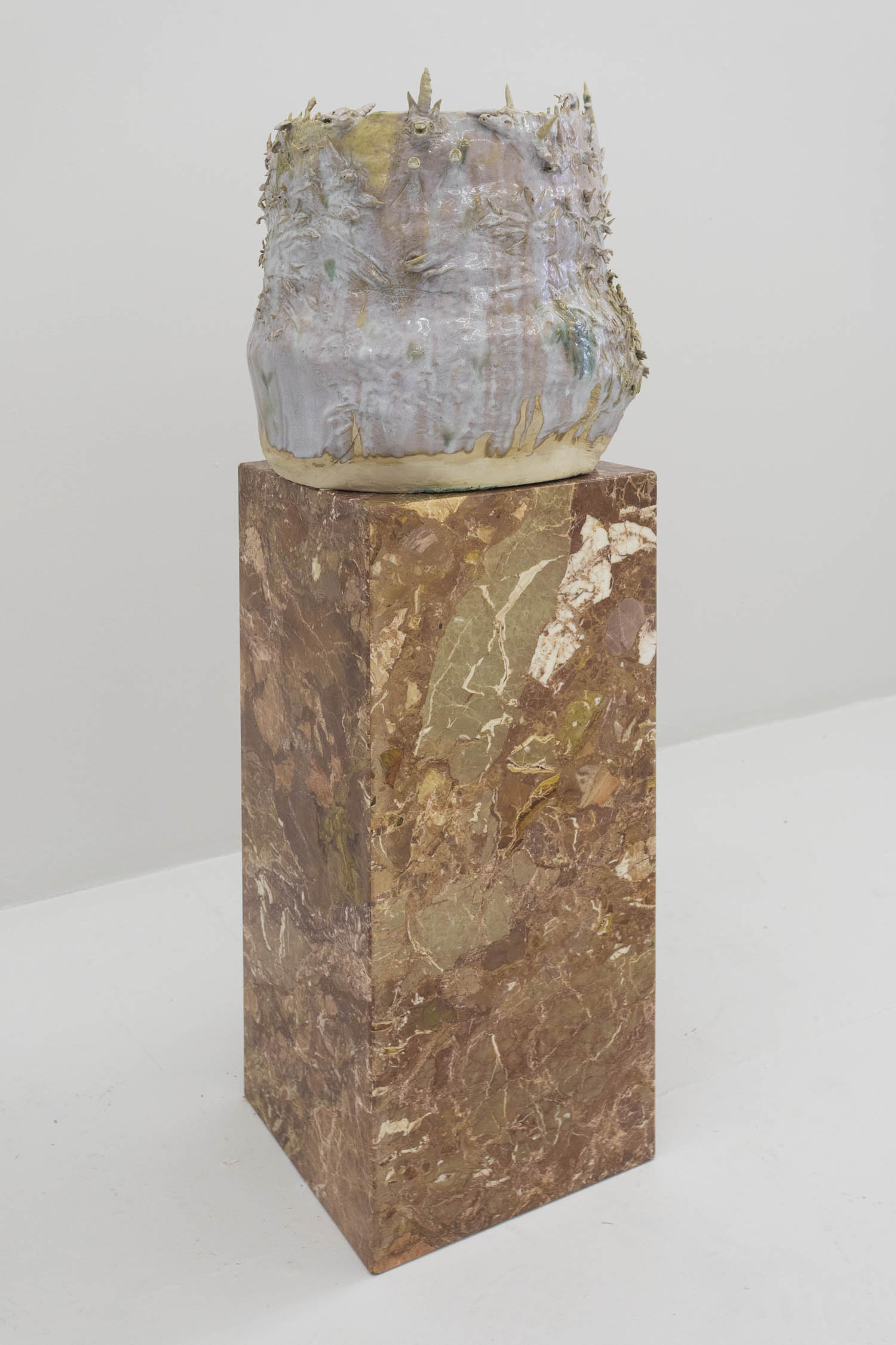 In the 2010s, the piling up of clay steadied. Slick fabrication has perhaps created this backlash in favor of the handmade and unique, and seeing ceramics by older much-loved artists like Ken Price or Betty Woodman go around the world in traveling museum retrospectives probably emboldens young artists to test their hand. The mutability and adaptability of the medium could also be seen as a great choice in times of cultural upheaval (LOL but what art isn’t?). Or it could just provide a cave-man escape getting mudded up to take us away from all the glowing screens.