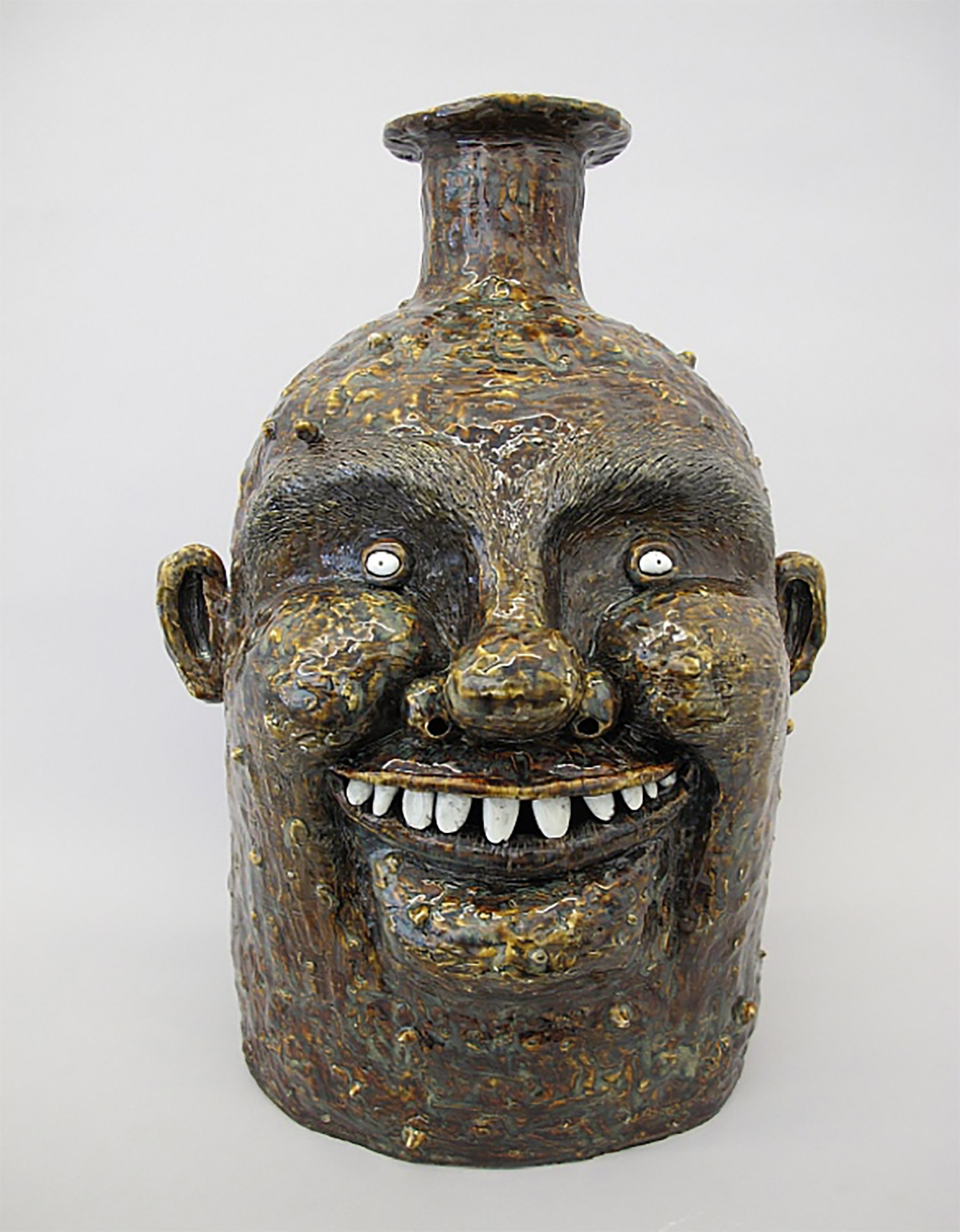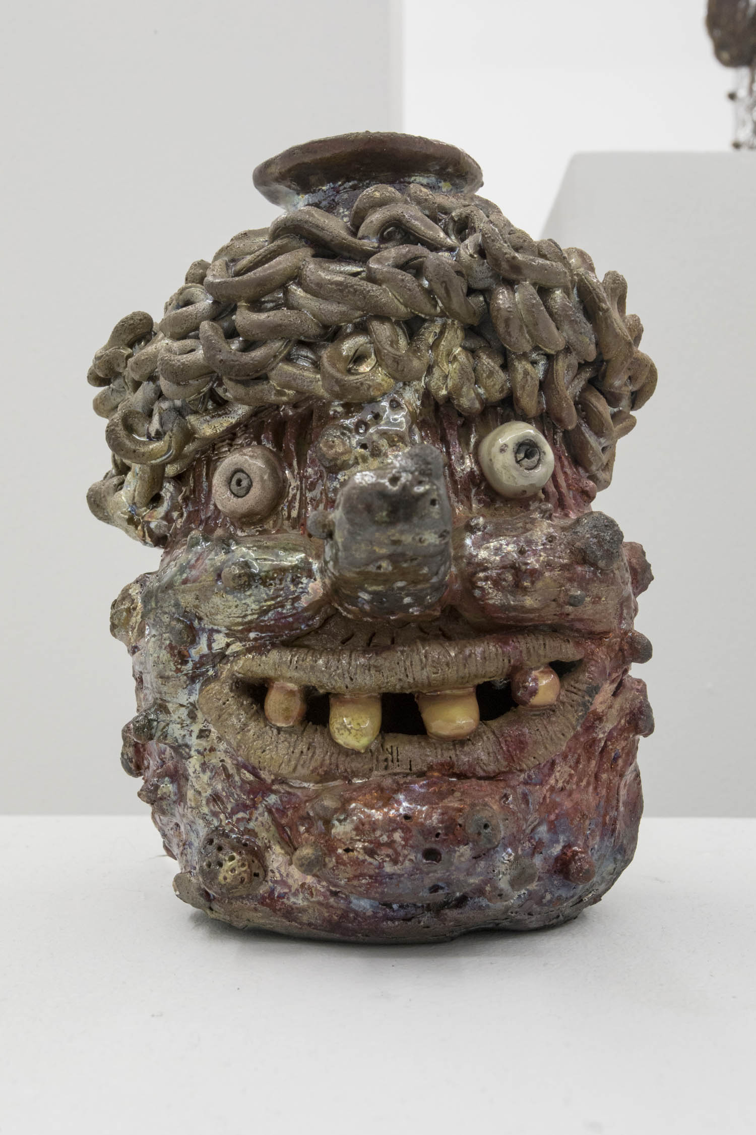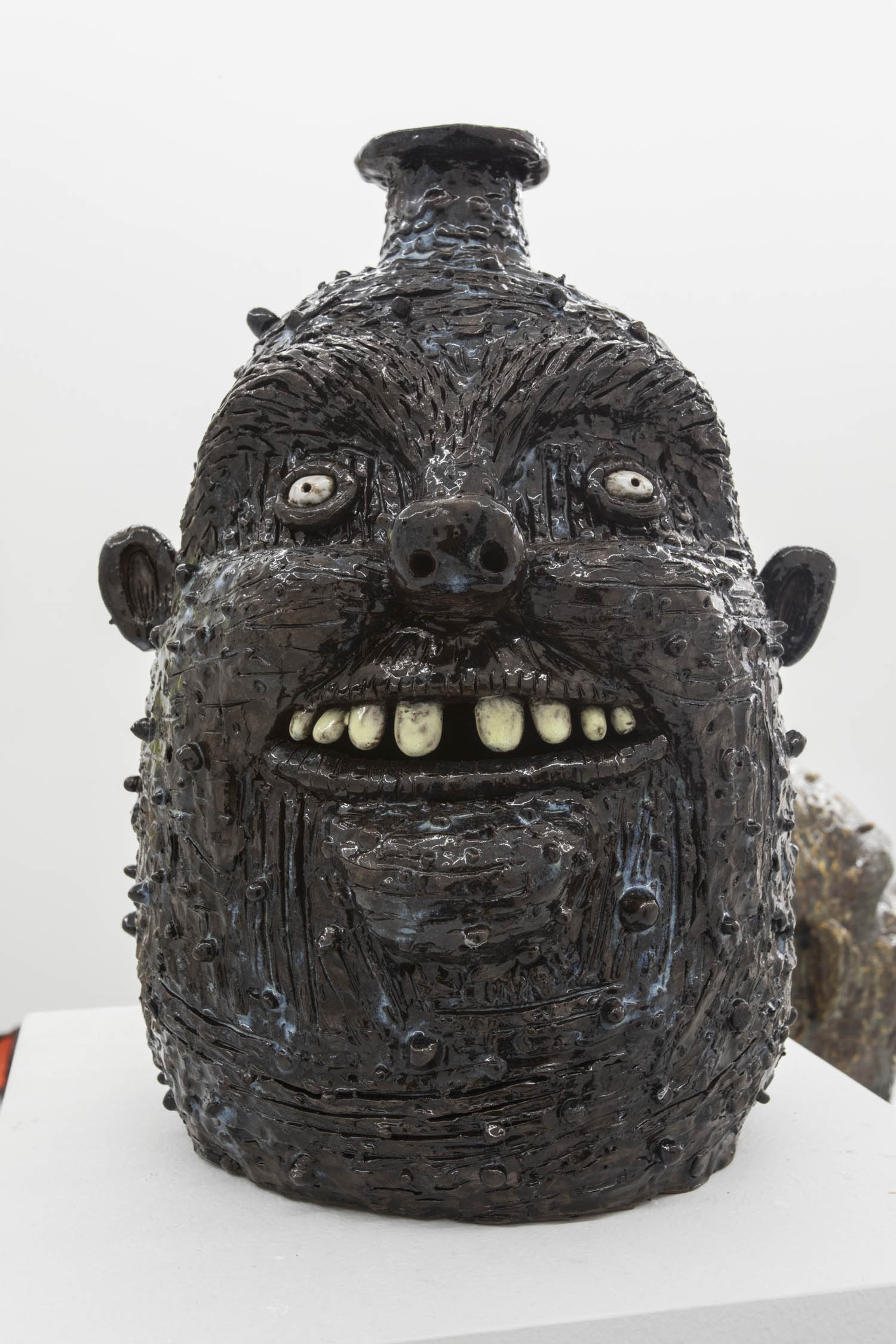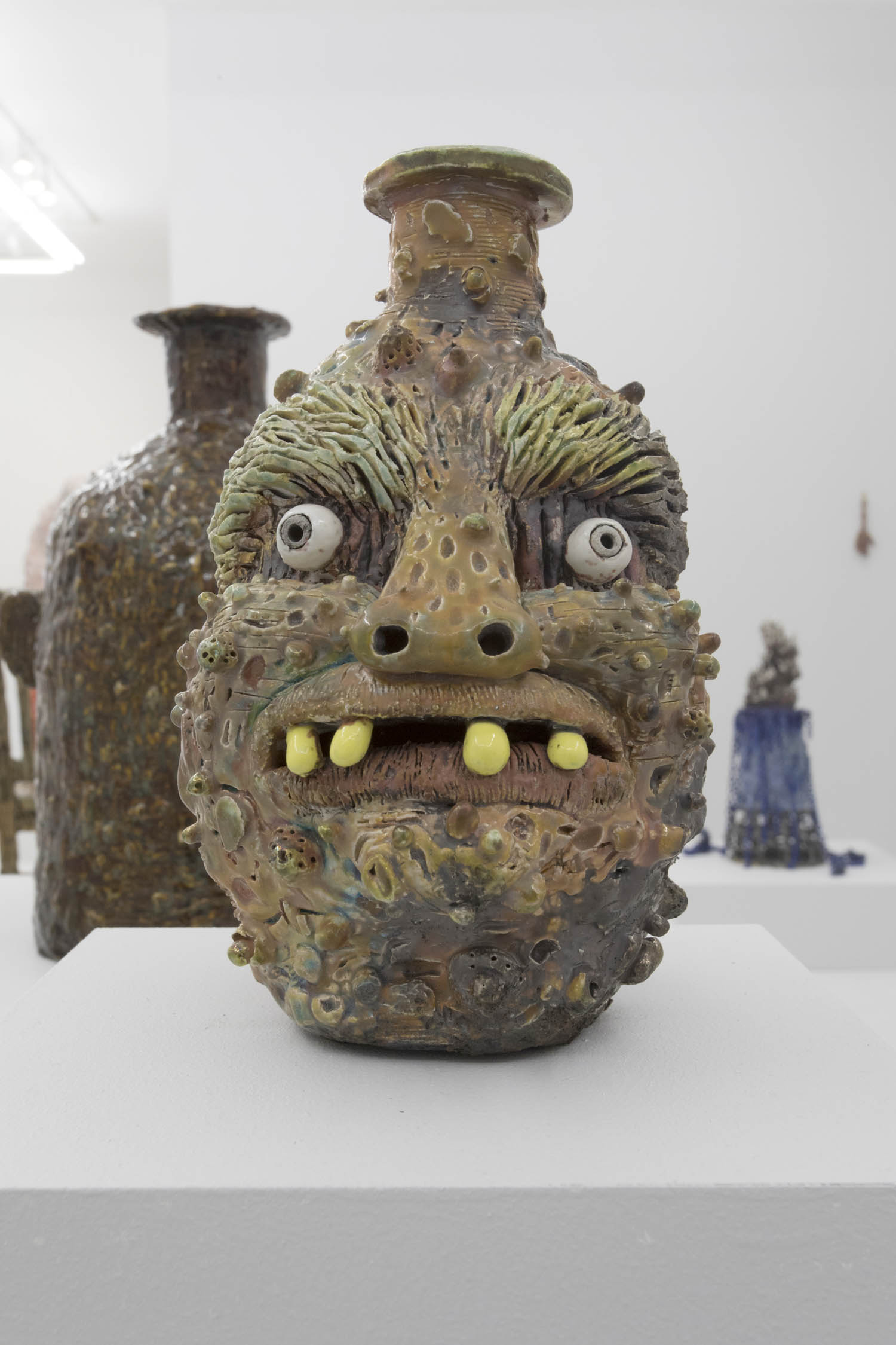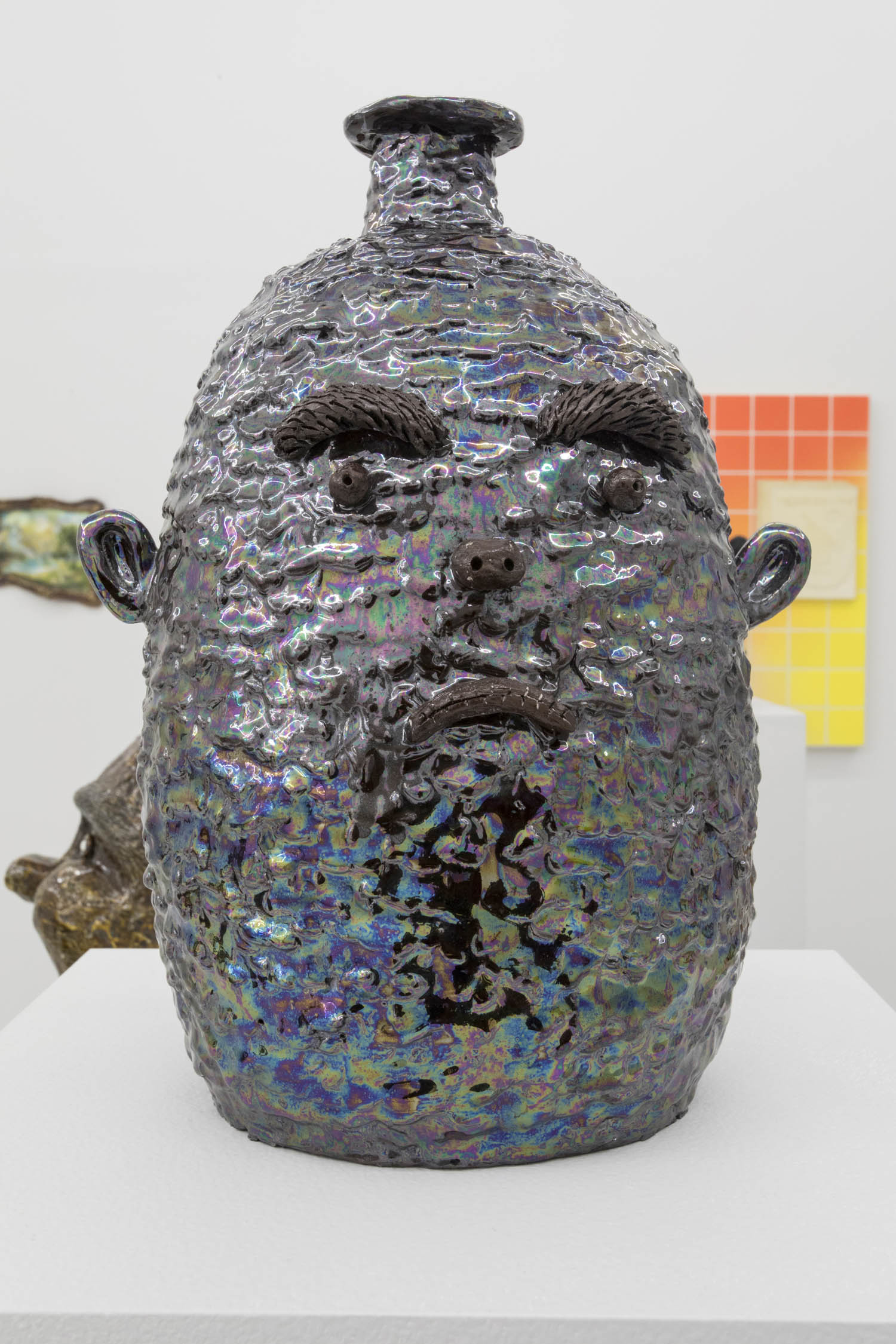 Clay can be inscrutably figurative as well– we find Dan McCarthy’s off-kilter face pot smiling damagedly at you, as do the beleaguered looking beauties by Jennie Jieun Lee. Cristina Tufino’s piece is literally a sphinx especially enigmatic behind giant sunglasses.