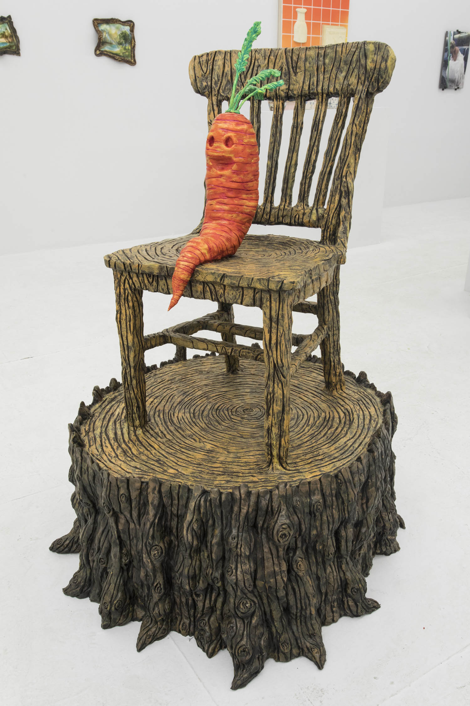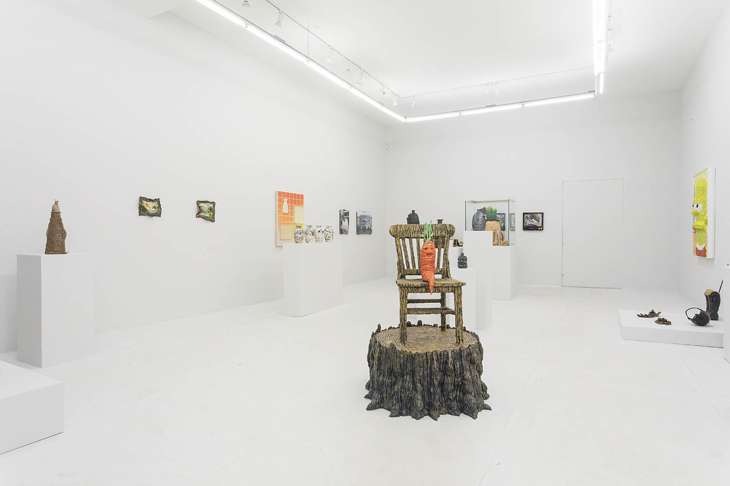 Pushing humor and idiosyncrasy even further would be Joakim Ojanen and his squid posse, Rebecca Morgan and her ugly pot people, Christian Vargas’ 200-member two-faced superhero army. FriendsWithYou’s Play-Doh-ish punk Bart Simpson has the defaced quality of a middle school desk while Theo Rosenblum places the most bizarrely enigmatic “King Carrot” in the middle of the gallery, epoxy clay painted in detail with acrylic paint.