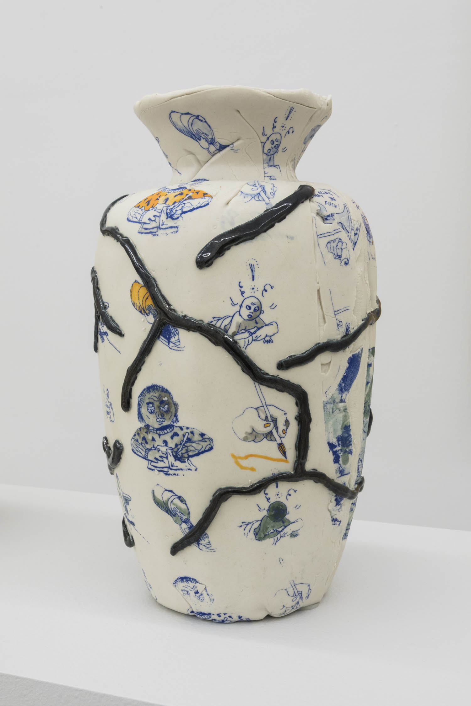 For ceramic as vessel, we have Jenny Hata Blumenfield assembling floppy failed pots into a wall piece with a silhouetted vessel overlaid. Trevor Baird contributes traditional enough vases but elaborately painted with comics and doodles, a sort of drawing/ceramic hybrid.