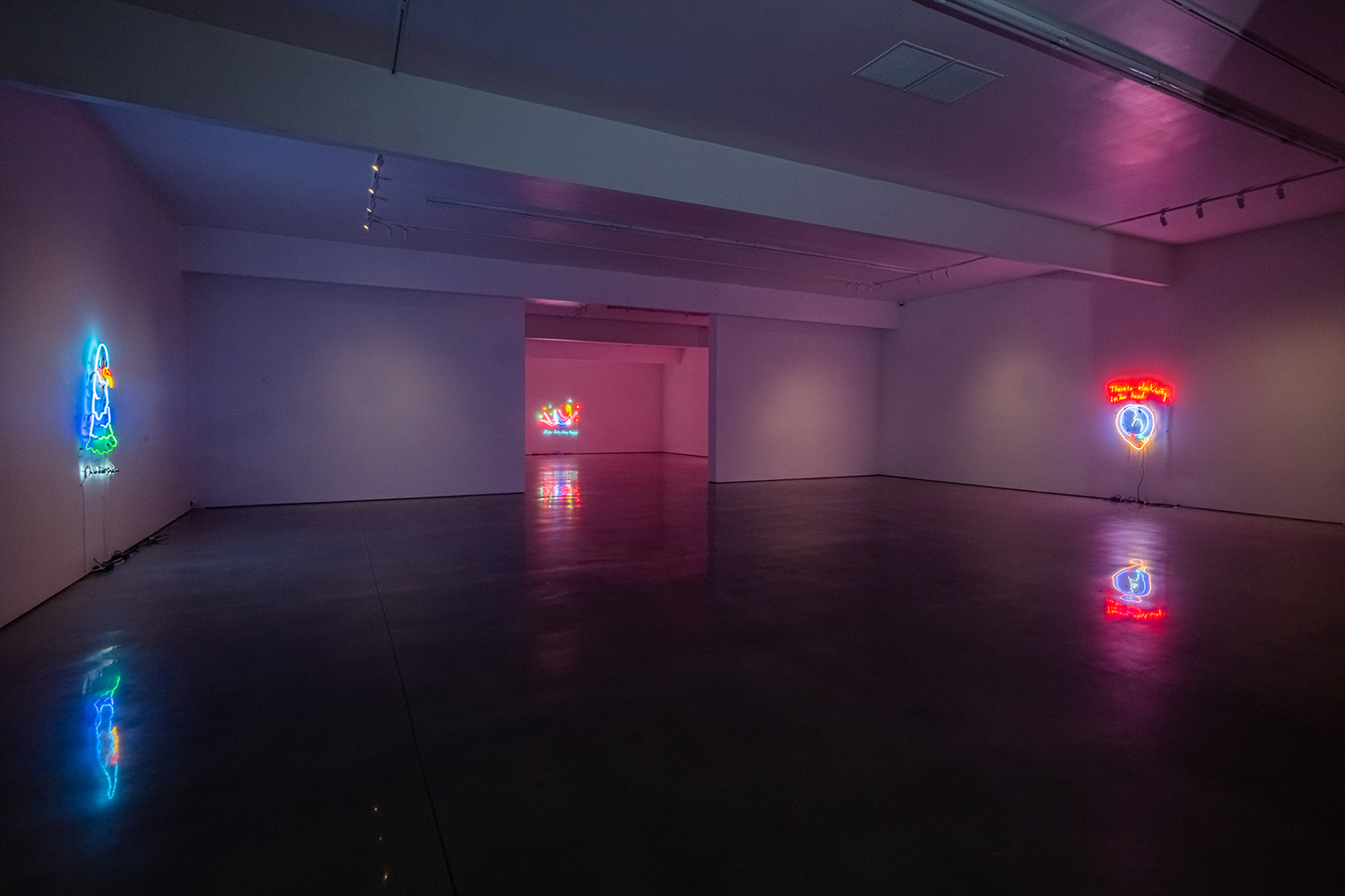 An illuminating lady offers some light at the end of the winter tunnel, tho perhaps quixotically: floating or falling in a sea of bubbles, she says, “we are doing a thing tonight.” This work brings us back to the reason Attoe has maintained a relationship to neon which is its ability to connote both Las Vegas seduction and an immediately legible middlebrow appeal (as a material, the stuff is ubiquitous). There might be tantalizing possibilities in “a thing,” but the casual non-specificity of the proposition hints that we’re likely better off skipping it.