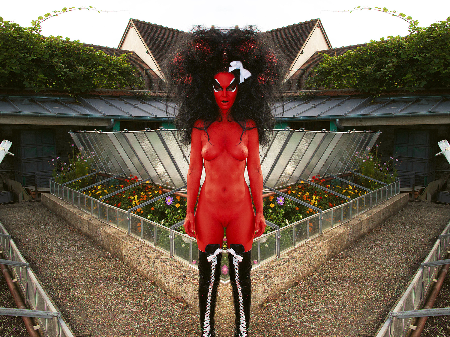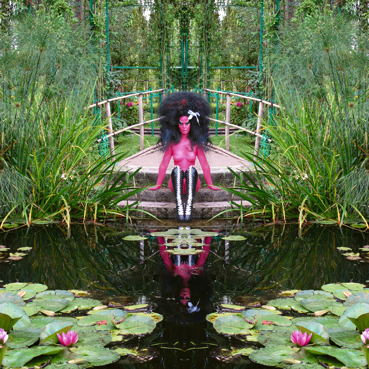 In 2010, E.V. Day was awarded the Munn Artists Residency by the Versailles Foundation, to live on Monet’s famous estate in Giverny, and to be inspired by the gardens. She invited artist Kembra Pfahler to come to Giverny in August—the most fecund, riotous month—to achieve a collaborative project that blends Kembra’s signature performance attire with the lush verdure of the natural setting and E.V.’s signature refracted photography.
