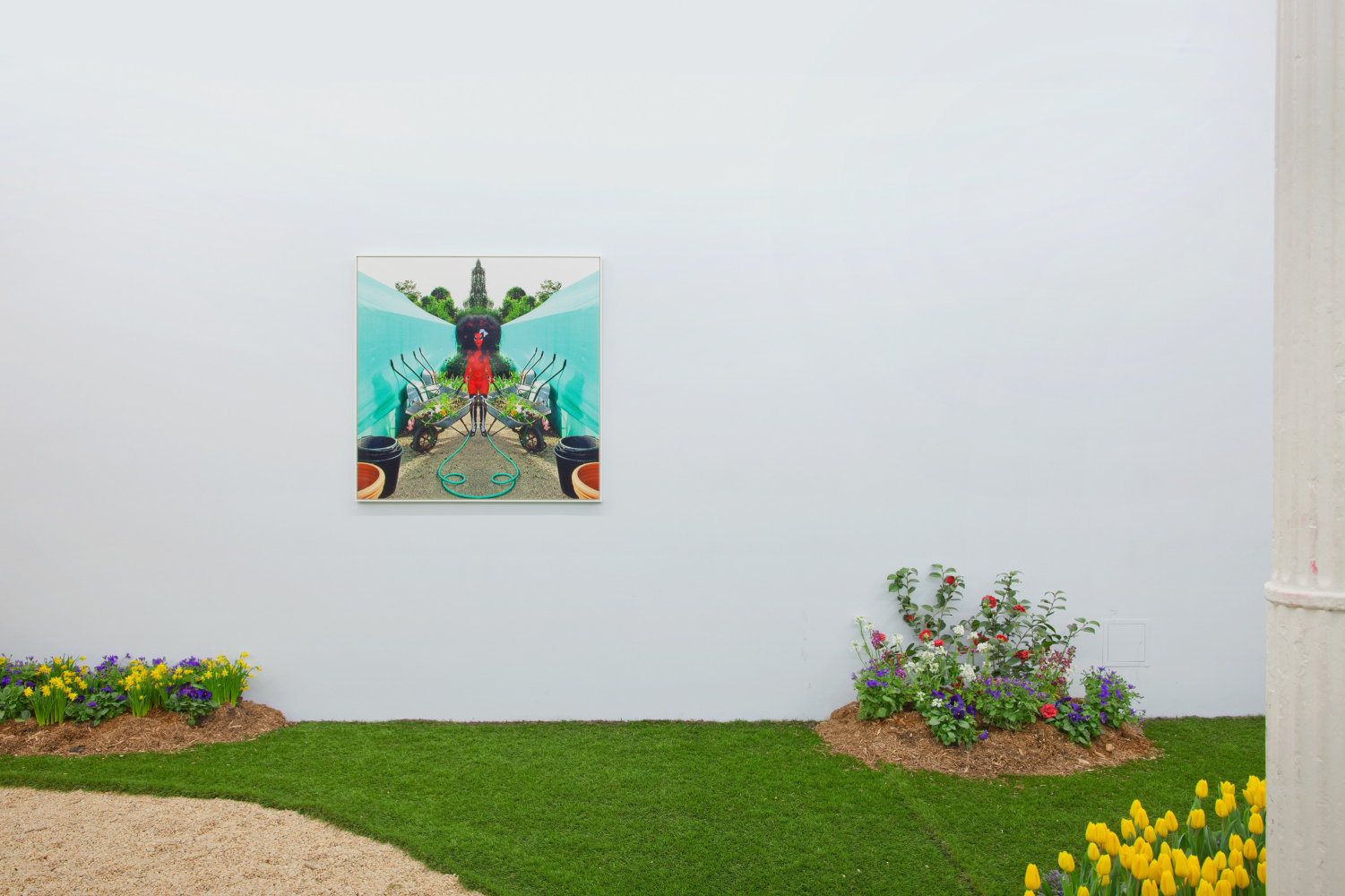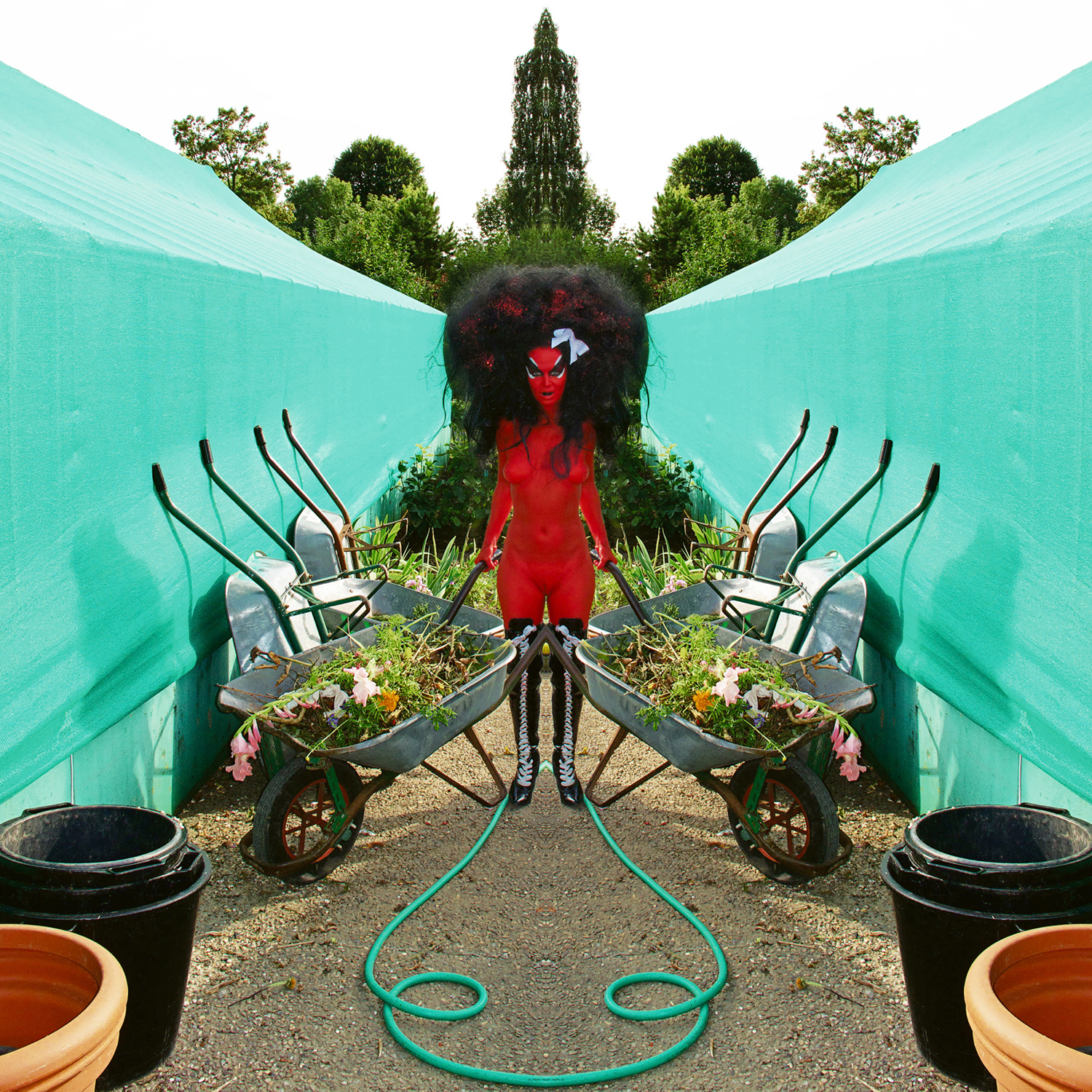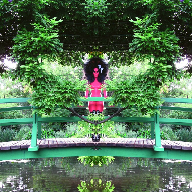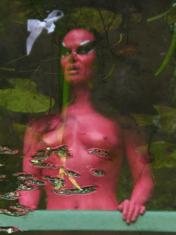 Science and sex are present in this exhibition, as E.V. digitally fictionalizes and manipulates her space. Mimicking the inverted world of the pond’s surface reflections, she bifurcates, splays and refracts her images. Shooting in both the Clos Normand and the Japanese water garden, these artworks complexify the position of objectifier and objectified and explore voyeurism and power. In the same way that Kembra mixes sex and power, beauty and horror, the works hint at the possibility of a bizarre and titillating new sexuality. Perhaps like a water lily itself: solitary, bisexual and radial.