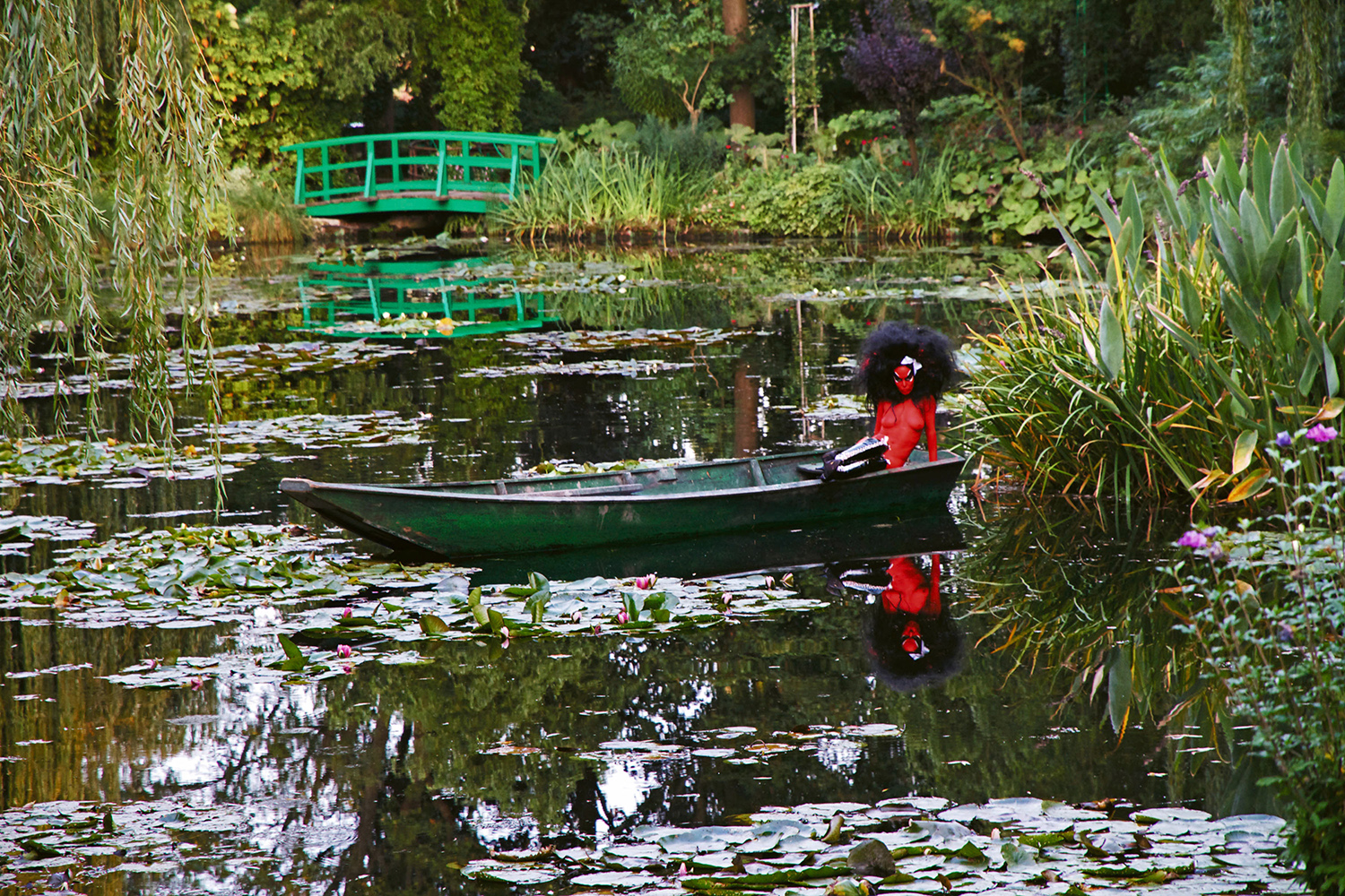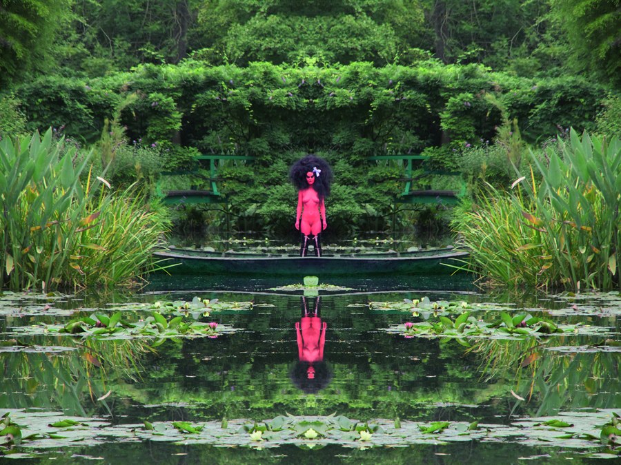 Kembra’s attire, or rather the body-painted and bewigged look that is more sculpture than costuming, presents an interesting alien injection into the almost Disneyland-esque, iconic landscape of Giverny. Her anti-naturalist image is in many ways at odds with the natural growths and overflows. But oddly, as we see in their artworks, this is not so aberrant as one might think: the gardens themselves are in many ways a controlled and sculpted landscape, an illusion of chaos, as Monet coordinated the colors of the plants, and had the gardeners clean soot from passing trains off the lily pads every day. The gardens are a national treasure, a historic landmark frozen in time since Monet lived in a small cottage there and meticulously created a huge, living still life to paint from. Paradoxically, every splash of shrubbery is “just so”, each tulip in place, and it is not too far fetched to imagine a gardener spotting a bug cross the path and putting the bug back into its proper place.