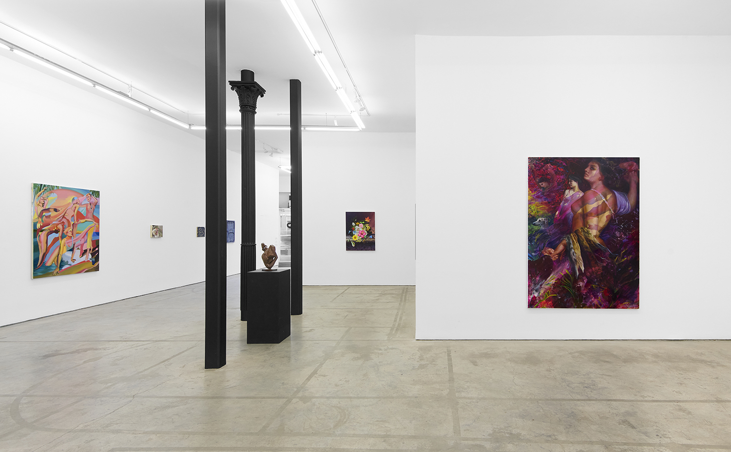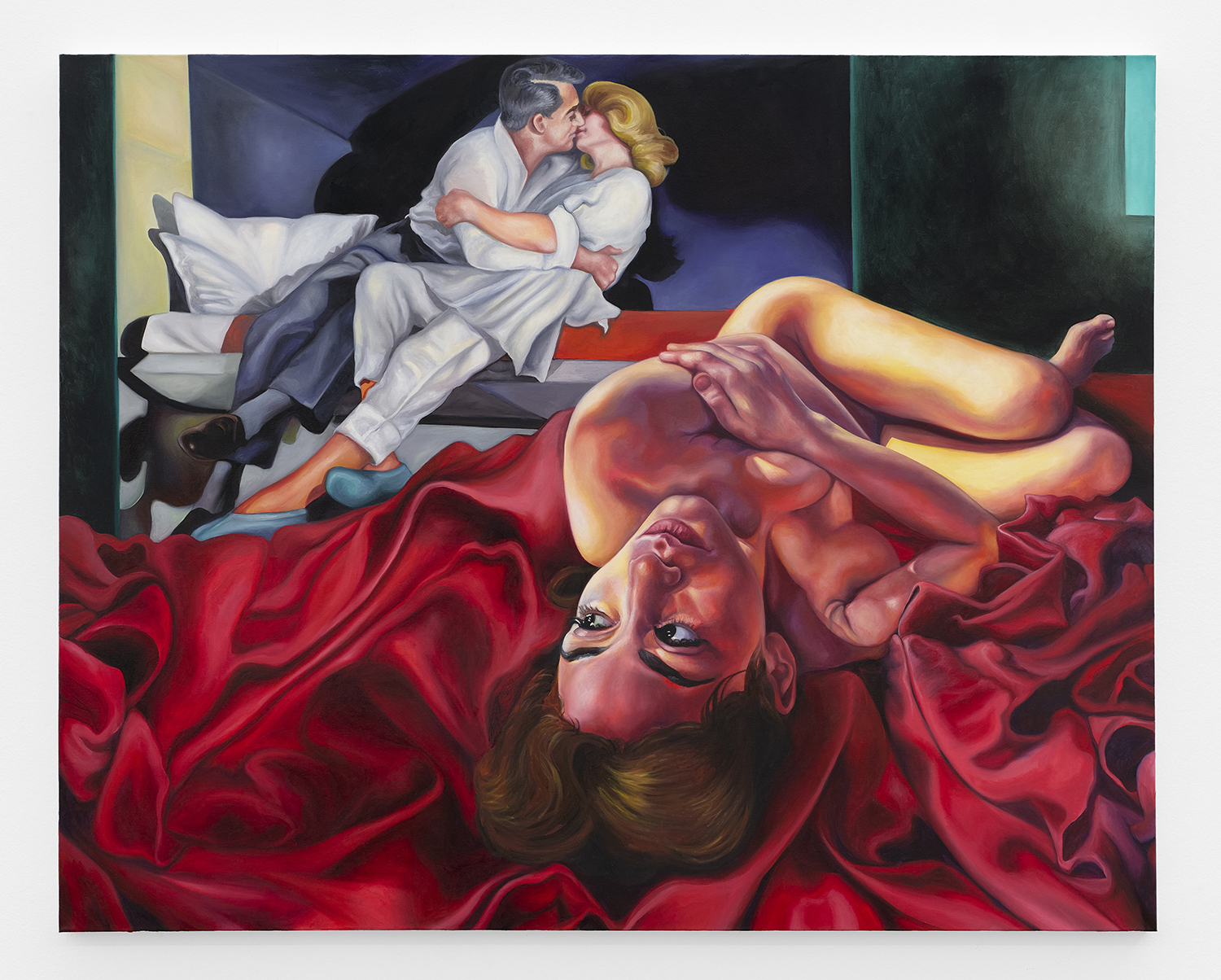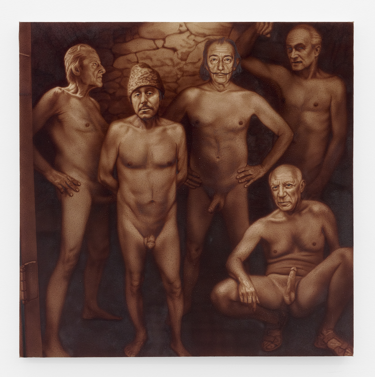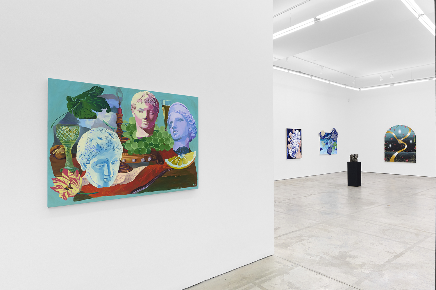 Across thirty-one paintings and sculptures we see artists pulling from film, music, art history and performance filtered through the artist's personal lenses. In Adam Parker Smith “The Abduction of Proserpina” Bernini’s iconic Carrara marble sculpture is seemingly squashed down into a bronze cube. The ankle-height dogs in the original now are cheek-to-cheek with Pluto and Proserpina in an almost comedic crumpling of the iconic original. The take-down of Art History continues in Alexandra Rubenstein’s “Bad Blood” painted in pig's blood, compositionally inspired by Pablo Picasso’s “Les Demoiselles d’Avignon”. Here instead of depicting five female prostitutes she paints male artists in the buff—Picasso bottom right, Gauguin in a Russian fur hat, Dalí and Freud right behind—her accompanying audio clip exposing the problematic backgrounds of the male “masters” of art history.