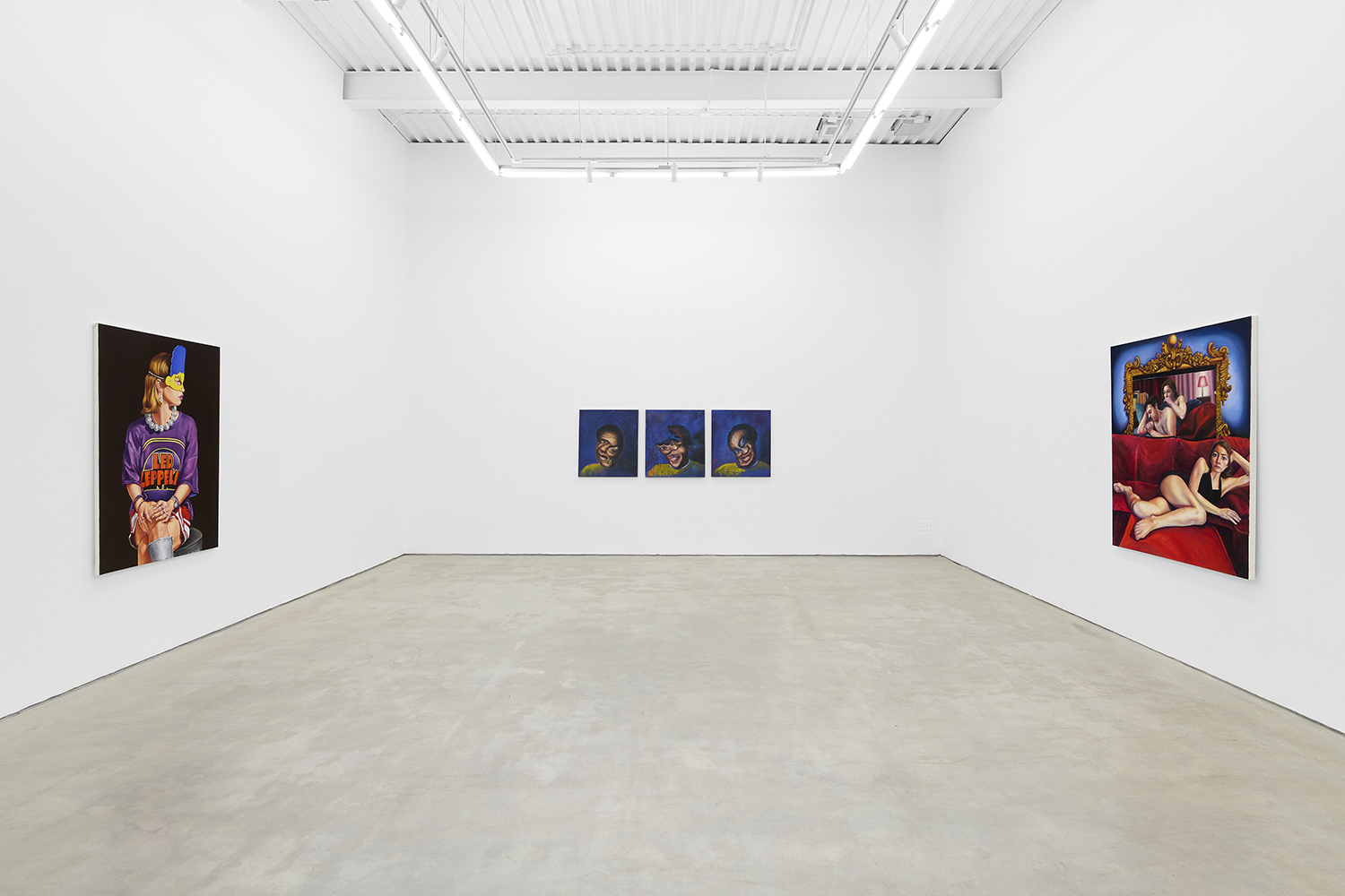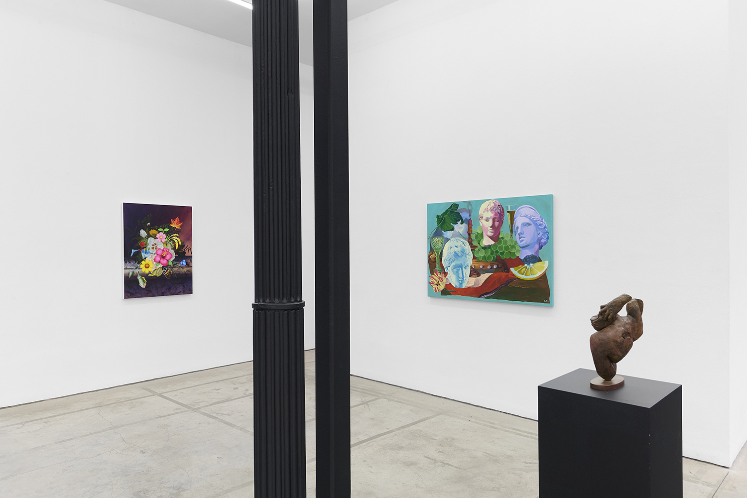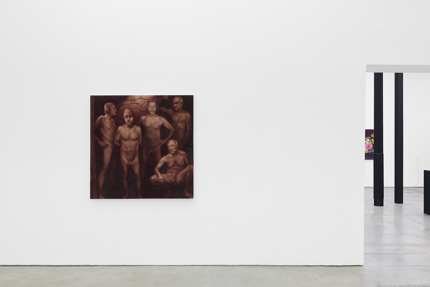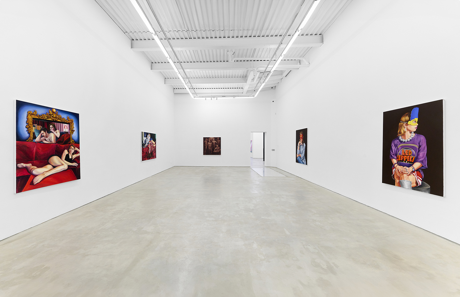 Across thirty-one paintings and sculptures we see artists pulling from film, music, art history and performance filtered through the artist's personal lenses. In Adam Parker Smith “The Abduction of Proserpina” Bernini’s iconic Carrara marble sculpture is seemingly squashed down into a bronze cube. The ankle-height dogs in the original now are cheek-to-cheek with Pluto and Proserpina in an almost comedic crumpling of the iconic original. The take-down of Art History continues in Alexandra Rubenstein’s “Bad Blood” painted in pig's blood, compositionally inspired by Pablo Picasso’s “Les Demoiselles d’Avignon”. Here instead of depicting five female prostitutes she paints male artists in the buff—Picasso bottom right, Gauguin in a Russian fur hat, Dalí and Freud right behind—her accompanying audio clip exposing the problematic backgrounds of the male “masters” of art history.