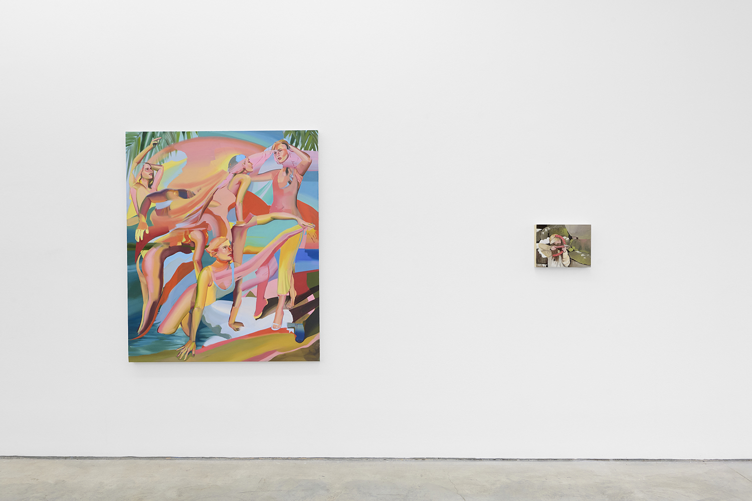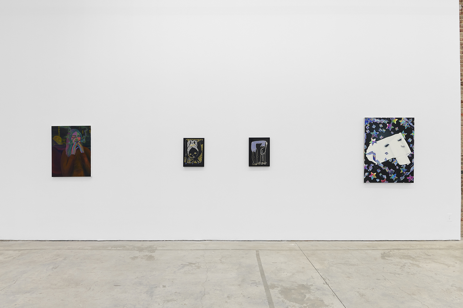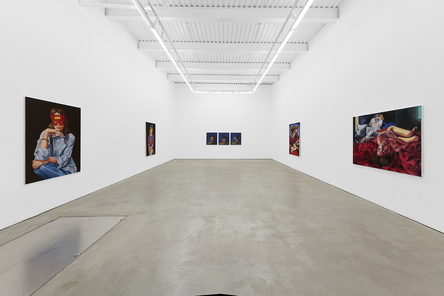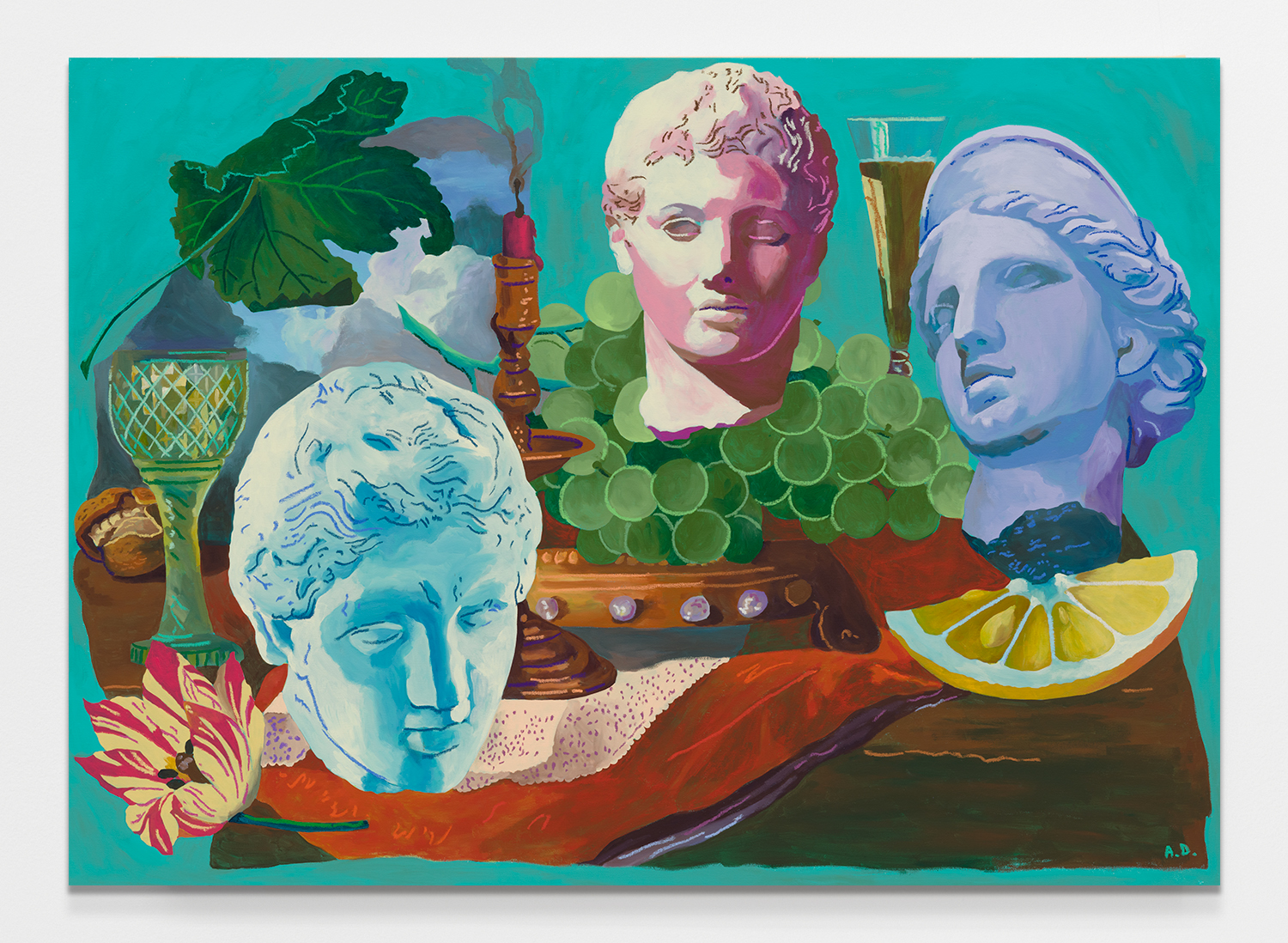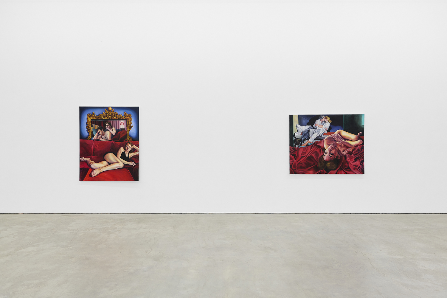 Across thirty-one paintings and sculptures we see artists pulling from film, music, art history and performance filtered through the artist's personal lenses. In Adam Parker Smith “The Abduction of Proserpina” Bernini’s iconic Carrara marble sculpture is seemingly squashed down into a bronze cube. The ankle-height dogs in the original now are cheek-to-cheek with Pluto and Proserpina in an almost comedic crumpling of the iconic original. The take-down of Art History continues in Alexandra Rubenstein’s “Bad Blood” painted in pig's blood, compositionally inspired by Pablo Picasso’s “Les Demoiselles d’Avignon”. Here instead of depicting five female prostitutes she paints male artists in the buff—Picasso bottom right, Gauguin in a Russian fur hat, Dalí and Freud right behind—her accompanying audio clip exposing the problematic backgrounds of the male “masters” of art history.