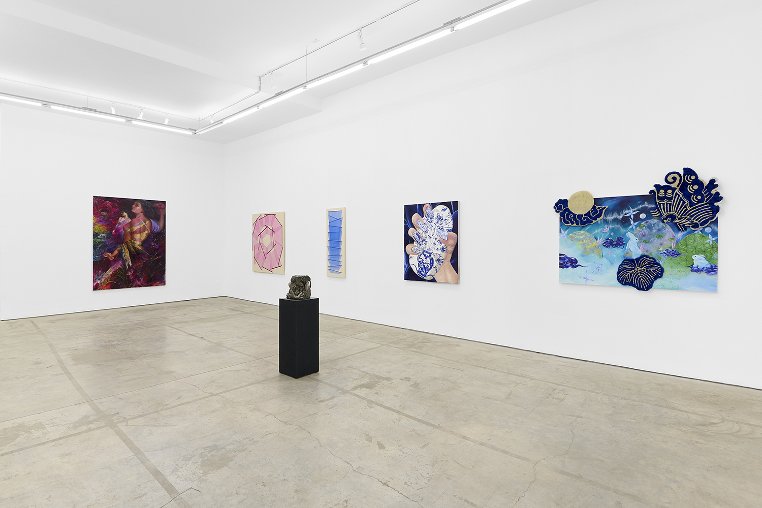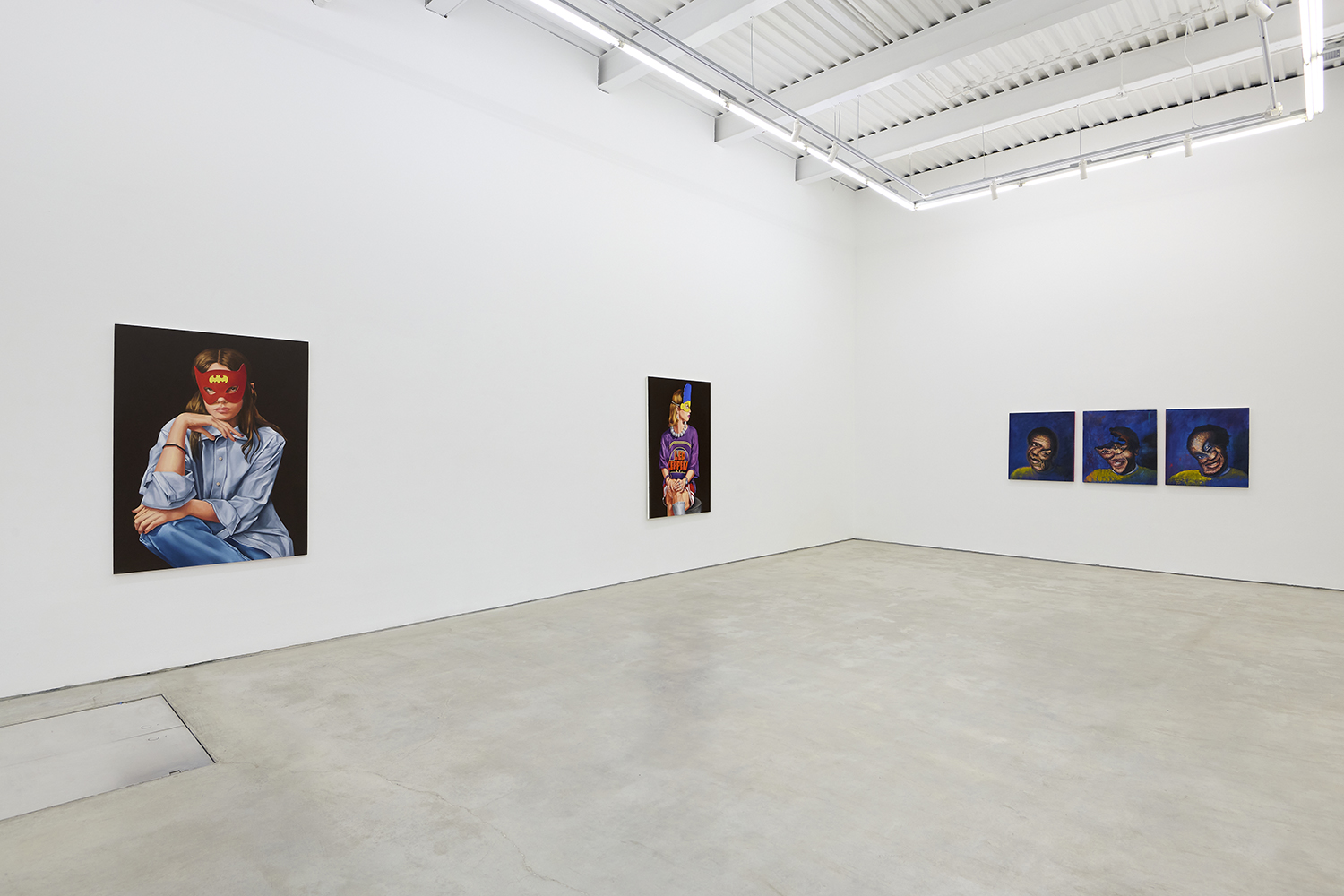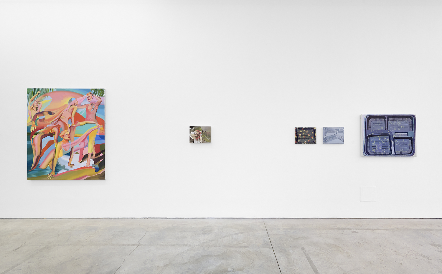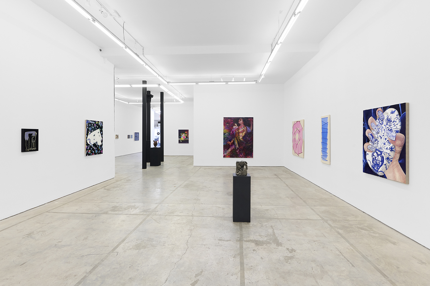 Across thirty-one paintings and sculptures we see artists pulling from film, music, art history and performance filtered through the artist's personal lenses. In Adam Parker Smith “The Abduction of Proserpina” Bernini’s iconic Carrara marble sculpture is seemingly squashed down into a bronze cube. The ankle-height dogs in the original now are cheek-to-cheek with Pluto and Proserpina in an almost comedic crumpling of the iconic original. The take-down of Art History continues in Alexandra Rubenstein’s “Bad Blood” painted in pig's blood, compositionally inspired by Pablo Picasso’s “Les Demoiselles d’Avignon”. Here instead of depicting five female prostitutes she paints male artists in the buff—Picasso bottom right, Gauguin in a Russian fur hat, Dalí and Freud right behind—her accompanying audio clip exposing the problematic backgrounds of the male “masters” of art history.