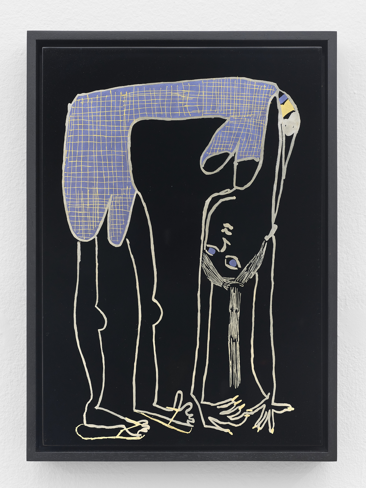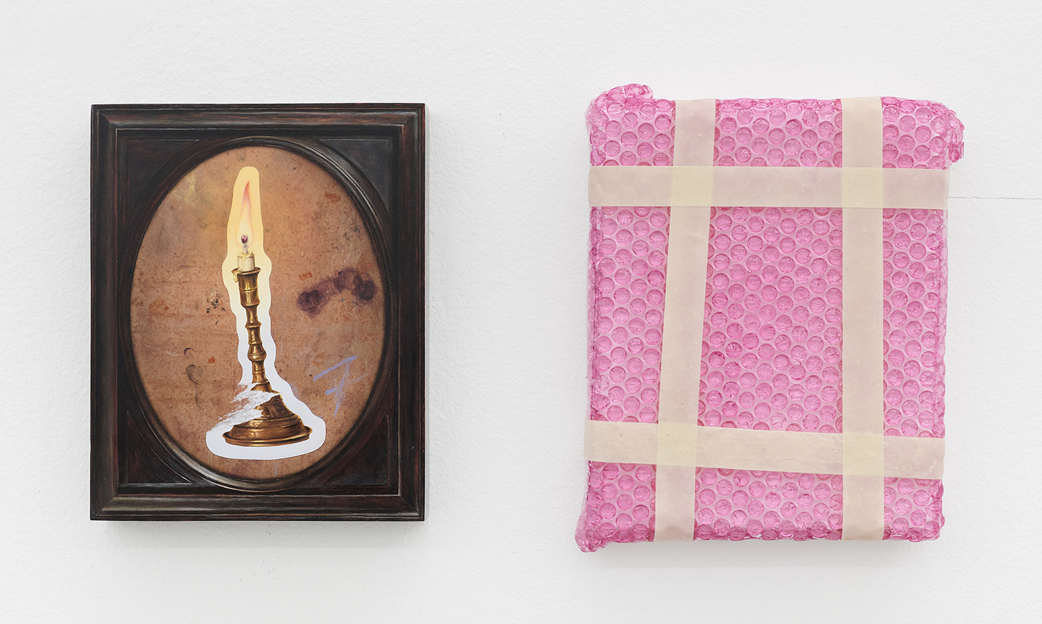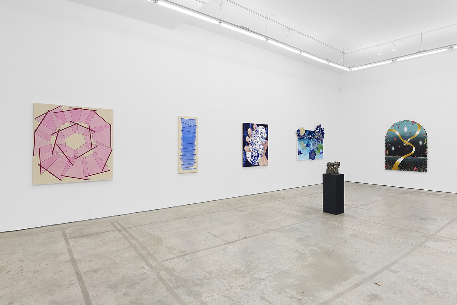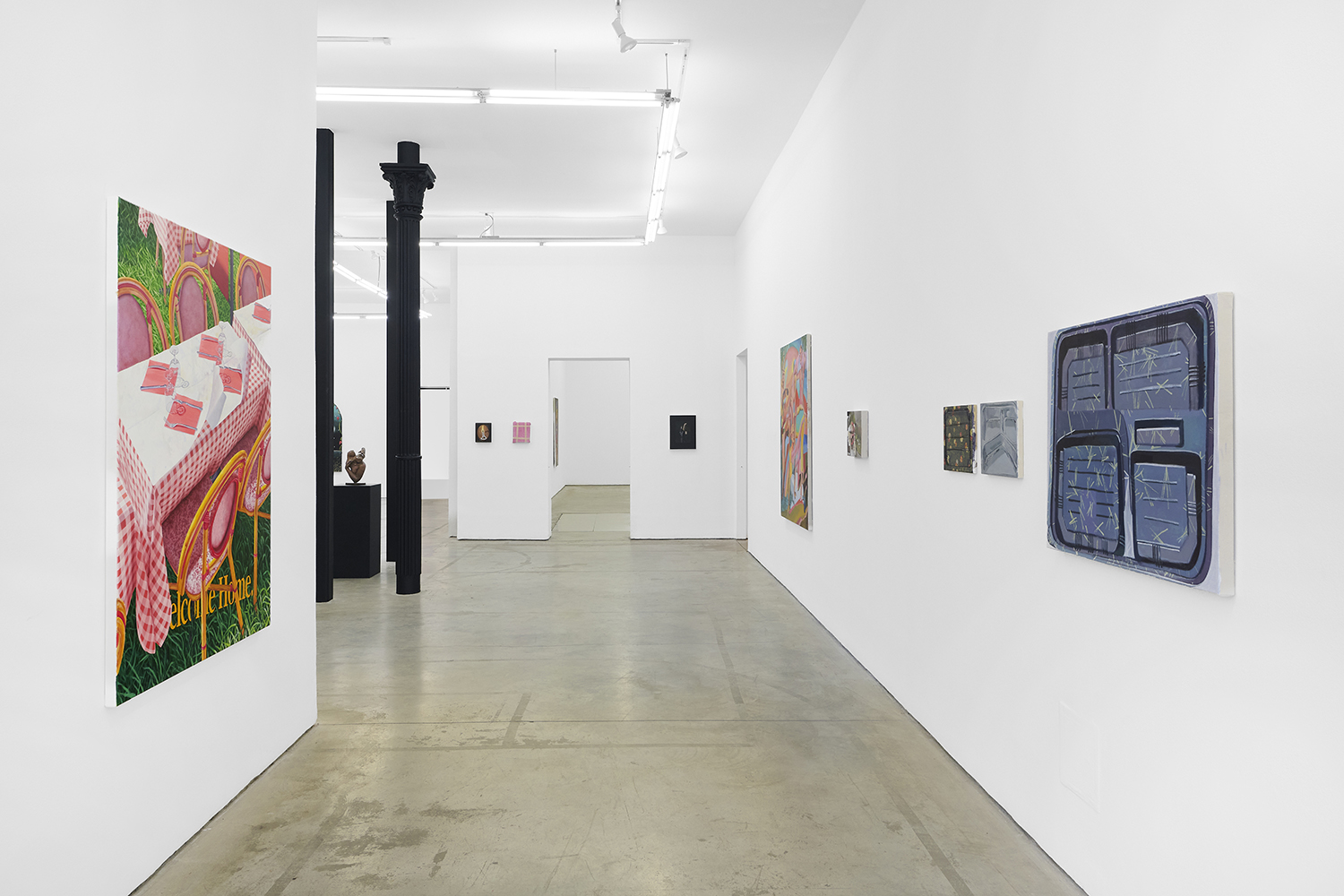 Across thirty-one paintings and sculptures we see artists pulling from film, music, art history and performance filtered through the artist's personal lenses. In Adam Parker Smith “The Abduction of Proserpina” Bernini’s iconic Carrara marble sculpture is seemingly squashed down into a bronze cube. The ankle-height dogs in the original now are cheek-to-cheek with Pluto and Proserpina in an almost comedic crumpling of the iconic original. The take-down of Art History continues in Alexandra Rubenstein’s “Bad Blood” painted in pig's blood, compositionally inspired by Pablo Picasso’s “Les Demoiselles d’Avignon”. Here instead of depicting five female prostitutes she paints male artists in the buff—Picasso bottom right, Gauguin in a Russian fur hat, Dalí and Freud right behind—her accompanying audio clip exposing the problematic backgrounds of the male “masters” of art history.