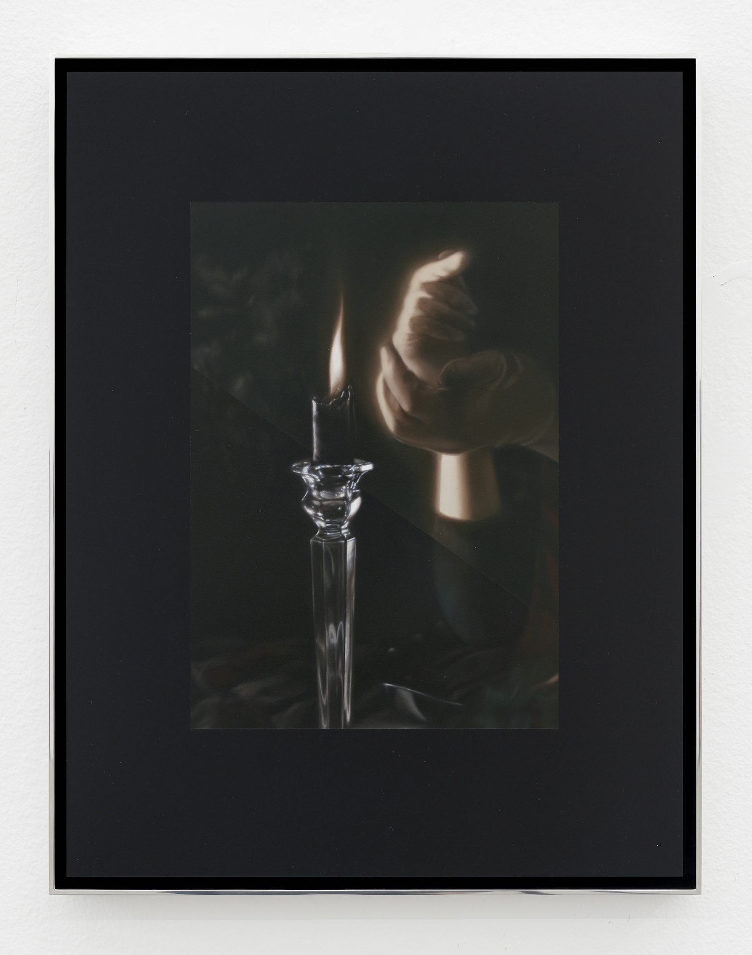 Andrew Sendor, Salome tells Apollo about the killer and urges him to stay inside his tent, 2025, oil on matte black plexiglass in welded aluminum frame with polished face, brushed sides and black powder coat interior, 18 x 14 inches, 46 x 36 cm.