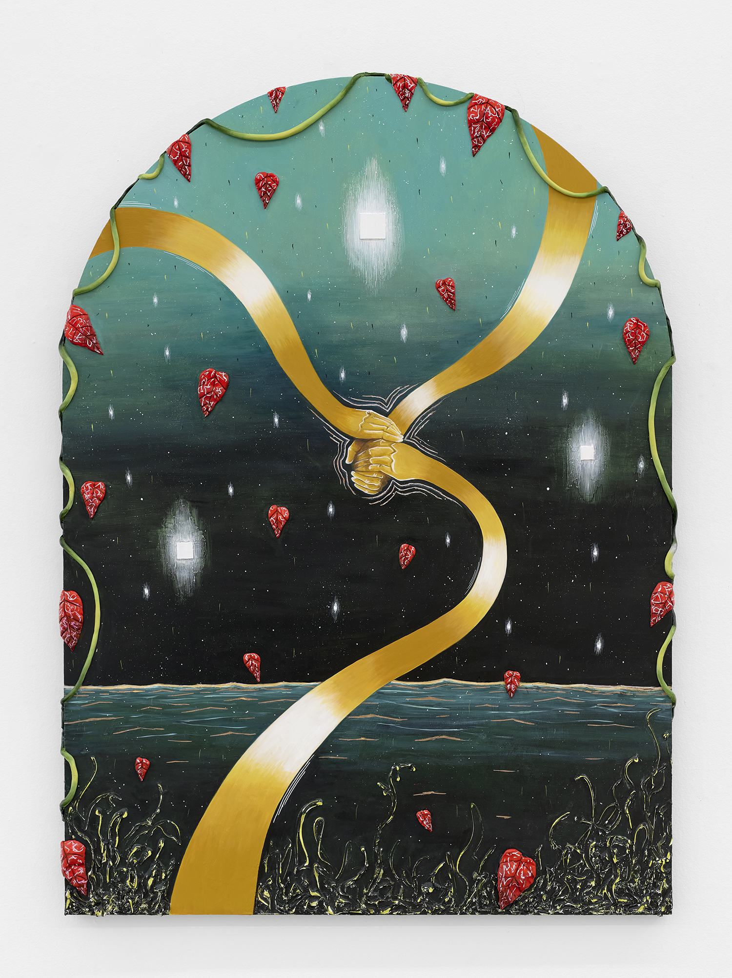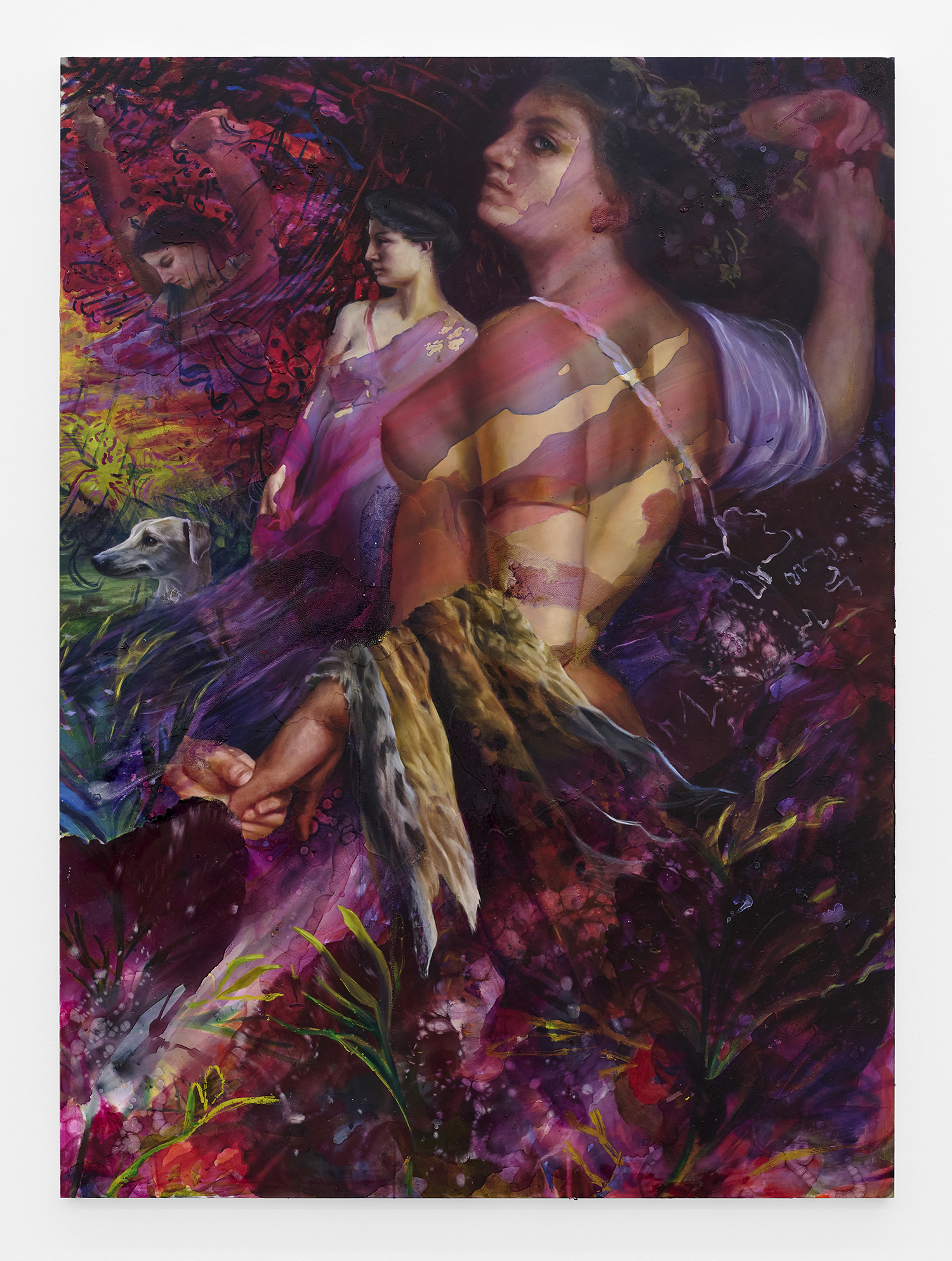 Angela Fraleigh, I Want You Wild, 2025, oil, acrylic, moon water, amethyst, sugilite, tiger’s eye on Dibond pane, 78 x 57 inches, 198 x 145 cm.