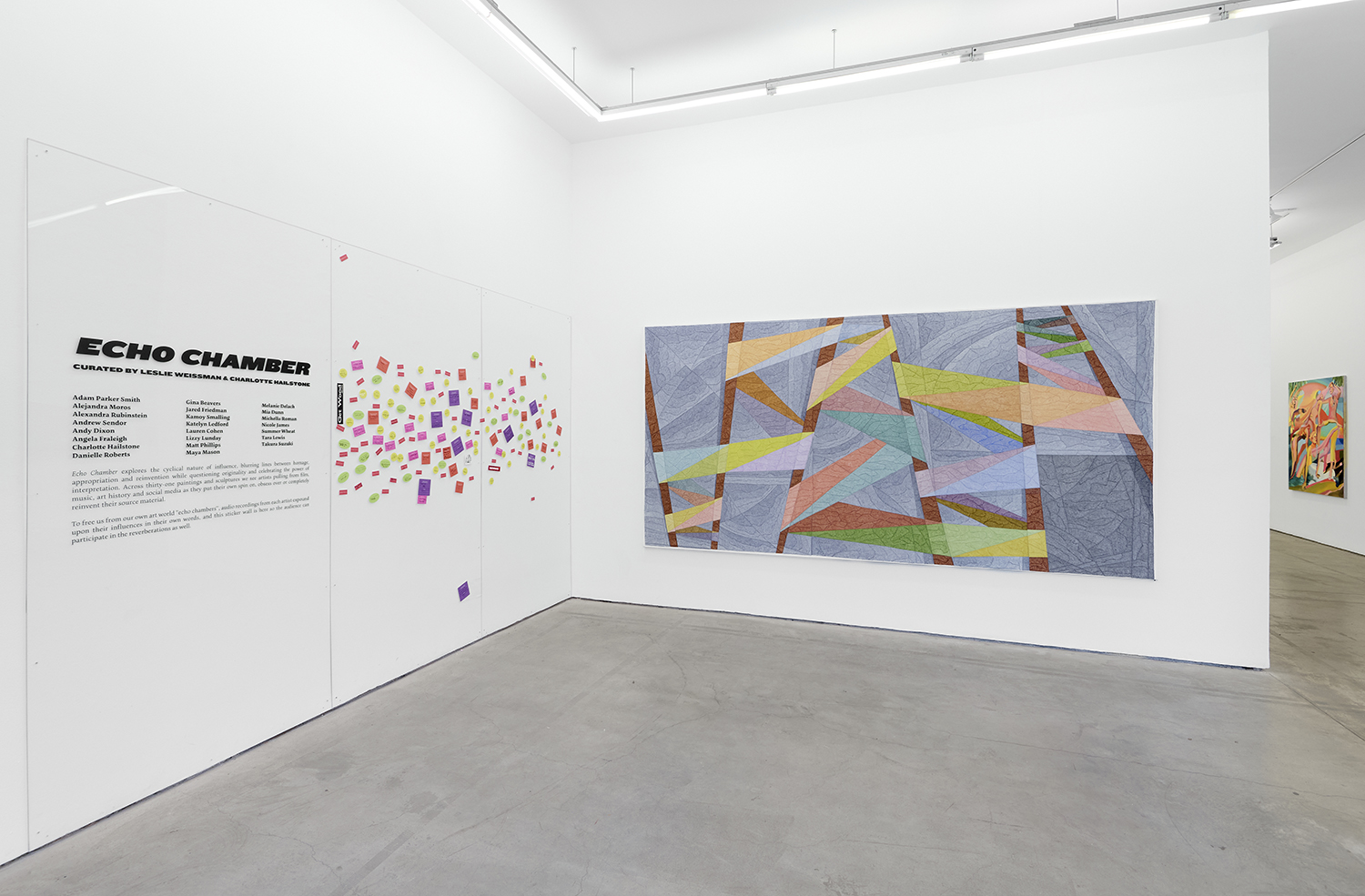 To free us from our own art echo chambers, the curators present an interactive element on the plexiglass glass front wall of the show: viewers are encouraged to fill in the blanks on the stickers provided and post them up, continuing the dialogue about the artworks and the role of influence with visitors to the show. When we only encounter our own beliefs and only engage with art we already like, the chamber becomes claustrophobically small, when it could be a chamber to amplify new voices and ideas.