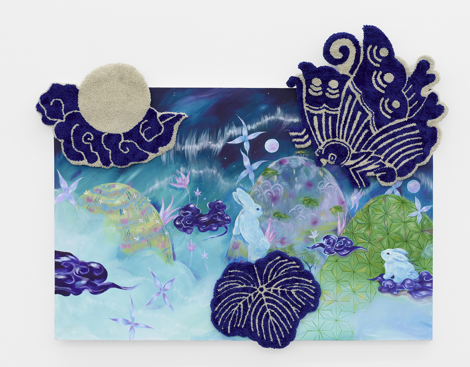 Mia Dunn, Heirlooms, 2025, acrylic on canvas with up-cycled yarn, 52 x 65 inches, 132 x 165 cm.