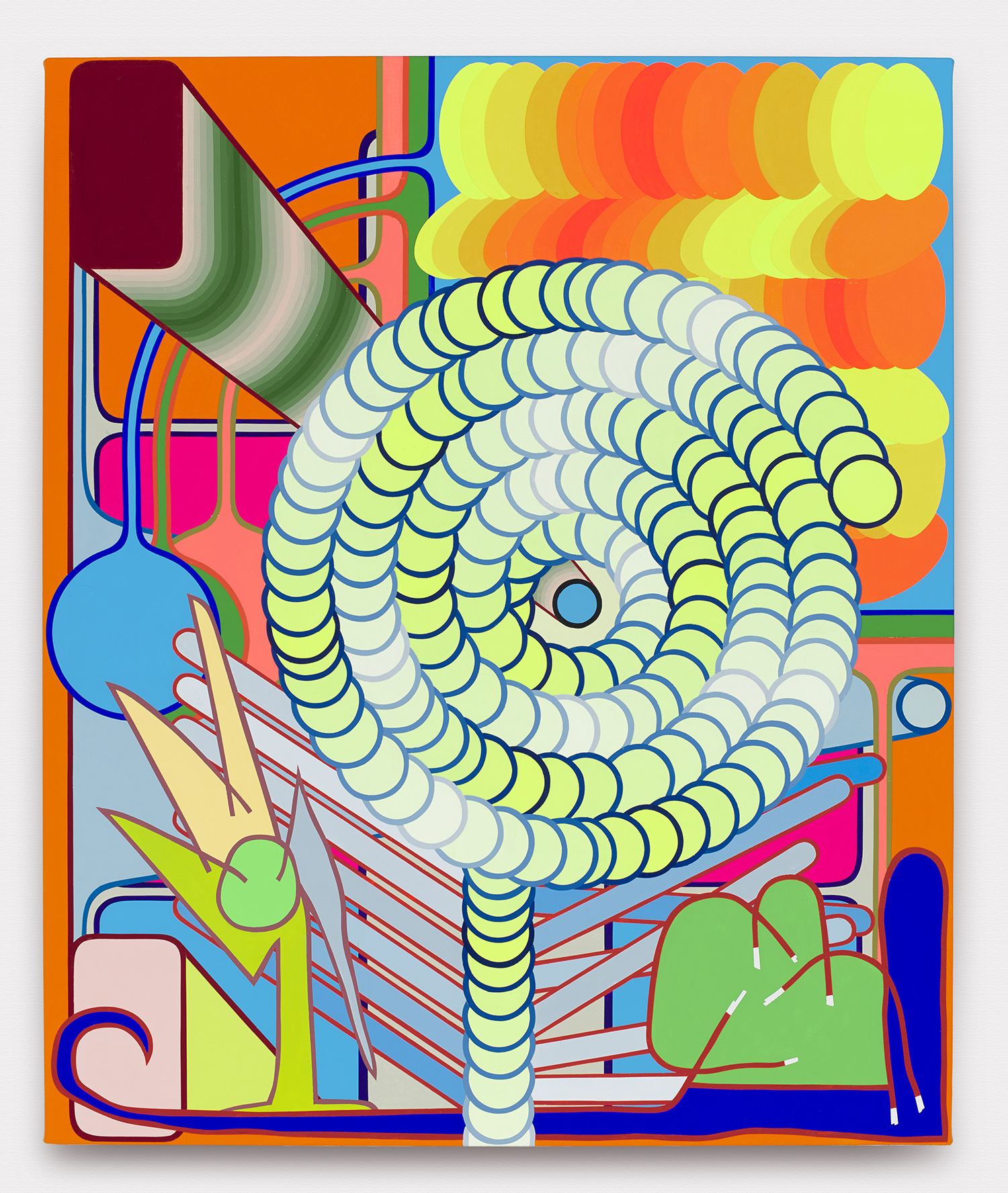 A mind-boggling cathedral of tape is used to paint all these perfect bits of color and the order of operations so that no bits overlap is bonkers. A string of discs weaves through a 49-color fountain in one work, and I defy you to figure out how the artist puzzled through it. The mathematical and geometric precision of the works presents in stark contrast to the playfulness, improvisation and joy in the compositions.
