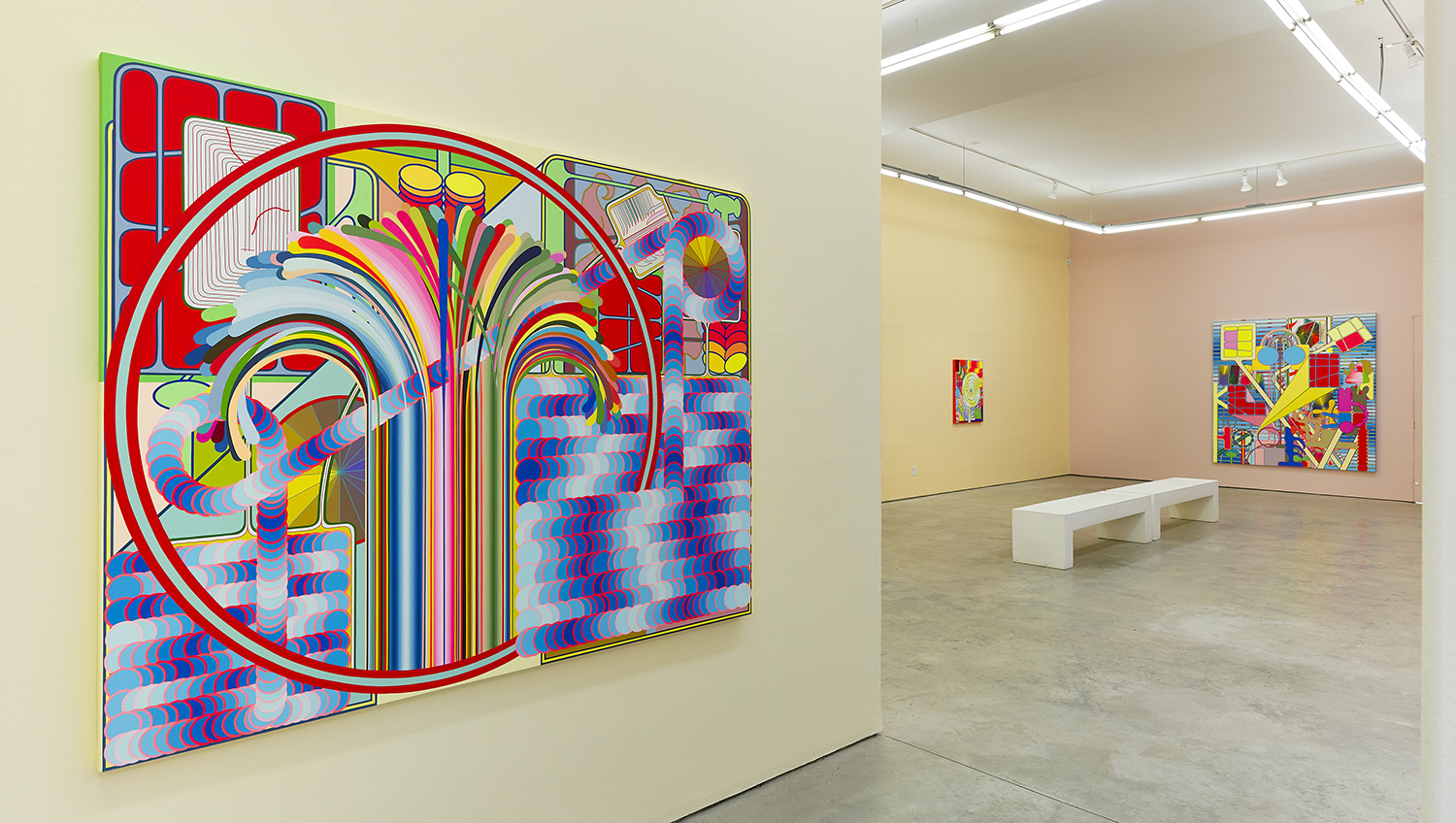Using semi-familiar forms culled from logos and signage on the streets of New York, Shaw riffs on and remixes a repertoire of shapes and color gradients. Sketching on his phone in a rudimentary drawing program and bonking back and forth between screen and canvas, the artist invents and elaborates without a sketch or plan as his ideas proliferate.