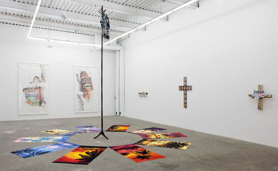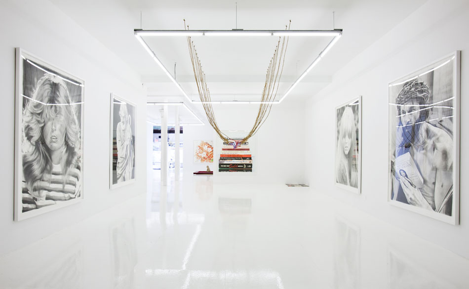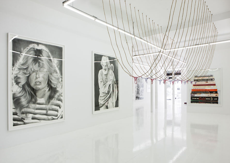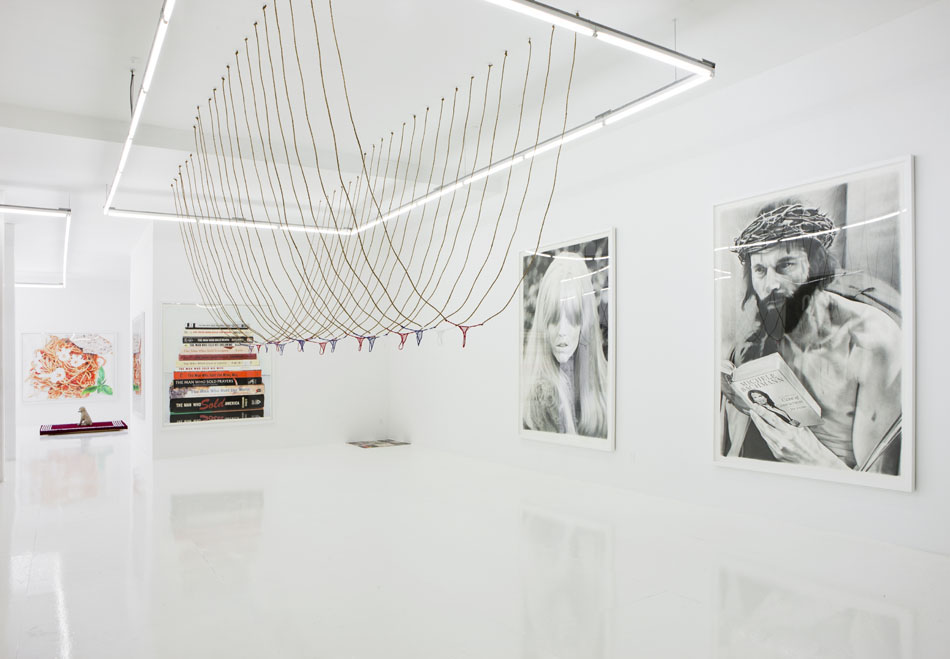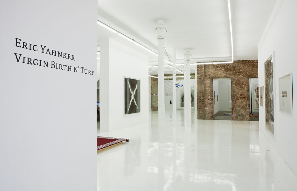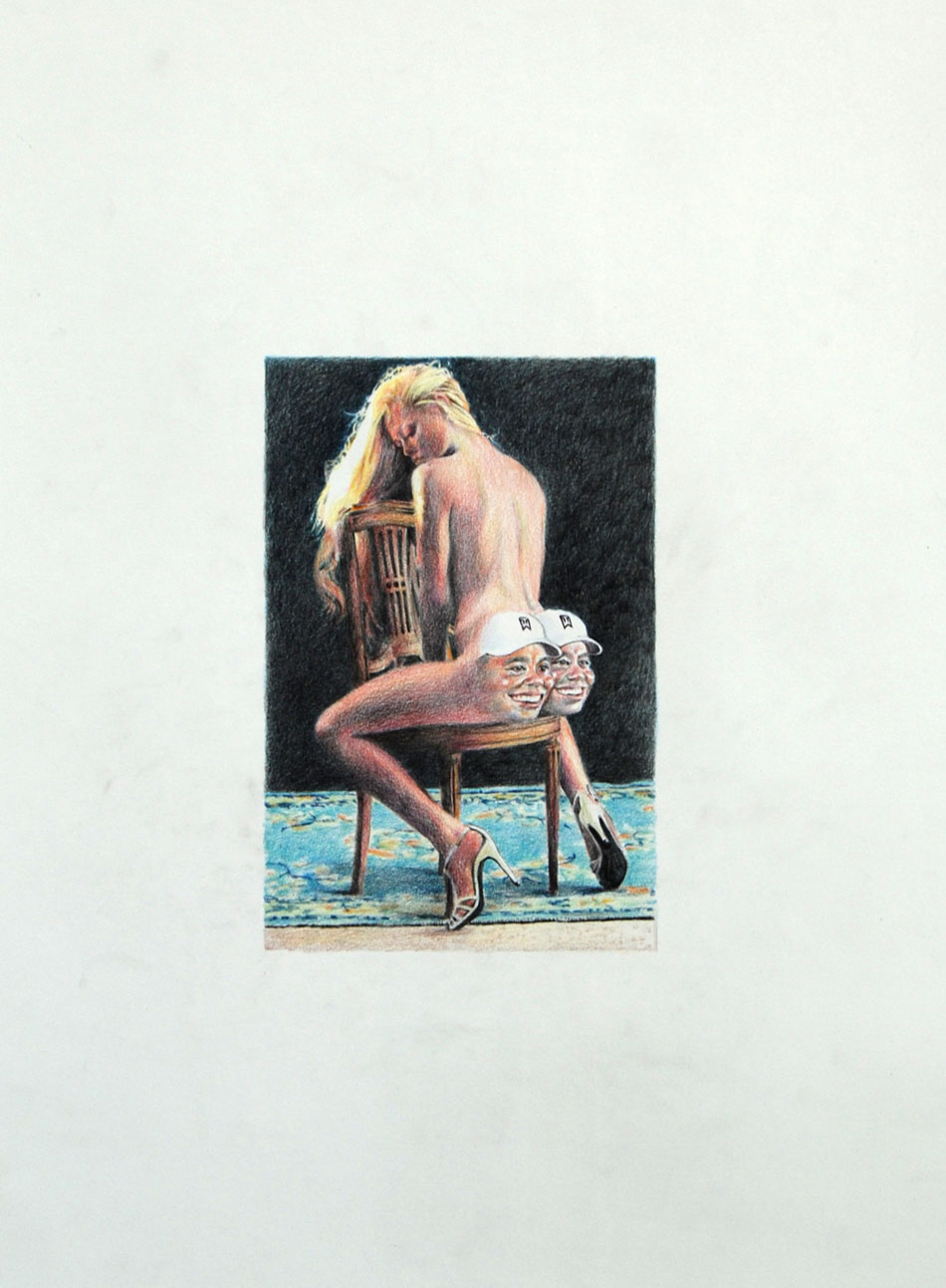 The Hole is proud to announce the first New York solo show by LA based artist Eric Yahnker. For the past two years Yahnker has been preparing his massive drawings and sculptures for this exhibition, and it represents the culmination of his recent explorations. The works in this show range from meticulous, two-foot colored pencil and graphite drawings to towering ten-foot works on paper; from tiny sculptural interventions to massive three dimensional arrangements. The pieces en masse form a lyrical and disturbing poem – which takes the title Virgin Birth ‘N’ Turf – about the state of the union and our contemporary American moment.