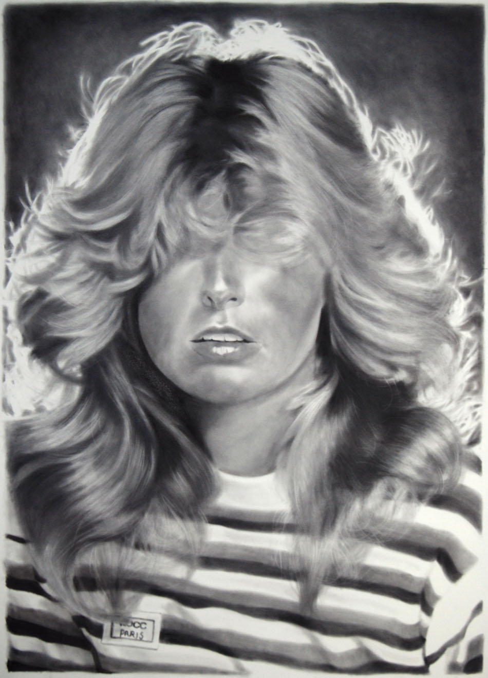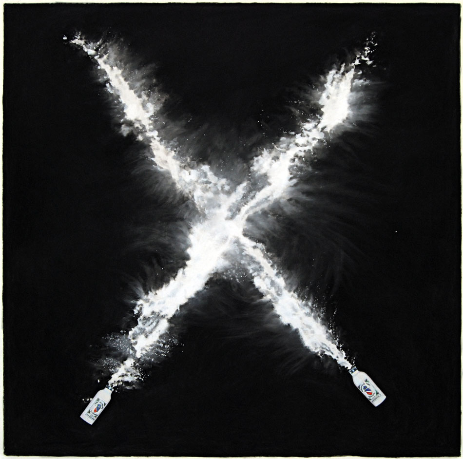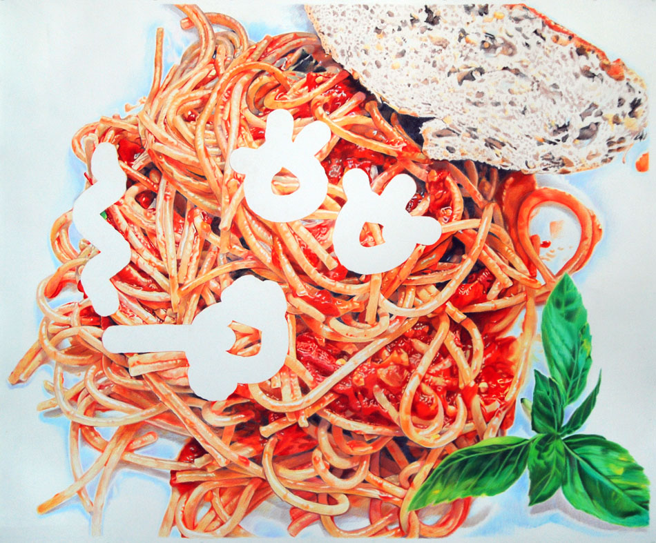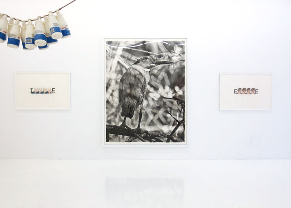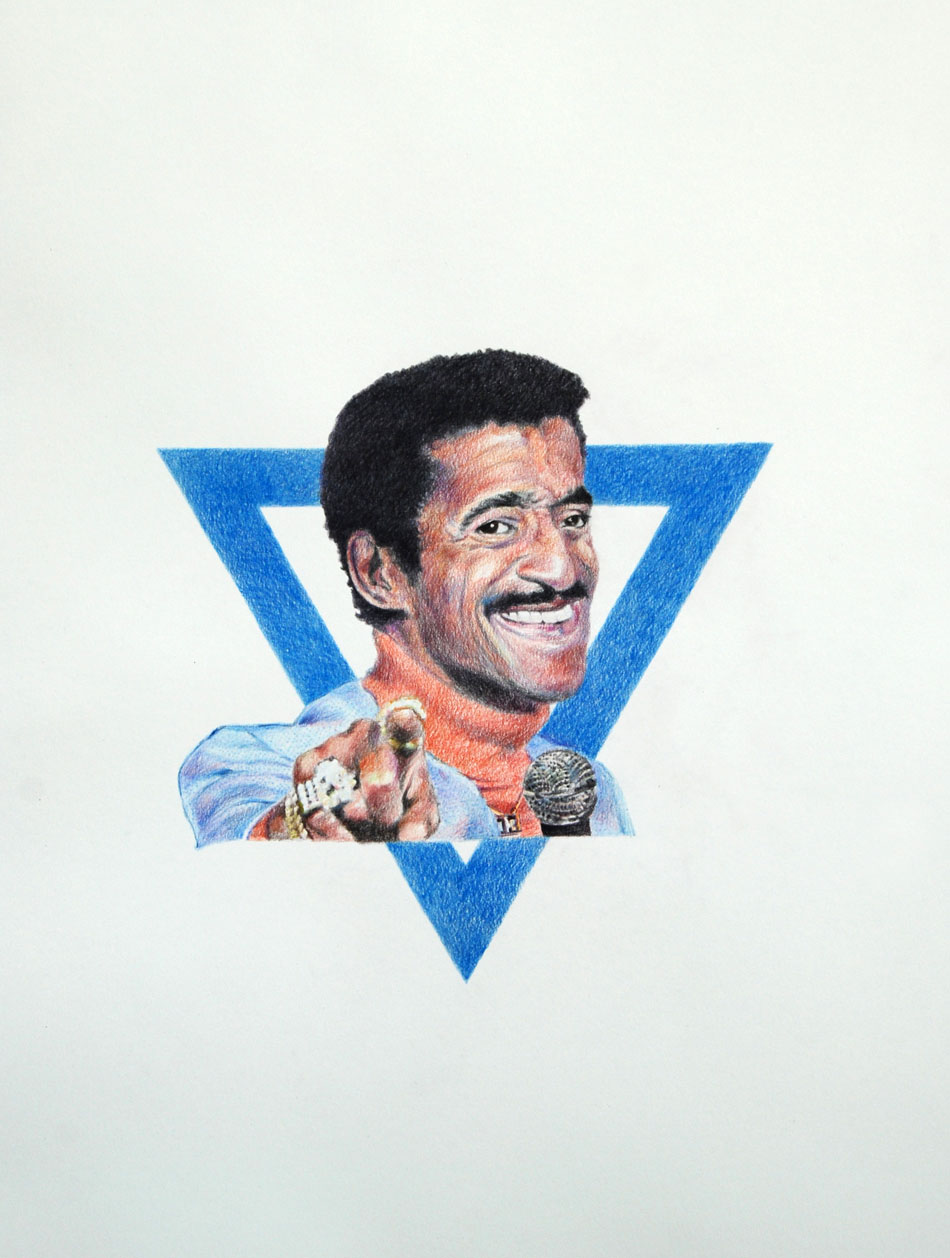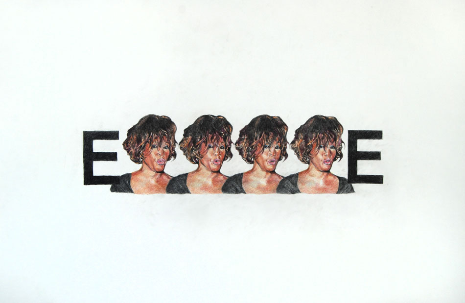 To get a sense of Yahker’s humour you can check the titles of the pieces: “Talcum X”, “Chili Fries Without a Face” or “I See Sinai, I See France” suggest the type of culturally challenging concoctions this artist cooks up. His interest in Jewish history is suggested by pieces like “Star of David Lee Roth” or “Star of Davis Junior”. And you don’t need to read an essay about works like “West Side Story” because the artist has drawn it for us—and very, very well. His textual works occasionally do spell it out for us a bit, just in a very odd way: drawings of people stand in for letters, as a repeated image of Bill Clinton may suggest the work spells out “INHALE”; while Whitney Houston’s visage fills in the work most likely titled “EXHALE”.