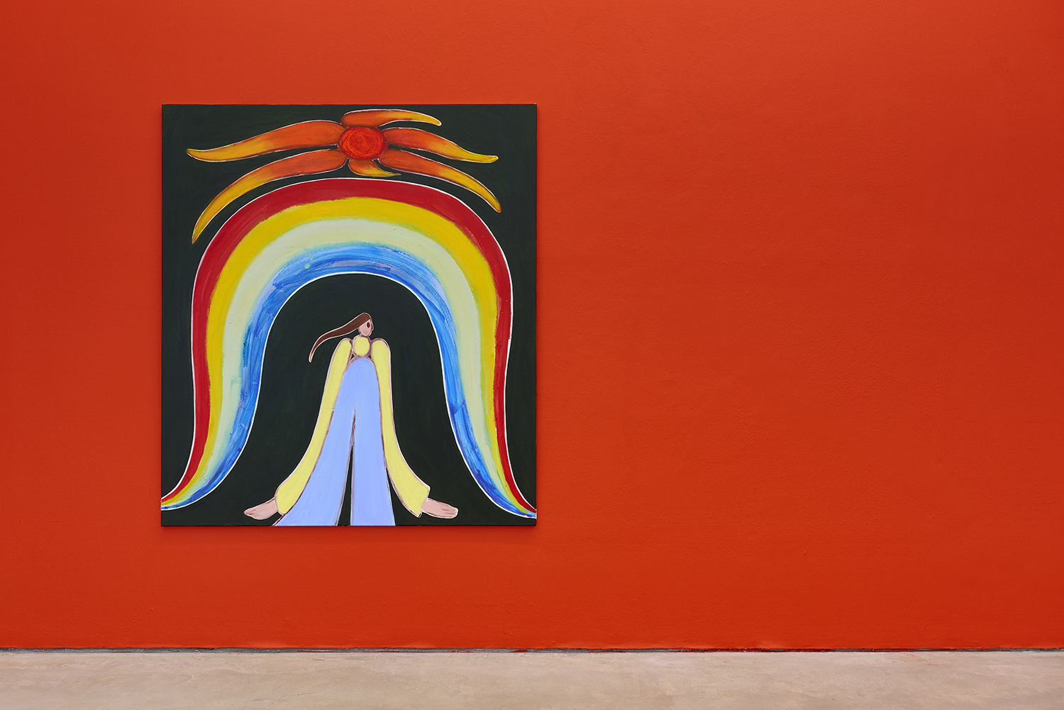 The intensity of new thoughts, sentiments, and concerns prompted using a Milton Avery-like palette that energizes the scenes and underlines the recharging, revitalizing capacity of the sun. Invested in creating cogent, spirited metaphors for identity search and empowerment, the main characters represent the same person (the artist), who takes different shapes throughout the presentation. From several versions of the recognizable, slightly aged, androgynous Feelo character, over the insecure and armored medieval knight, to their incarnation as dinosaurs millions of years ago. Due to their shapeshifting nature, their emotion, mental state, and relationship with the environment become the main protagonist, while the figures get reduced to vessels that convey timelessness and ubiquity. Through such widened perspective, the work continues developing and growing while dealing with certain concerns at the same pace as the artist himself. The fluid feminine and masculine adolescent protagonists reveal the interest in how a person identifies themselves internally or presents themselves to the world. Somewhat naive and curious, they are on a never-ending quest to find a balance between adventurously experiencing the world and their own vulnerability and fragility.