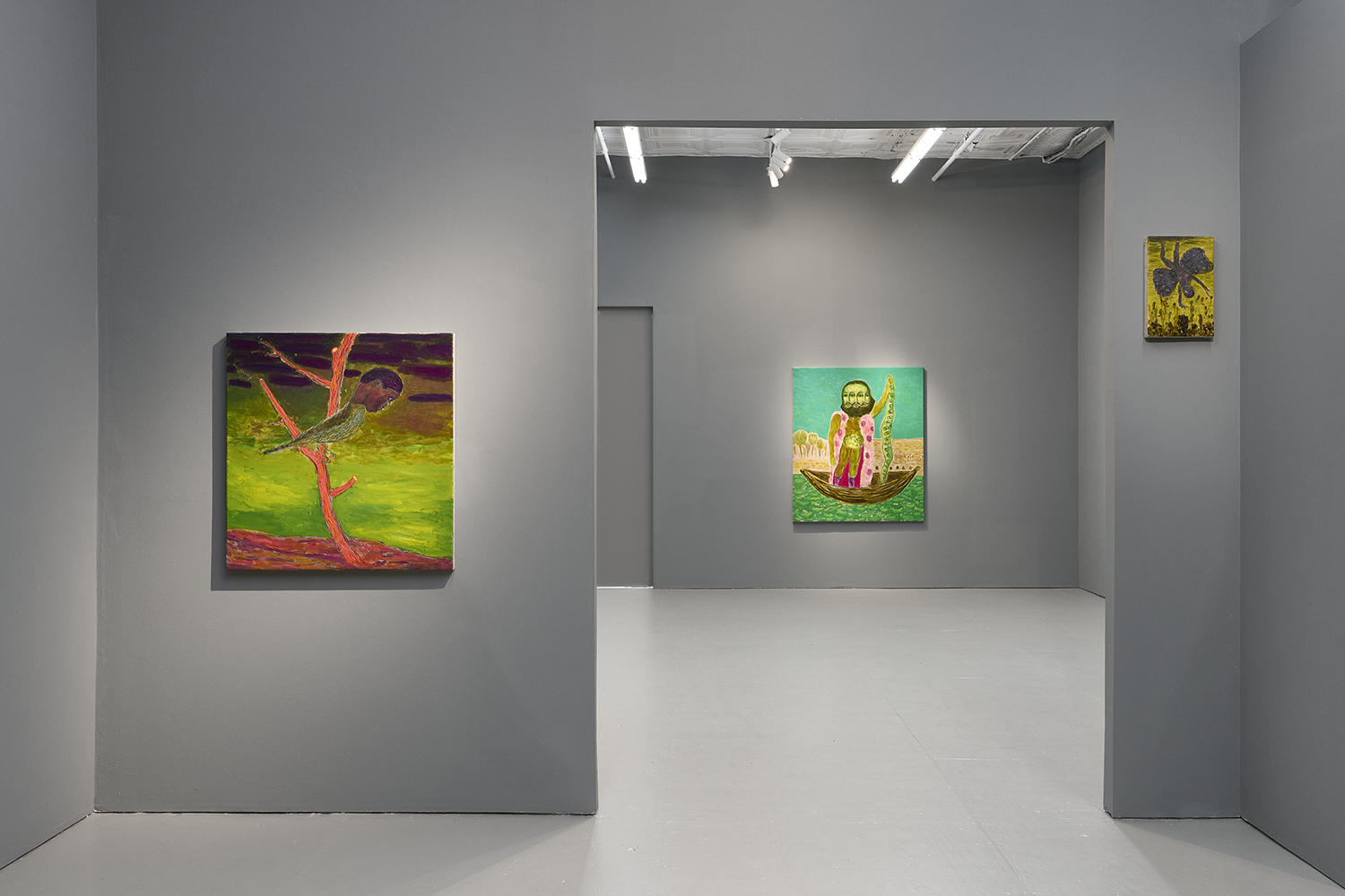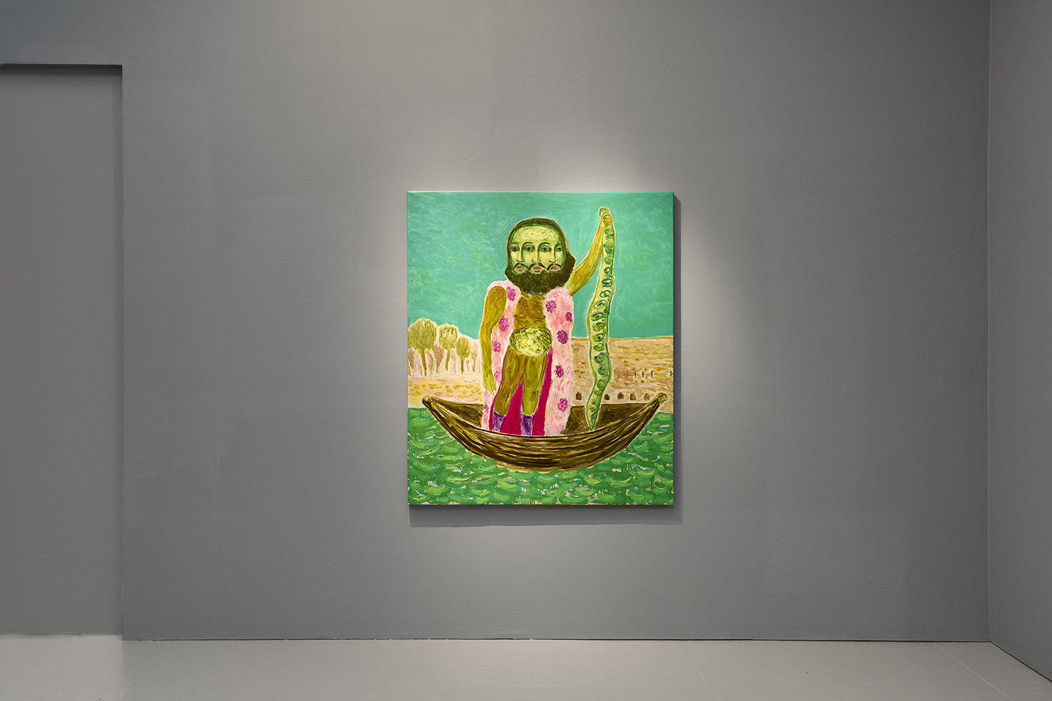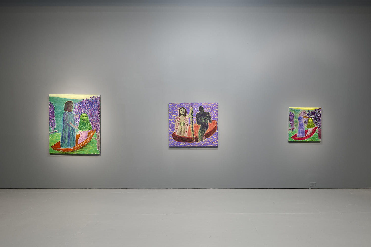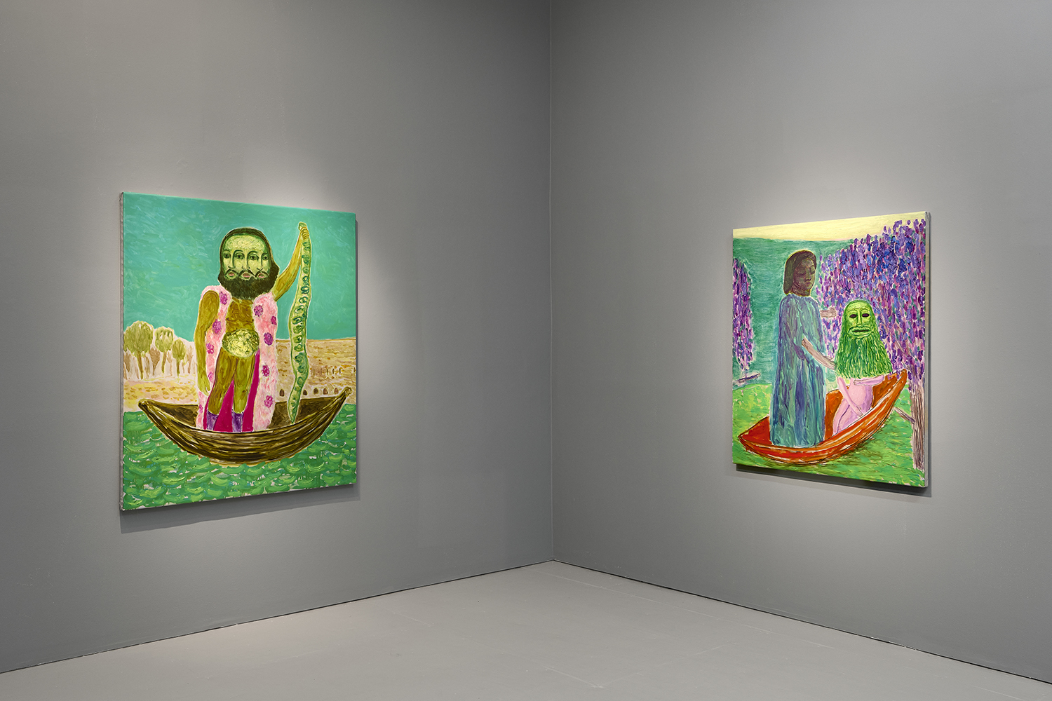 Built through layered applications of oil and wax, Akrap’s paintings seduce with color while quietly resisting clarity. Winged figures fall, boys drift in boats, animals surface and disappear, masked faces peep at us. Certain characters recur from earlier works—the boater-hatted man, Icarus, the salamander—while new presences emerge here, including harpies and gold masks rendered in an even more acidic, volatile palette. The imagery feels both ancient and personal, as if filtered through half-remembered myths, alchemical diagrams, and distant echoes of Impressionist and Post-Impressionist painting.