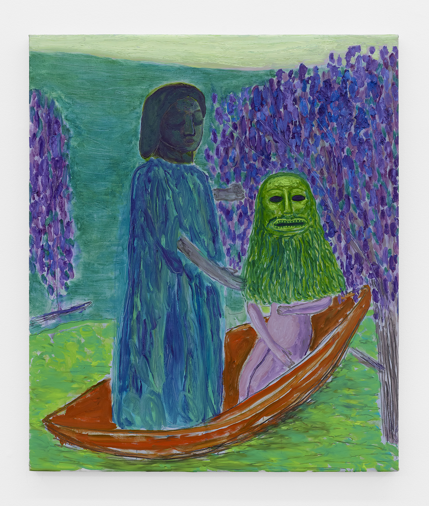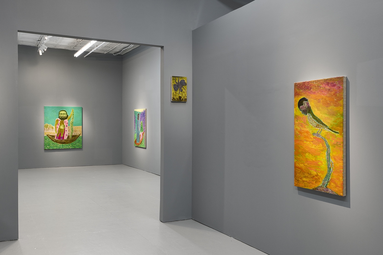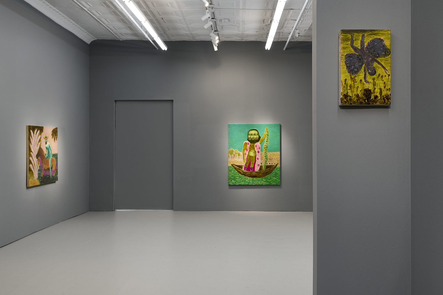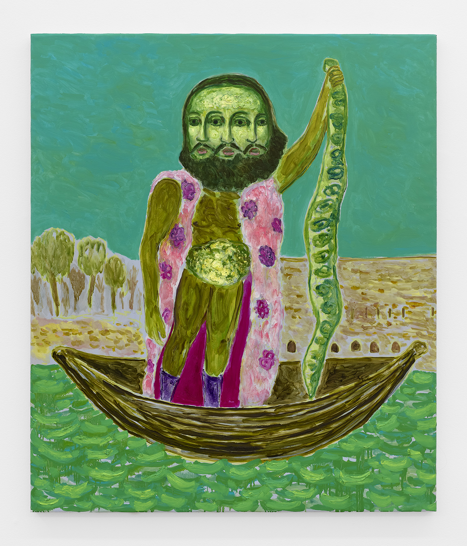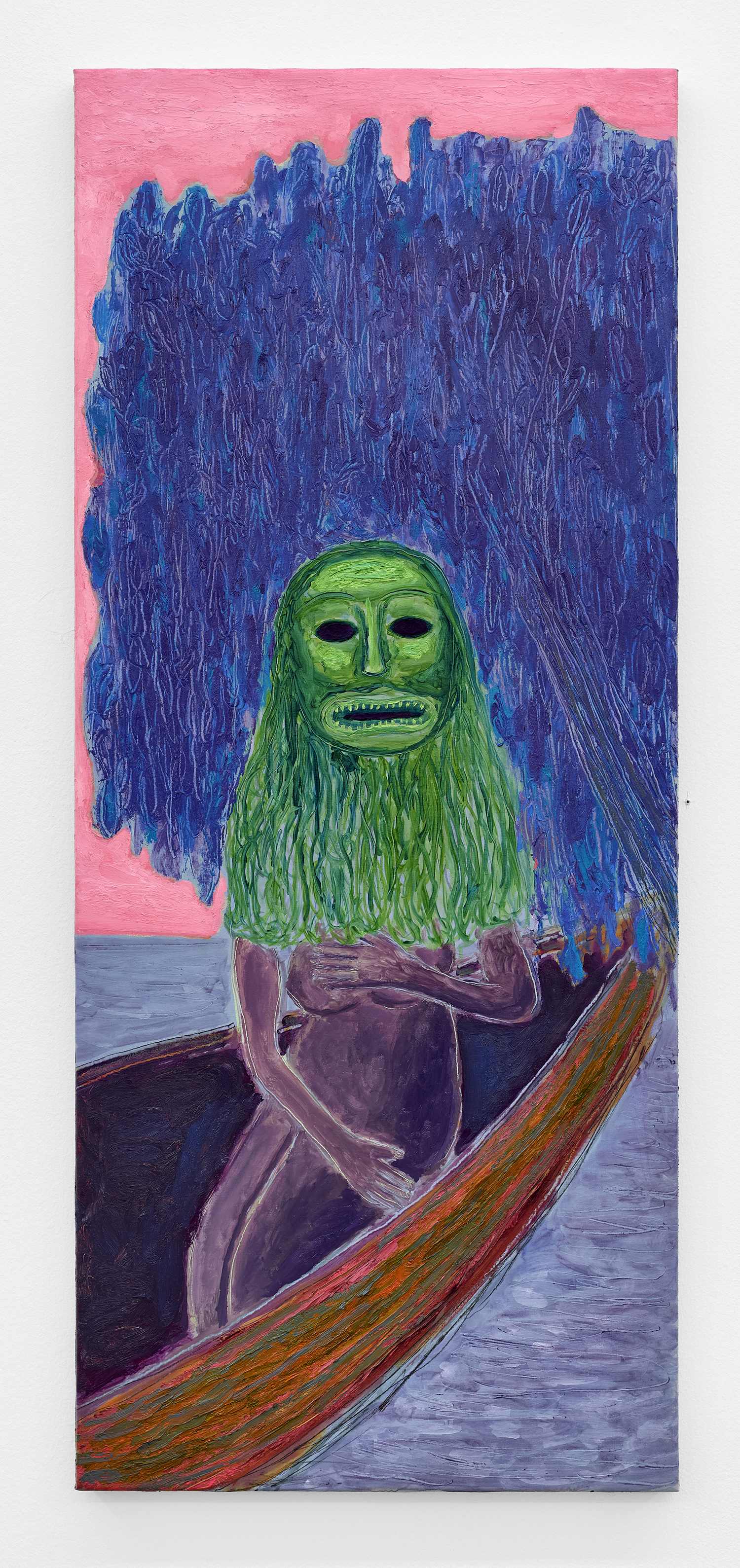 Built through layered applications of oil and wax, Akrap’s paintings seduce with color while quietly resisting clarity. Winged figures fall, boys drift in boats, animals surface and disappear, masked faces peep at us. Certain characters recur from earlier works—the boater-hatted man, Icarus, the salamander—while new presences emerge here, including harpies and gold masks rendered in an even more acidic, volatile palette. The imagery feels both ancient and personal, as if filtered through half-remembered myths, alchemical diagrams, and distant echoes of Impressionist and Post-Impressionist painting.