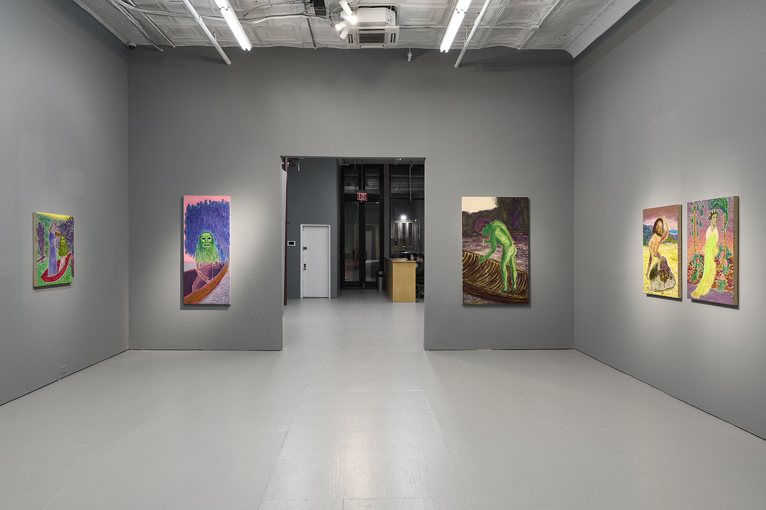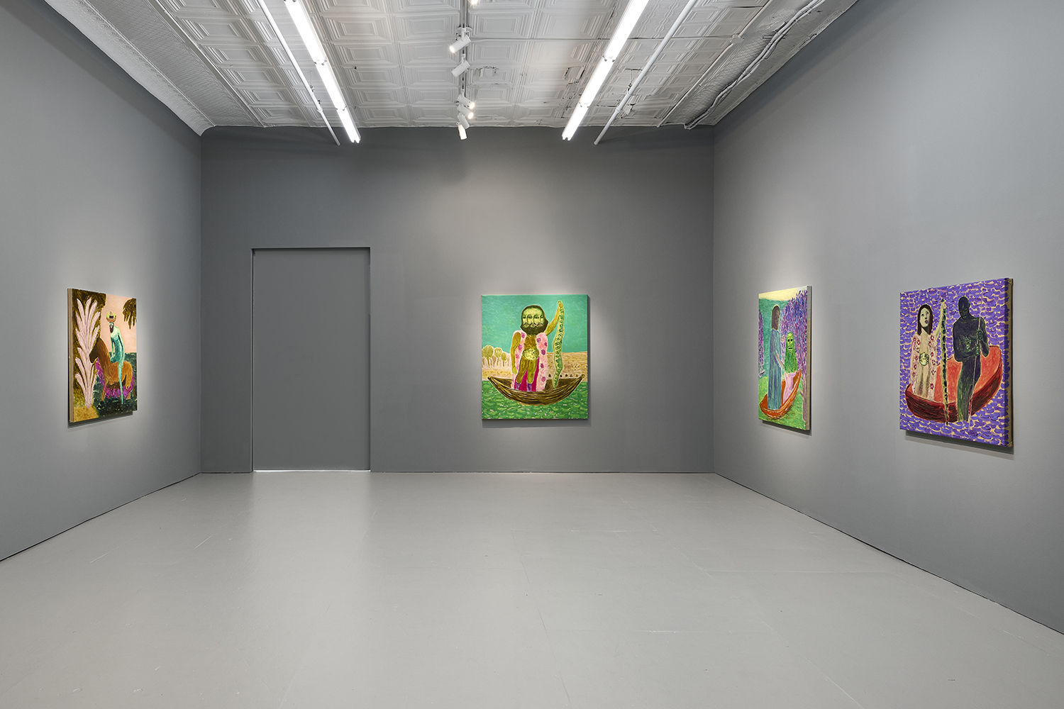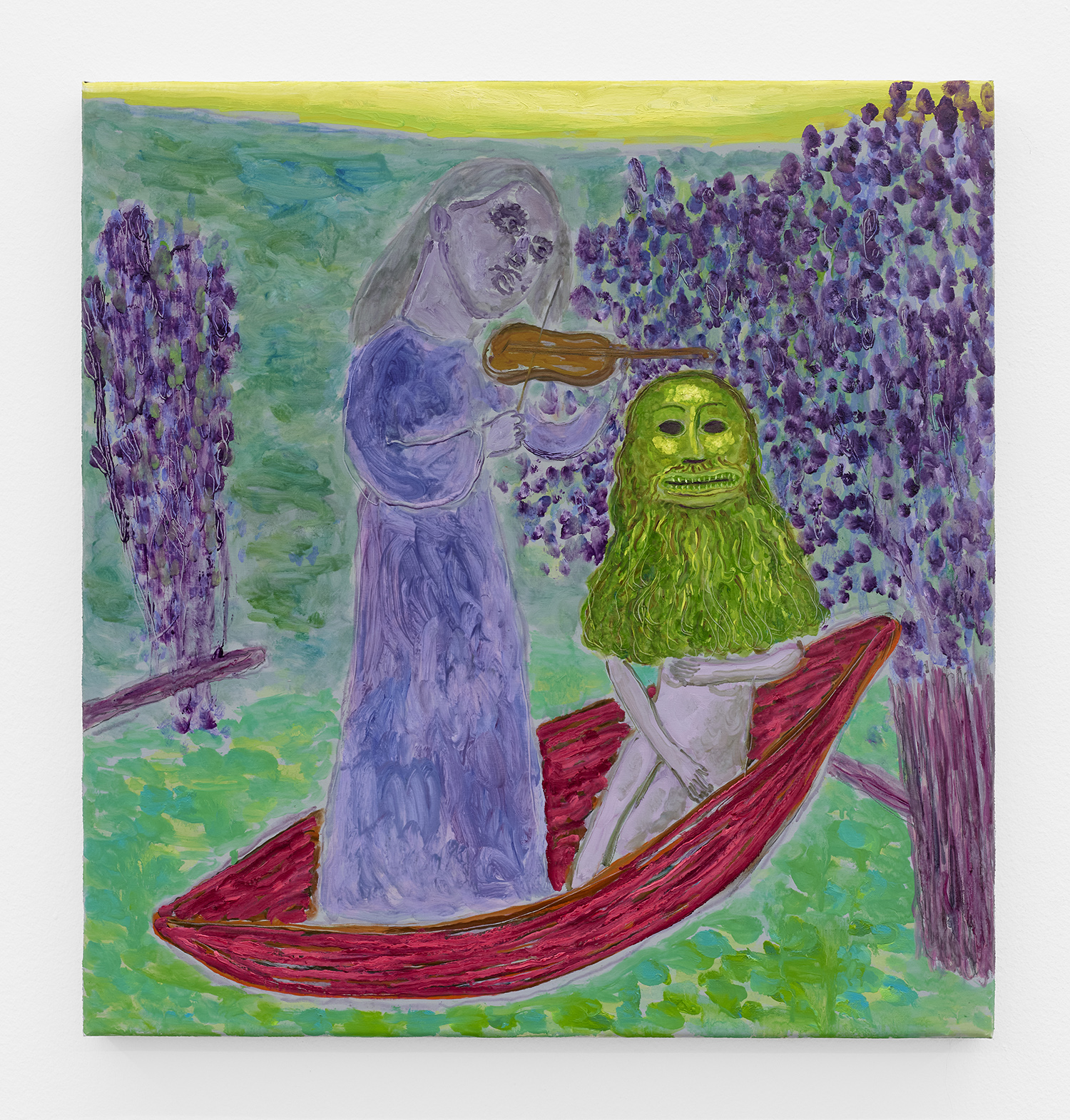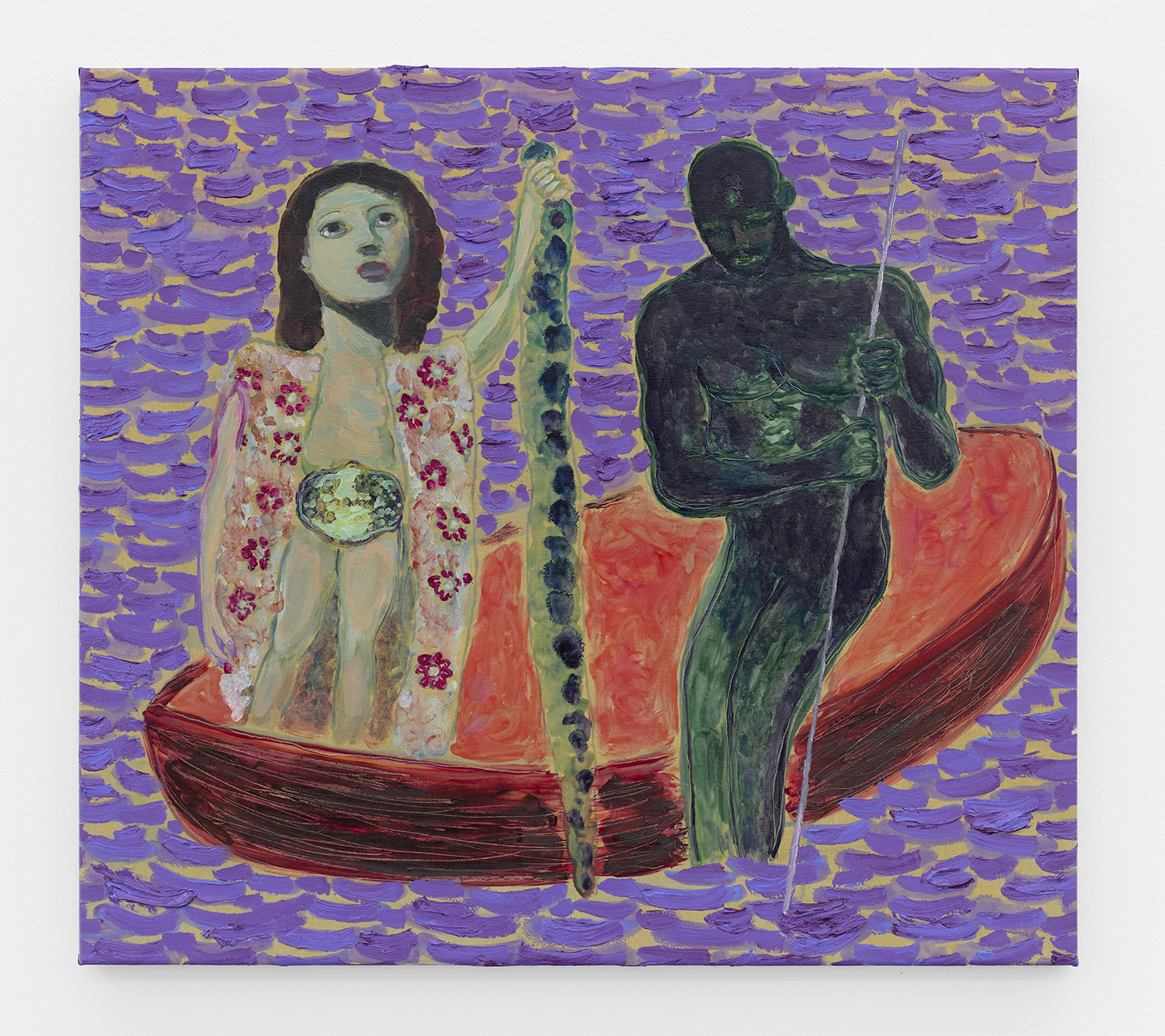 Built through layered applications of oil and wax, Akrap’s paintings seduce with color while quietly resisting clarity. Winged figures fall, boys drift in boats, animals surface and disappear, masked faces peep at us. Certain characters recur from earlier works—the boater-hatted man, Icarus, the salamander—while new presences emerge here, including harpies and gold masks rendered in an even more acidic, volatile palette. The imagery feels both ancient and personal, as if filtered through half-remembered myths, alchemical diagrams, and distant echoes of Impressionist and Post-Impressionist painting.