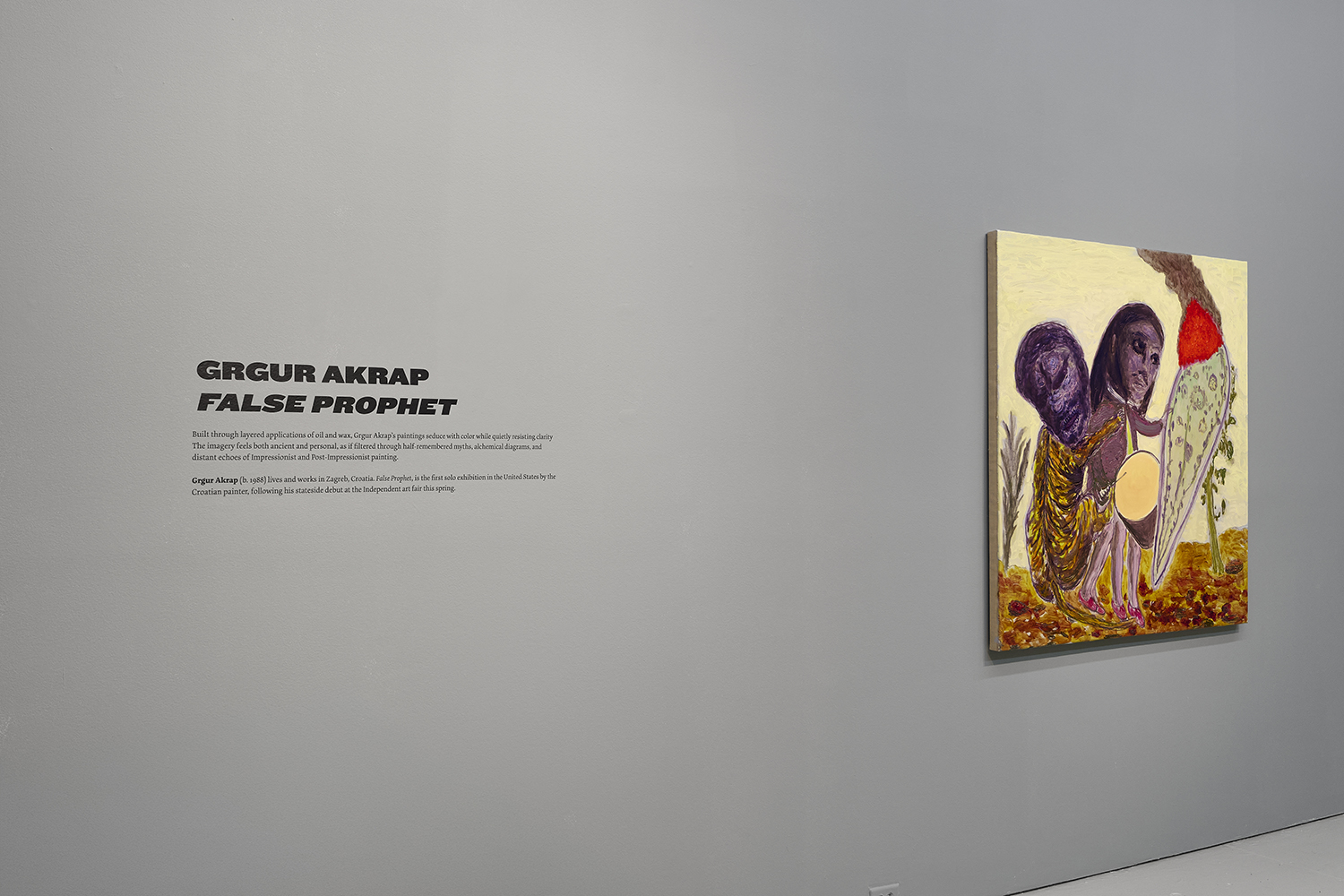 The Hole is pleased to present False Prophet, the first solo exhibition in the United States by Croatian painter Grgur Akrap, following his stateside debut at the Independent art fair this spring. Across eleven new paintings, the exhibition expands Akrap’s distinctive pictorial universe—lush, uncanny, and insistently unresolved—where familiar figures drift toward the archetypal and images hover between doubt and revelation.
