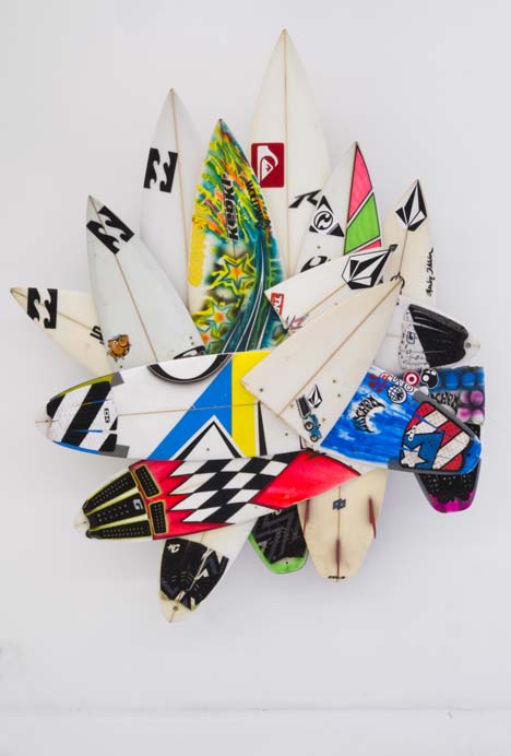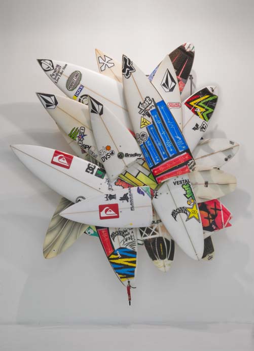 The Hole is very proud to present six major new works by surf legend and artist Herbie Fletcher in the main gallery at 312 Bowery. These artworks are massive and vital, like the huge waves this artist was known for pioneering during his fifty-year plus career as a surfer. These pieces are made from the wave-munched fragments of broken boards actually used when surfing giant waves. The thunderous force of the ocean is apparent in these jagged and mishapen “wrecktangles”, but perhaps the most eye-catching component is the various decals, traction pads, fins or logos that show both the personalization of each board and the sponsorship and awards circuits of pro surfing. The combination of the odd formal geometries of a late Frank Stella with the pop cacophony of logos and images, makes for a very interesting work of art that is charged with energy and life.