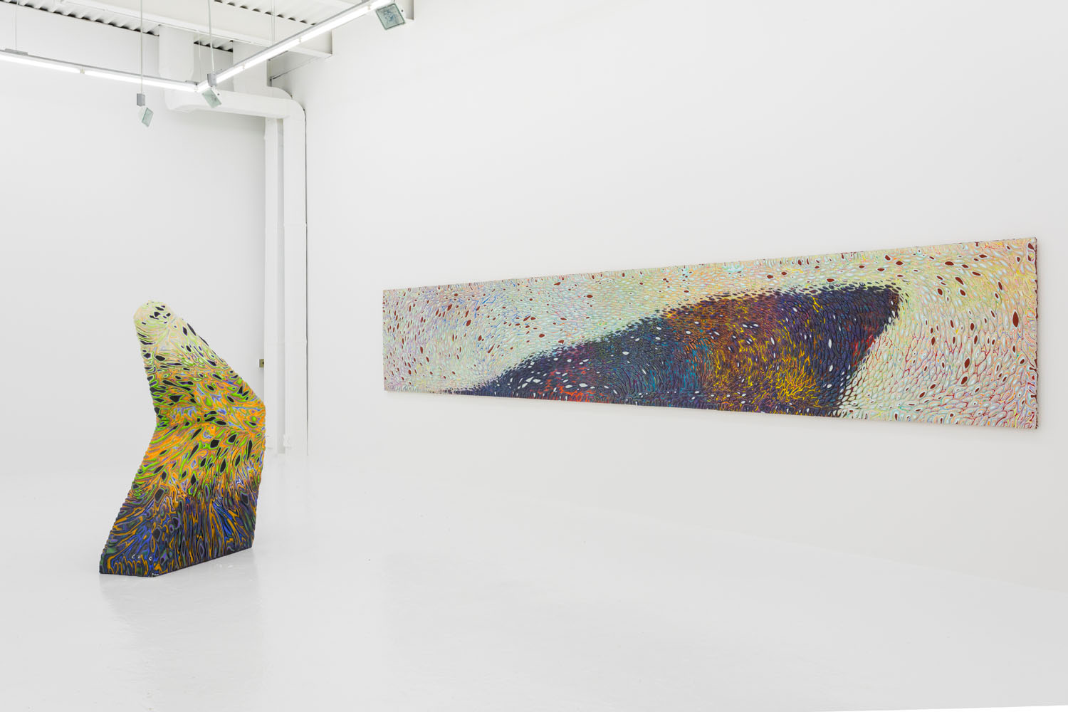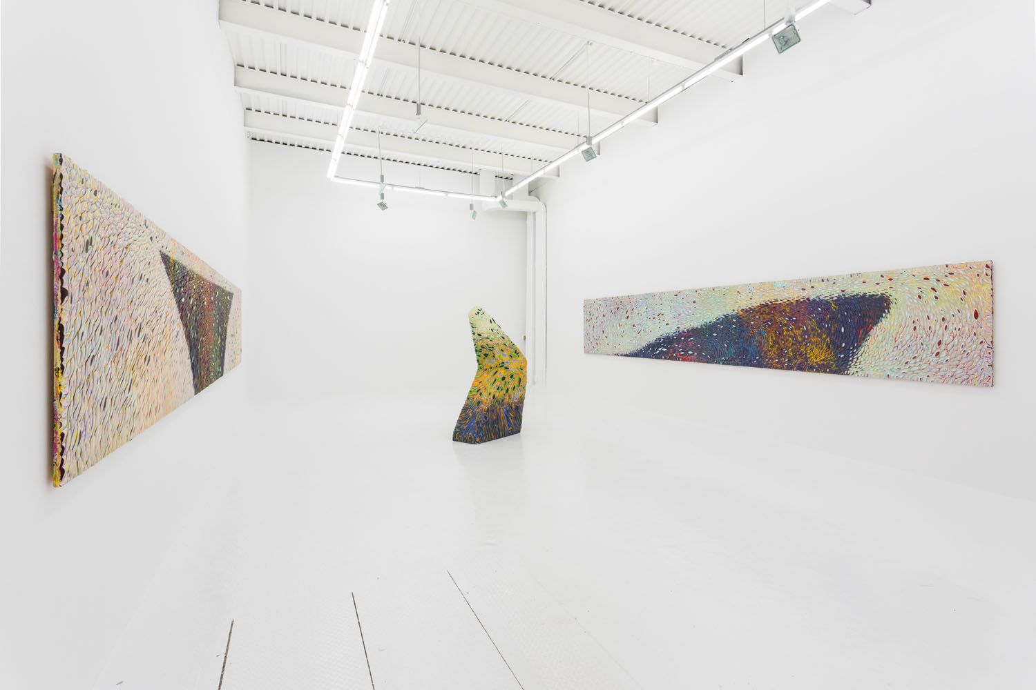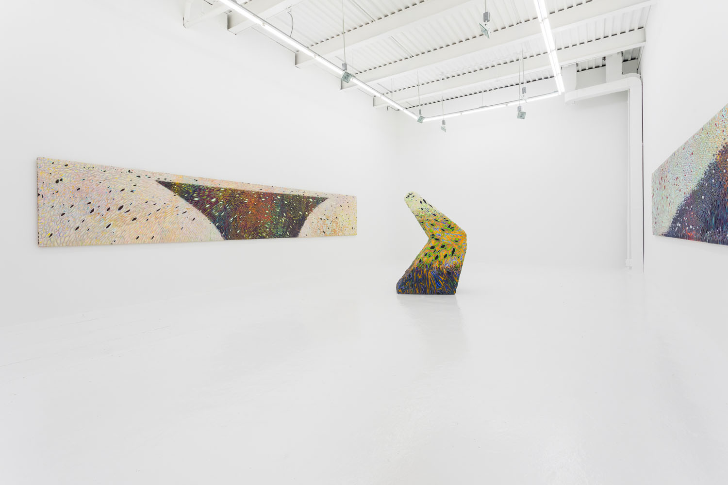 These “cutaways” were debuted at Venus LA earlier this year in a full show of multiple wall and floor pieces. Here we exhibit the longest piece from that show and a new partner completed recently with the same dimensions. These extreme panorama works were designed as mates in scale and palette, one featuring a cresting wave or perhaps a precipice, the other a plateau. Intervening between the paintings is a floor piece pictured above, showing how this type of “3D painting” can itself be turned into a 3D object, the shape of this work a “cliffhanger” as well.