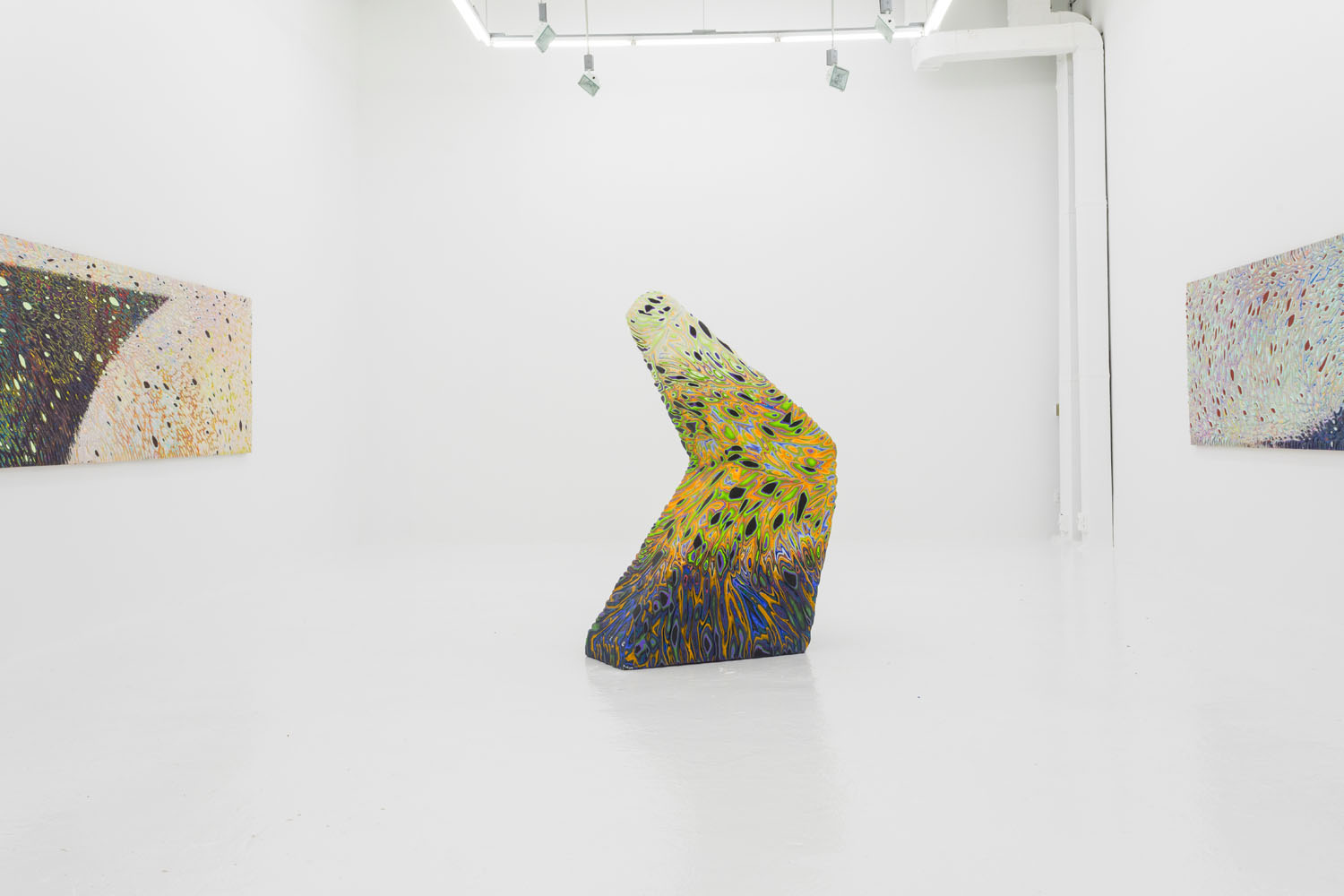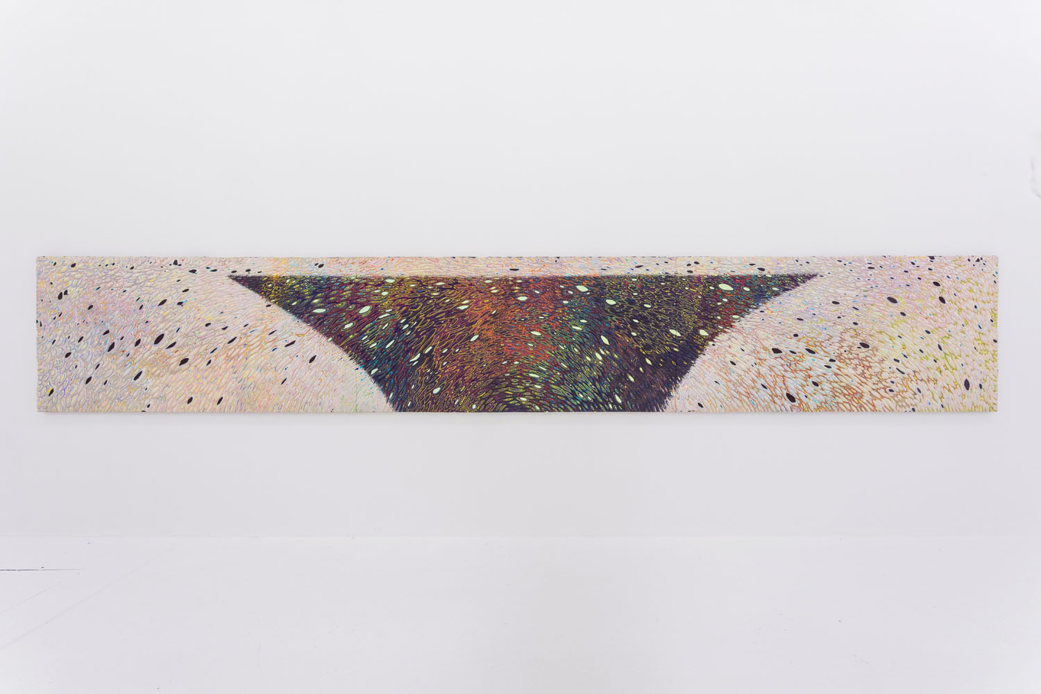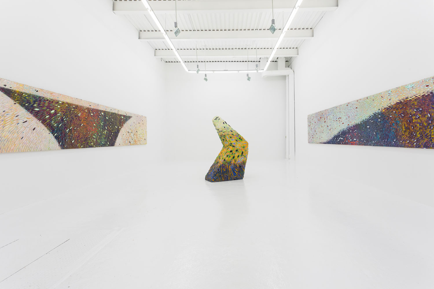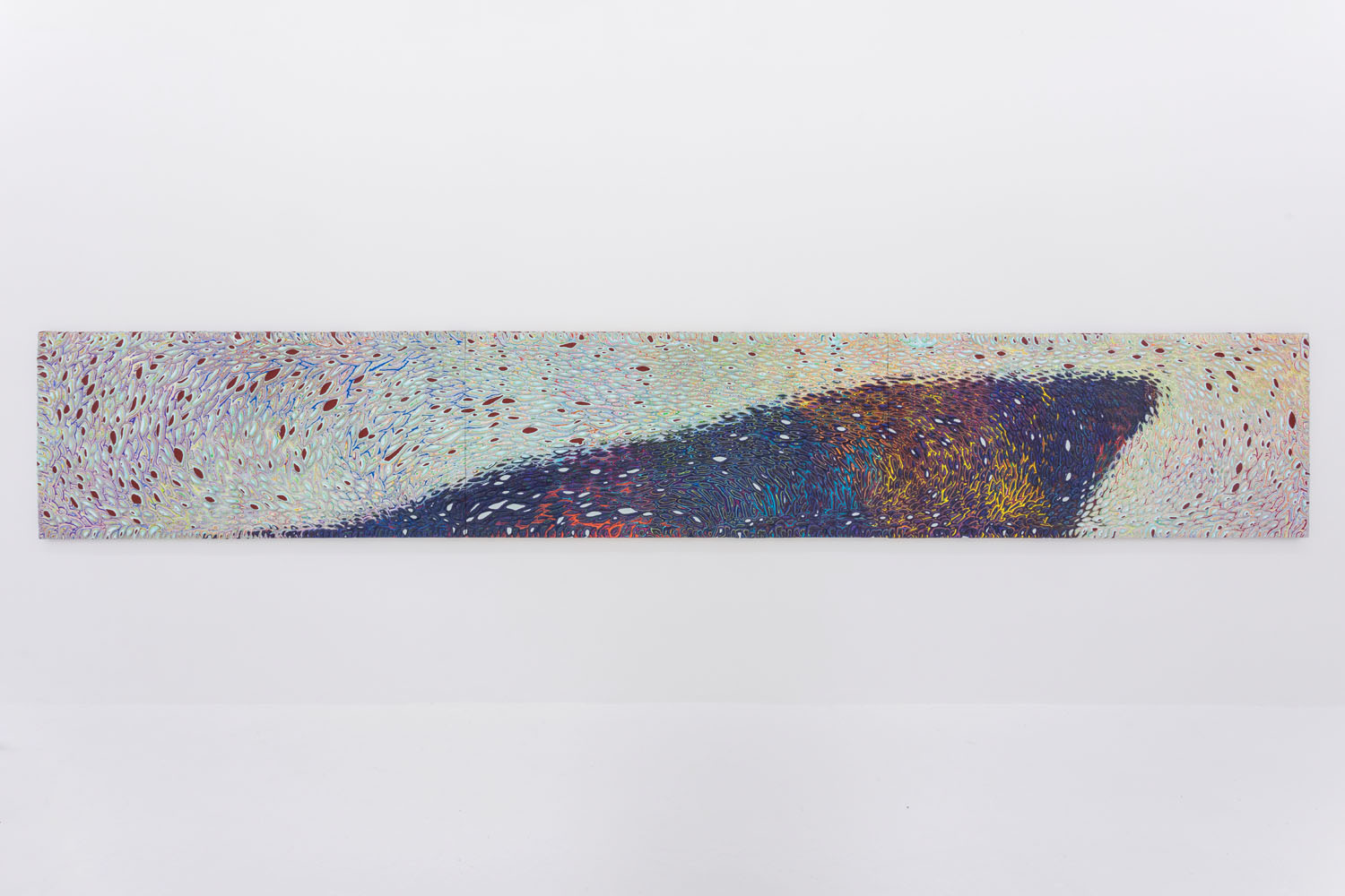 These “cutaways” were debuted at Venus LA earlier this year in a full show of multiple wall and floor pieces. Here we exhibit the longest piece from that show and a new partner completed recently with the same dimensions. These extreme panorama works were designed as mates in scale and palette, one featuring a cresting wave or perhaps a precipice, the other a plateau. Intervening between the paintings is a floor piece pictured above, showing how this type of “3D painting” can itself be turned into a 3D object, the shape of this work a “cliffhanger” as well.