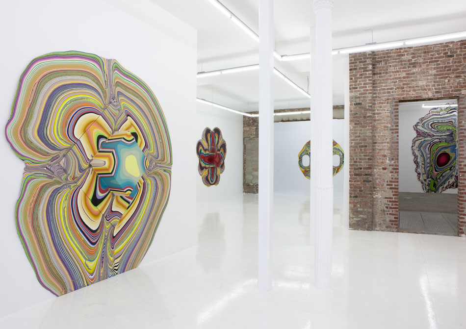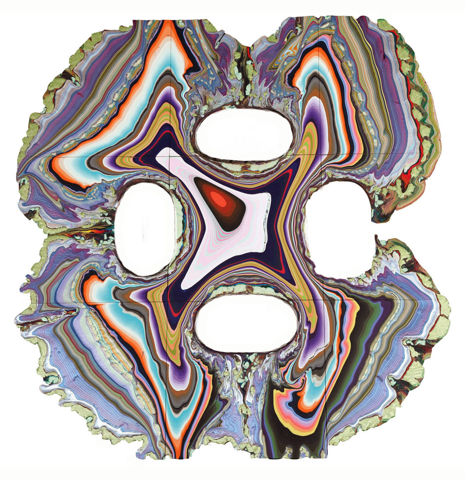Rower makes these paintings by pouring fantastic quantities of doctored paint onto plywood: however, the simplicity of this description belies the shocking and unexpected results. The paint flows slowly and determinedly over the surfaces he creates, timed to dry and spread at just the right rate, in color combinations both highly premeditated and fancifully spontaneous. The sloes of paint often fracture, vacillate, clump up, and extrude. Fissures and zigzags abound, as do waterfalls, U-turns, and smears, but always the flow triumphs.