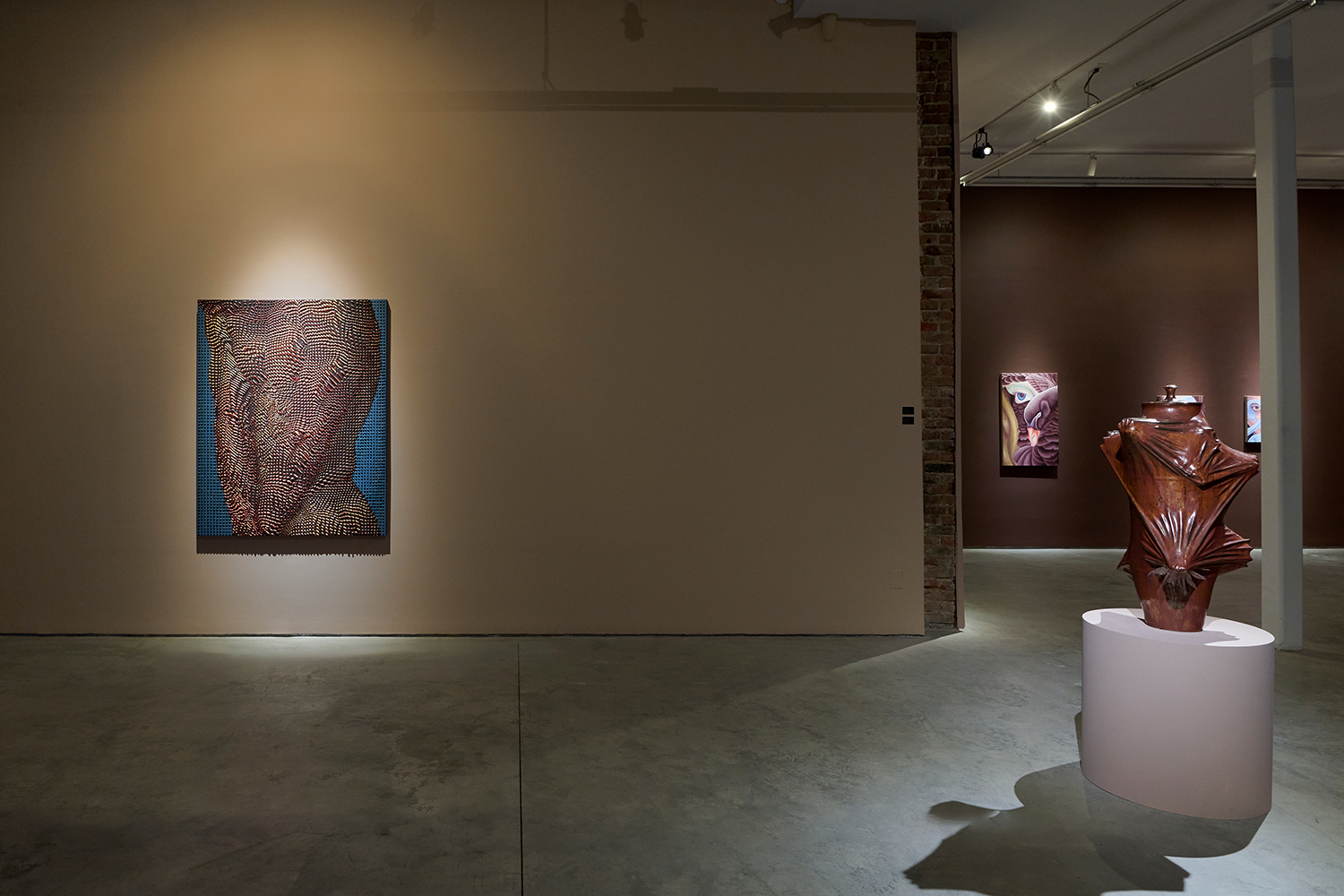 Also in body horror we have Alic Brock take on Maurizio and Pierpaolo’s Toilet Paper which was itself a take on perhaps Buñuel’s Chien Andalou and gives new ick to the ick phrase “eye teeth”. We have Kelly Shami pierced bouquet, puncturing the delicate, and Ken Nurenberg’s painting—somehow both meaty and necrotic—a Greek torso erupting with rococo decorative flourishes. Joseph Parra’s pointilistic topography of the human torso is straight from the tube and already electrically on-end.