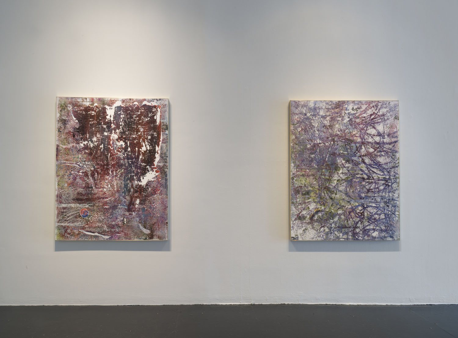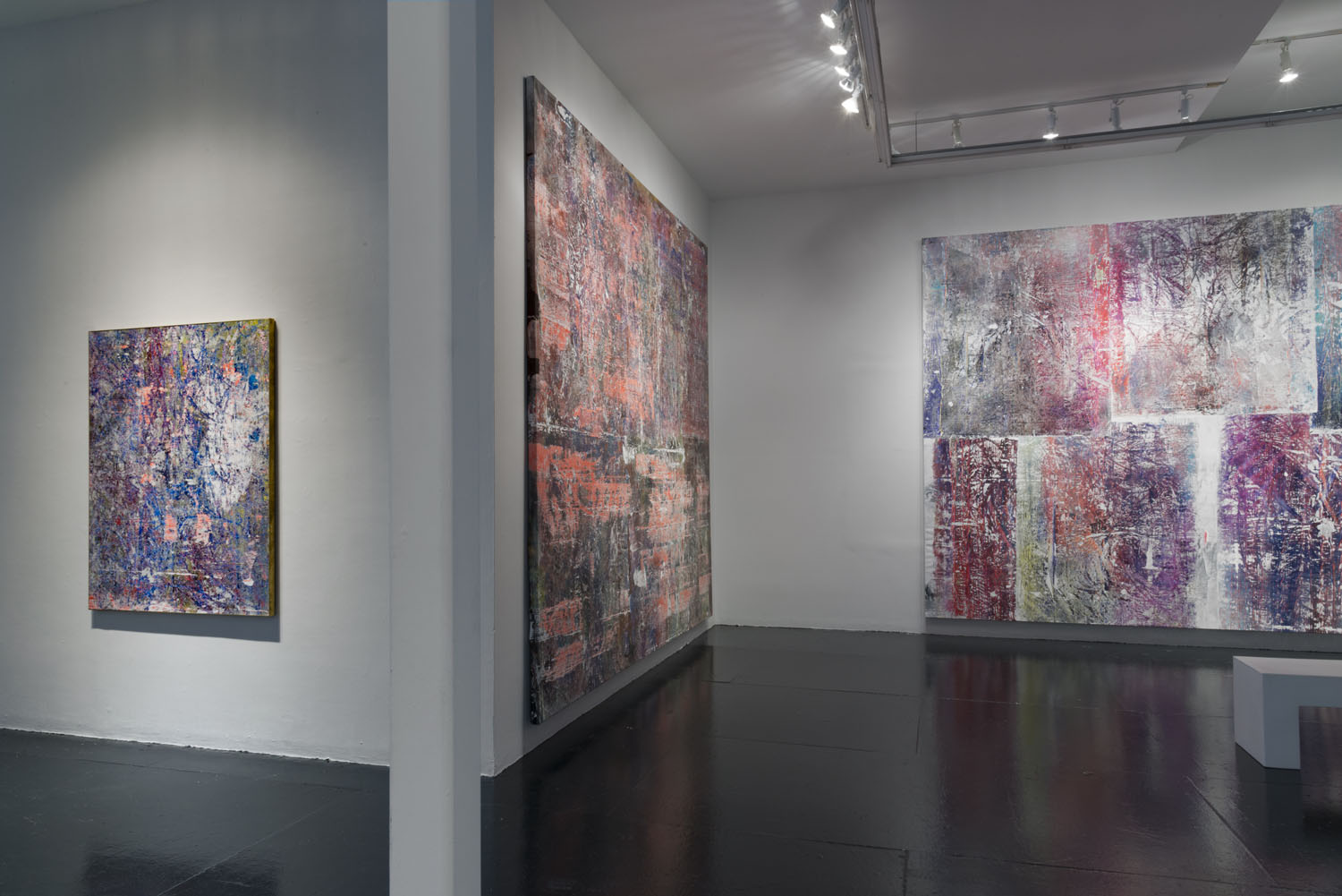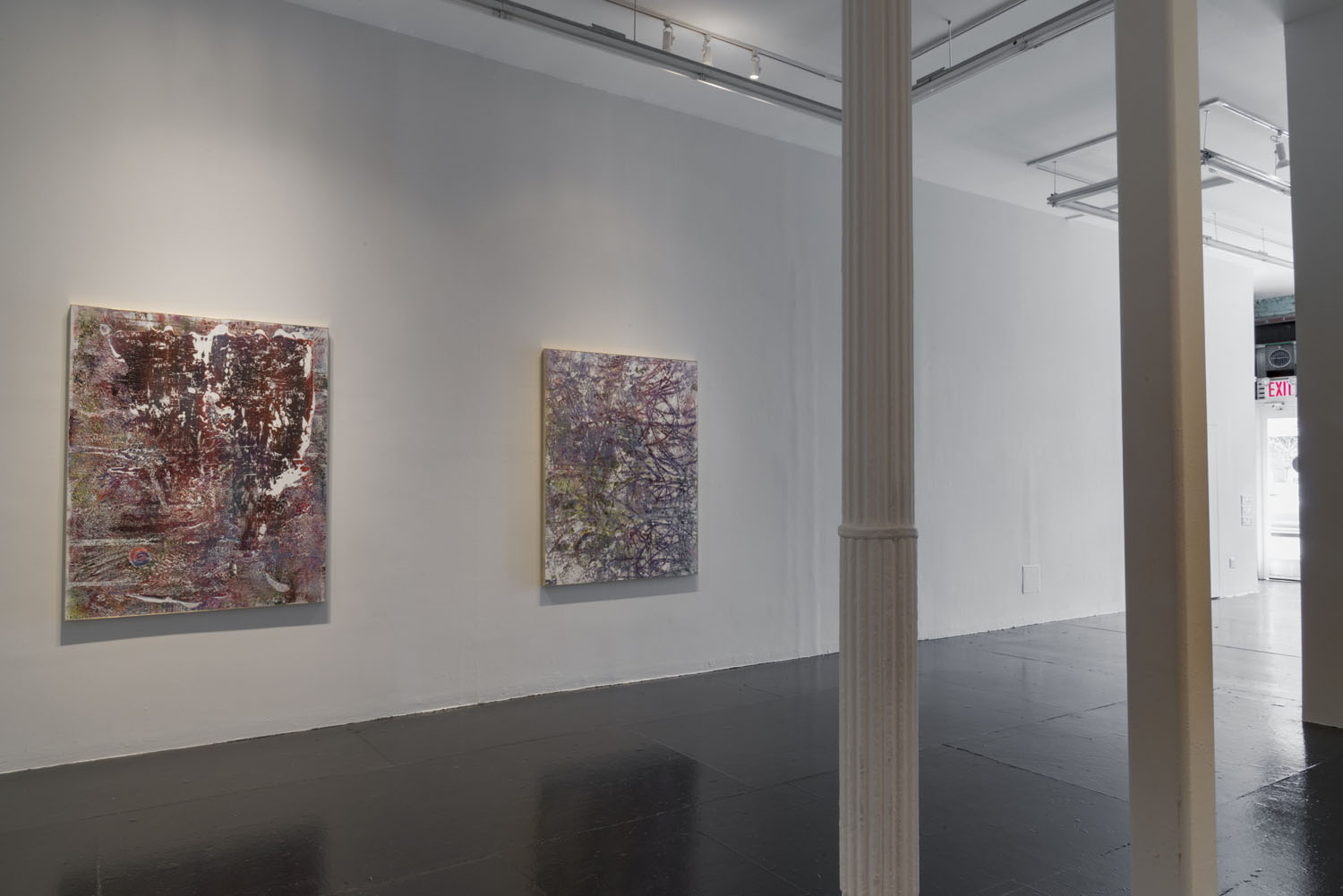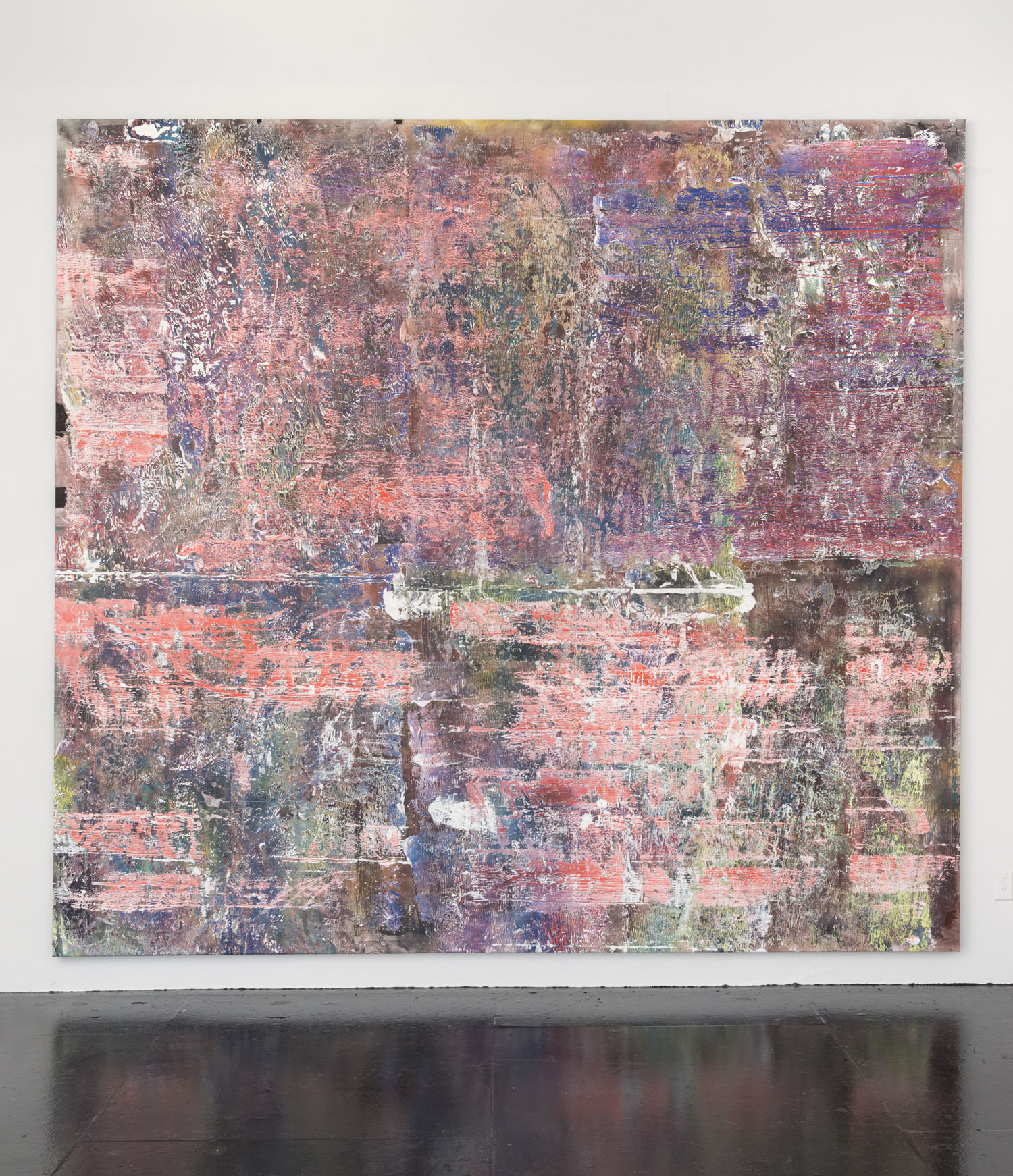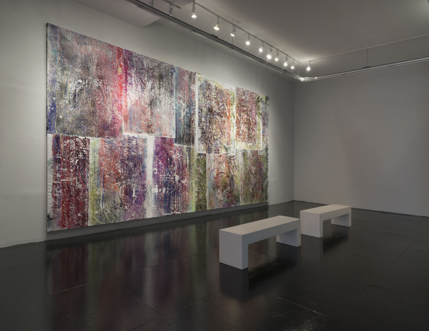 In this new show, “Structural Color”, Reihsen has again invented a new way to make an abstract painting, again making something with just paint that is mind-bogglingly not digital in any way. These works are made more like a monoprint, paint from one surface is transferred to another surface by being stuck onto plastic. Elaborate armatures and physical effort were deployed in creating these paintings, especially the twelve-foot pieces. Here with the assistance of clear matte medium, airbrush and some magical wet-on-wet acrylic behaviours, the artist has again innovated within the medium.